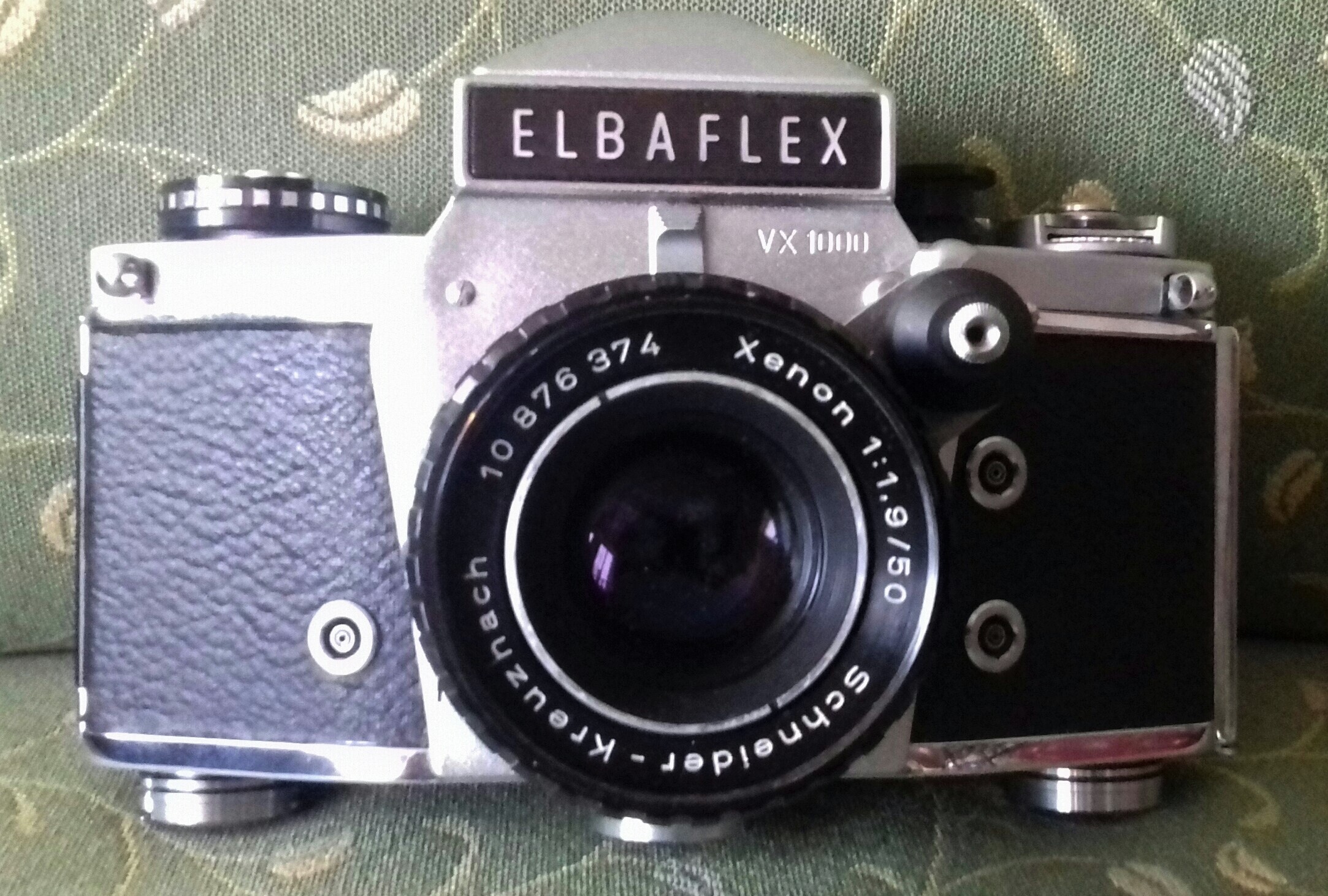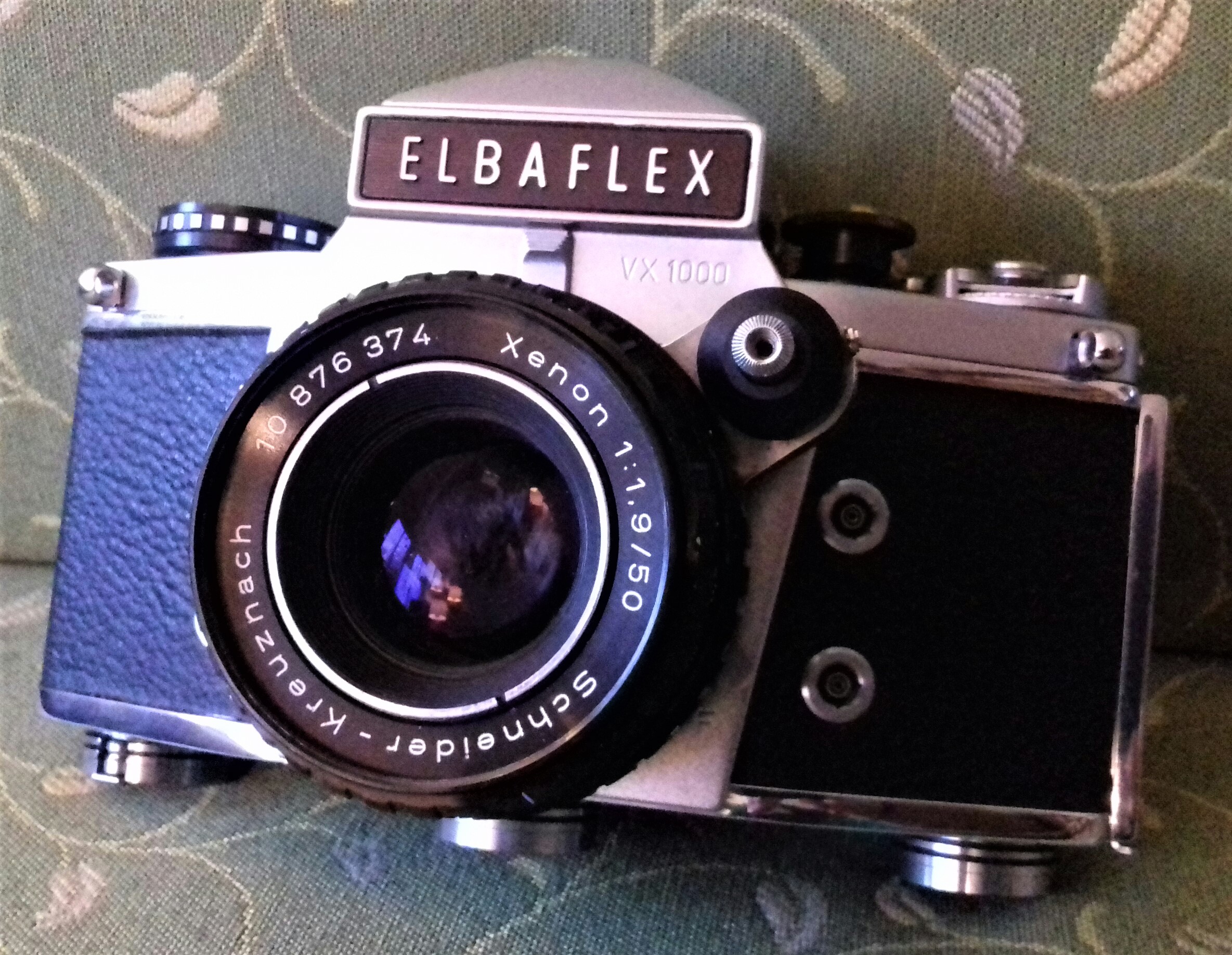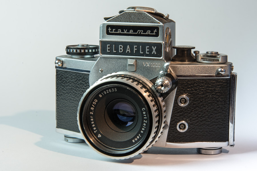 „Elbaflex“ war der Name der in Westdeutschland verkauften Dresdner „Exakta Varex 1000“. Das hatte (wieder mal) markenrechtliche Gründe. Dieses Modell wurde 1969/70 hergestellt. Auf meinem Modell ist auf der Oberseite „Ihagee Dresden“ eingraviert und auf der Vorderseite „VX 1000“. Es ist mit einem lichtstarken „Xenon“-Objektiv von Schneider (Kreuznach) ausgestattet (1:1,9 / 50). Meine „Elbaflex“ hat außerdem ein Sucherprisma (mit Zubehörschuh).