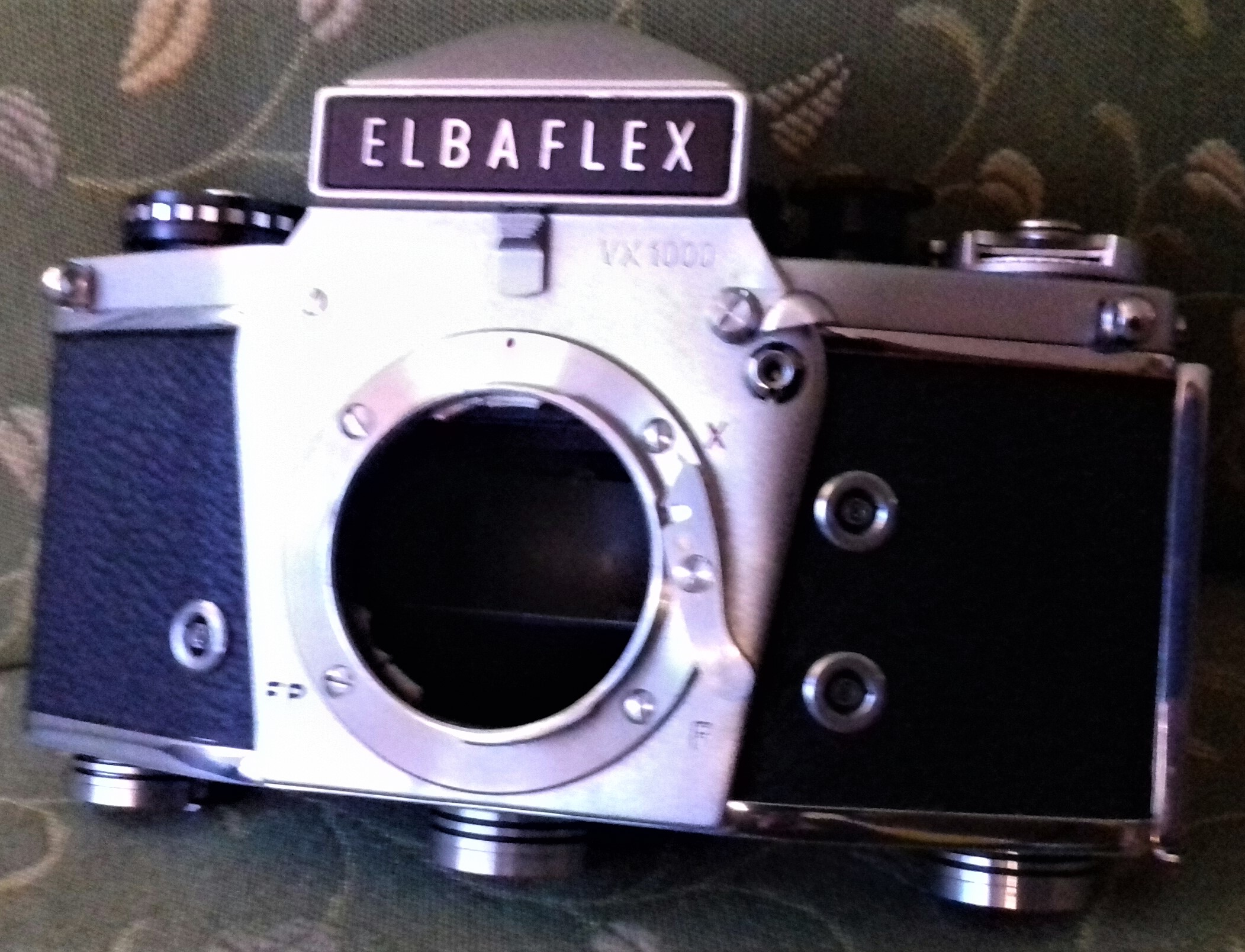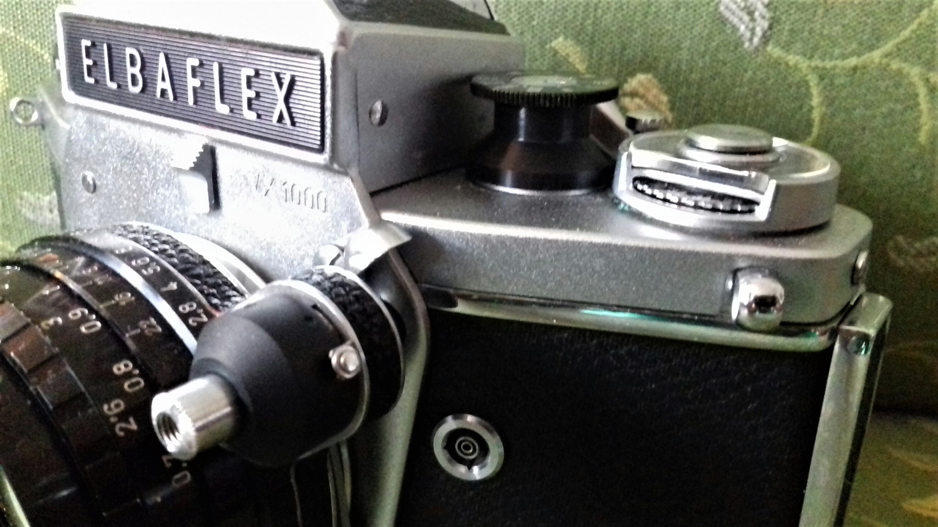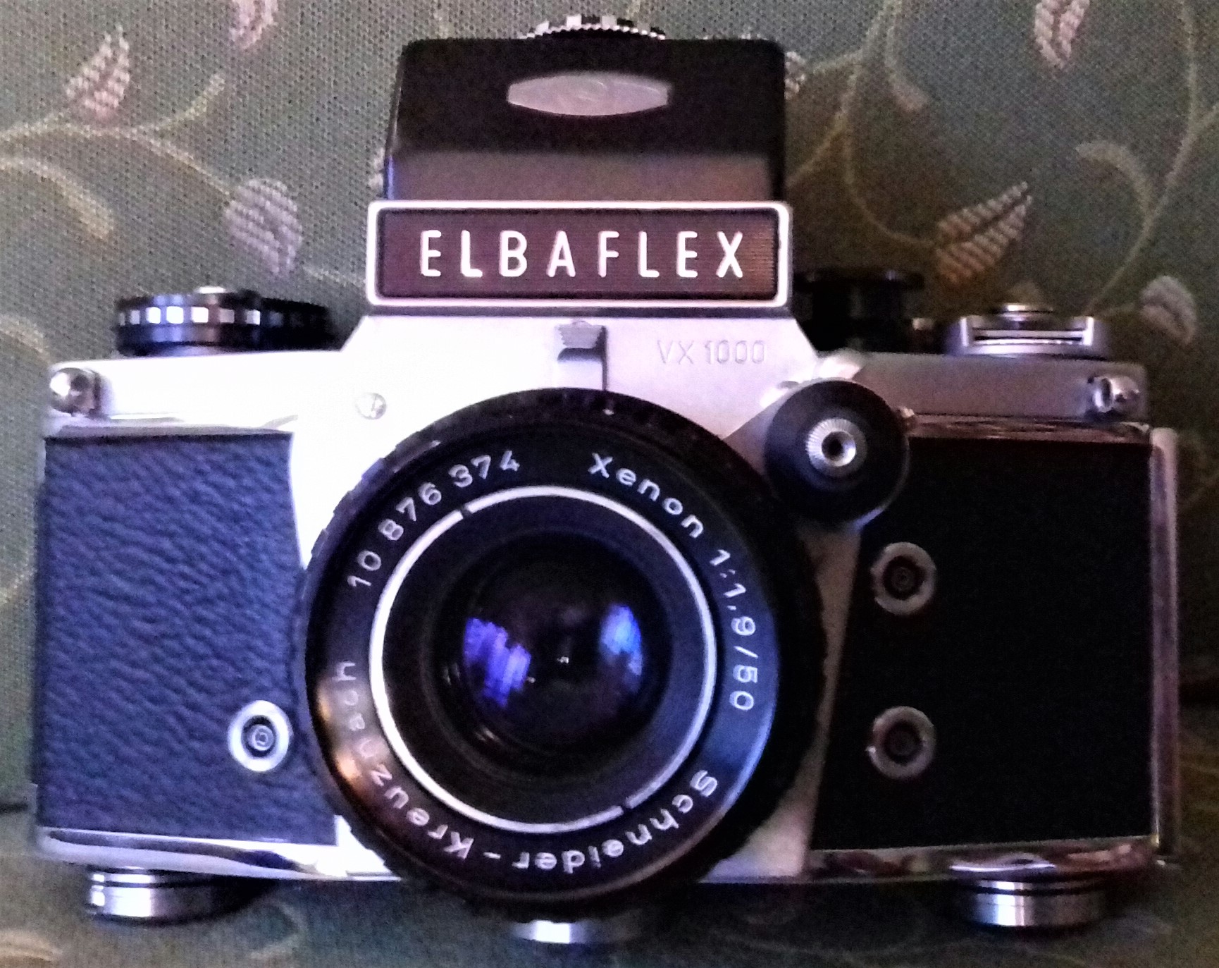 „Elbaflex“ war der Name der in Westdeutschland verkauften Dresdner „Exakta Varex 1000“. Das hatte (wieder mal) markenrechtliche Gründe. Dieses Modell wurde 1969/70 hergestellt. Auf meinem Modell ist auf der Oberseite „Ihagee Dresden“ eingraviert und auf der Vorderseite „VX 1000“. Es ist mit einem lichtstarken „Xenon“-Objektiv von Schneider (Kreuznach) ausgestattet (1:1,9 / 50). Meine „Elbaflex“ hat außerdem ein Sucherprisma (mit Zubehörschuh).