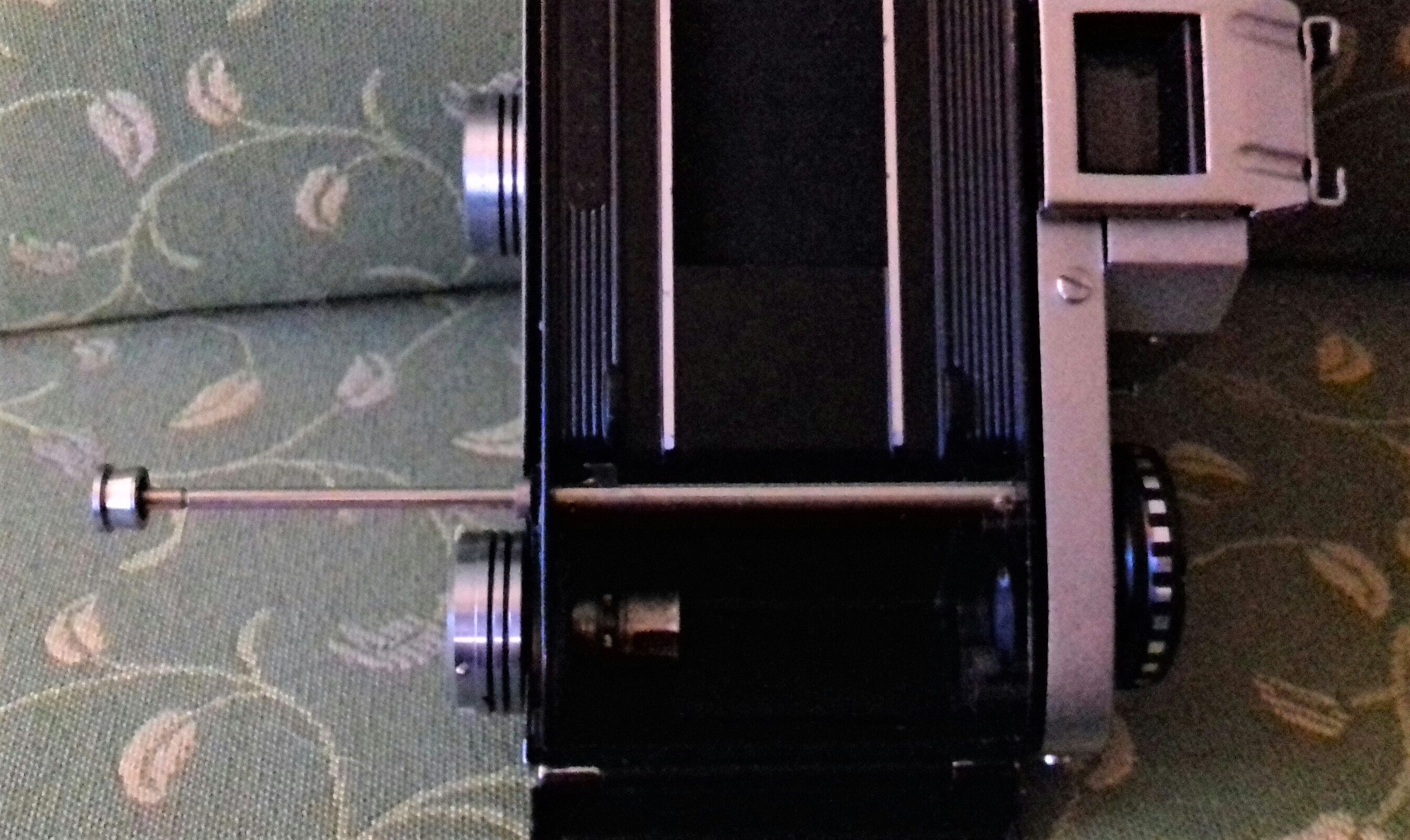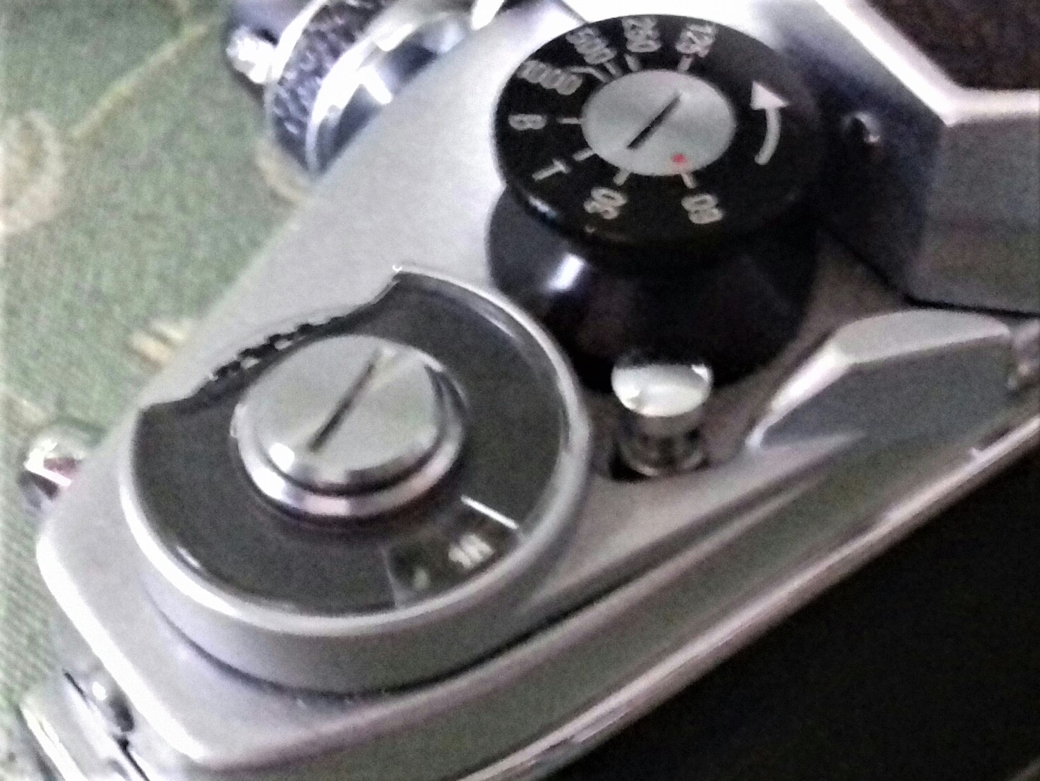 - Sie hat das wohl komplizierteste Hemm- bzw. Vorlaufwerk, das ich kenne. Bei allen Zeiten länger als 1/8 Sekunde muss man vollautomatische Objektive zunächst auf Normalblende einstellen, d. h. die Automatik abstellen. Dann spannt man den Verschluss und stellt den regulären Zeitenknopf links auf B oder T. Als Nächstes zieht man durch Drehen des zweiten, großen Zeitenrades rechts im Uhrzeigersinn das Zeitregulierwerk auf. Jetzt hebt man den äußeren Ring des Rades an und dreht ihn, bis der gelbe Punkt der gewünschten schwarzen Belichtungszeit, z. B. 1/2 Sekunde, gegenübersteht. Beim Auslösen der Kamera schnurrt jetzt das Vorlaufwerk unter Mitdrehen des großen Zeitenrades summend ab. Will man zusätzlich den Selbstauslöser nutzen und das Vorlaufwerk einstellen, muss man alles genauso machen, nur stellt man den gelben Punkt des äußeren Ringes jetzt auf eine rote Belichtungszeit, z. B. 6 Sekunden, ein, betätigt den Auslöser, das Vorlaufwerk schnurrt ab, und nach 12 Sekunden öffnet sich der Verschluss. Wenn es um kürzere Belichtungszeiten geht, reicht das Aufziehen des Vorlaufwerkes durch Drehen des Rades bis zum Anschlag, allerdings muss man auch dann daran denken, am Objektiv die Blendenautomatik abzustellen. Das alles muss man ein paar Mal üben, bis man es sicher beherrscht (da lobe ich mir doch die quasi selbsterklärenden Pentacon- und Wirgin-Selbstauslöser). Die Kamera ist also etwas für Mechanik-Enthusiasten, und in dieser Hinsicht sicher ein Wunderwerk an Präzision. Bedienkomfort stand aber offenbar nicht im Fokus ihrer Ingenieure. So ist z. B. auch der wuchtige Auslösestift beim Einstellen des Fokusrings des Objektivs immer irgendwie im Weg.