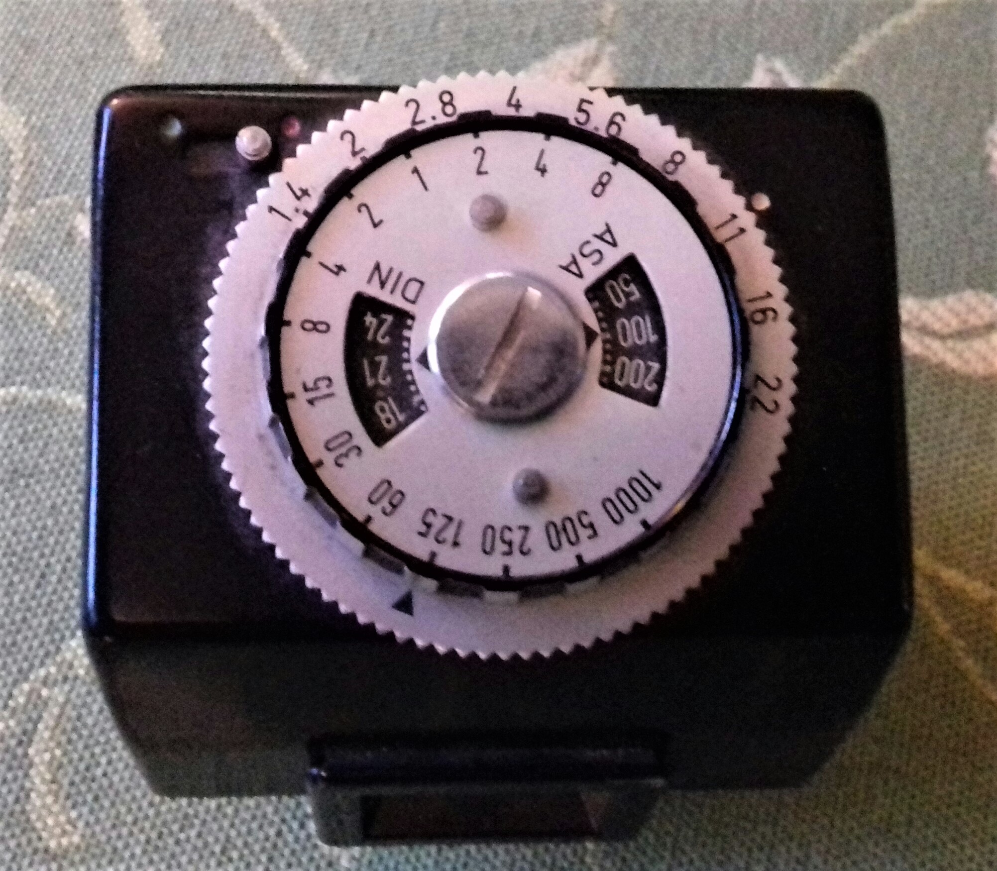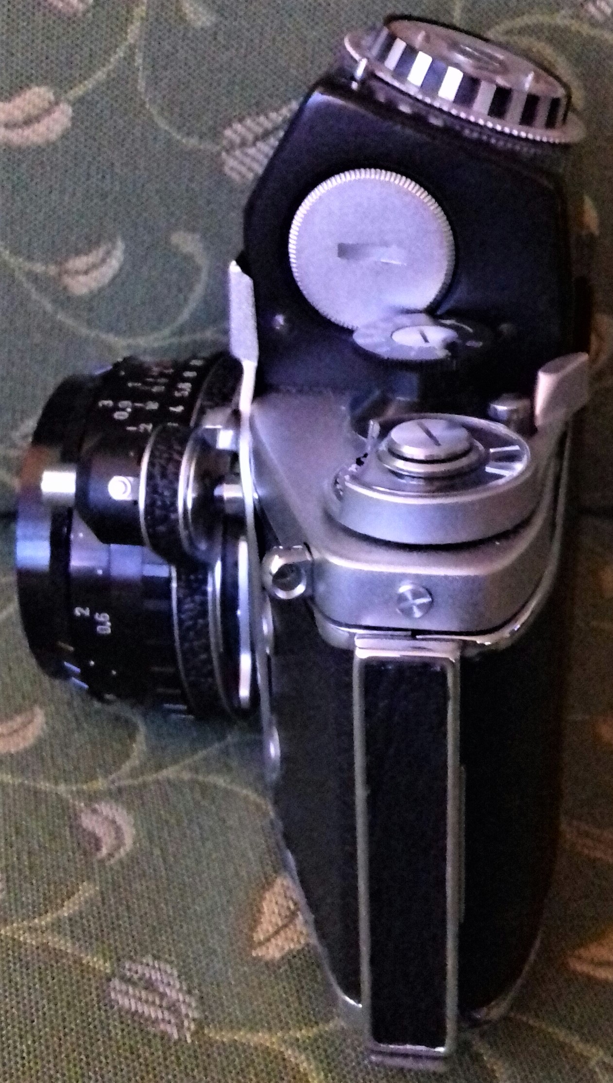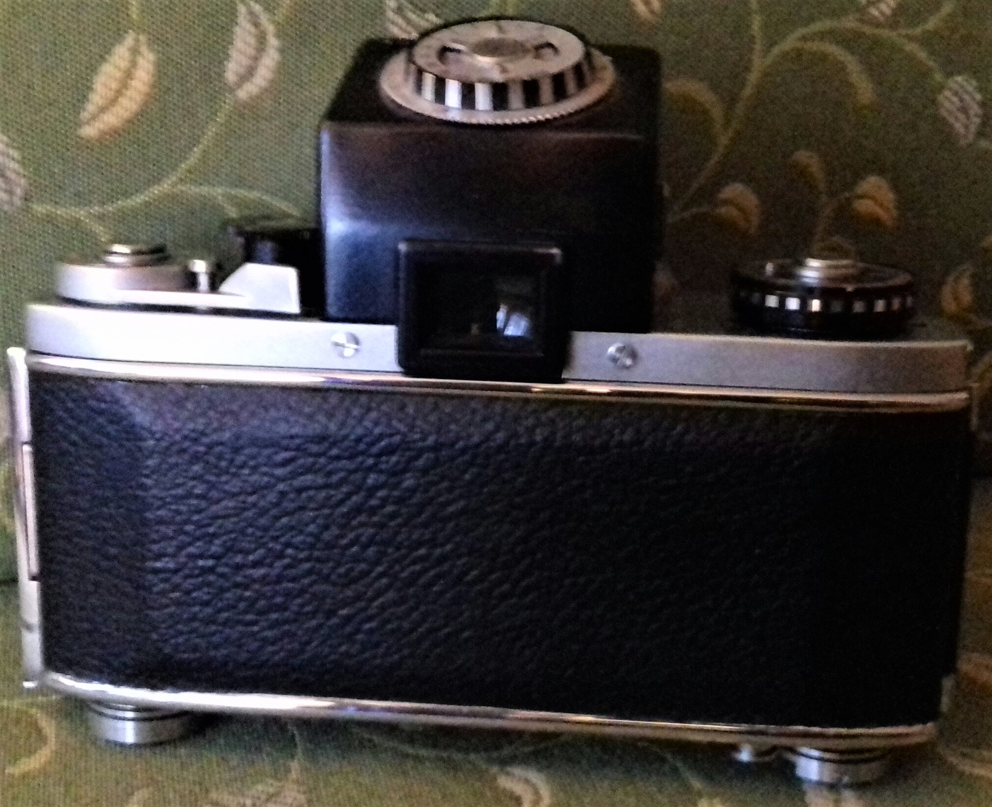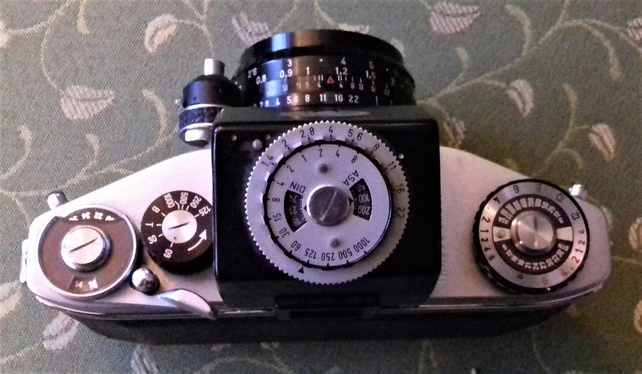Zu meinem Modell habe ich noch ein TTL-Messprisma „Examat“ der Firma Harwix (Berlin) mit CdS-Fotowiderstand (ohne Messkeil). Ursprünglich musste als Stromquelle eine (heute nicht mehr erhältliche) „Mallory PX 13“ eingelegt werden. Es geht (ungeachtet der Spannungsproblematik) auch mit einer „625 PX“ oder einer „LR 44“ (dann allerdings nur mit Adapter). Ein Zeiger im Sucher zeigt durch mittige Position dann die richtige Zeit/Blenden-Kombination an. Insgesamt eine ziemlich klobige Kombination. Ich muss gestehen, dass ich da doch lieber mit dem Handbelichtungsmesser arbeite.