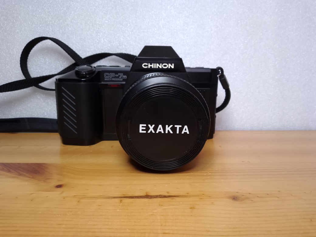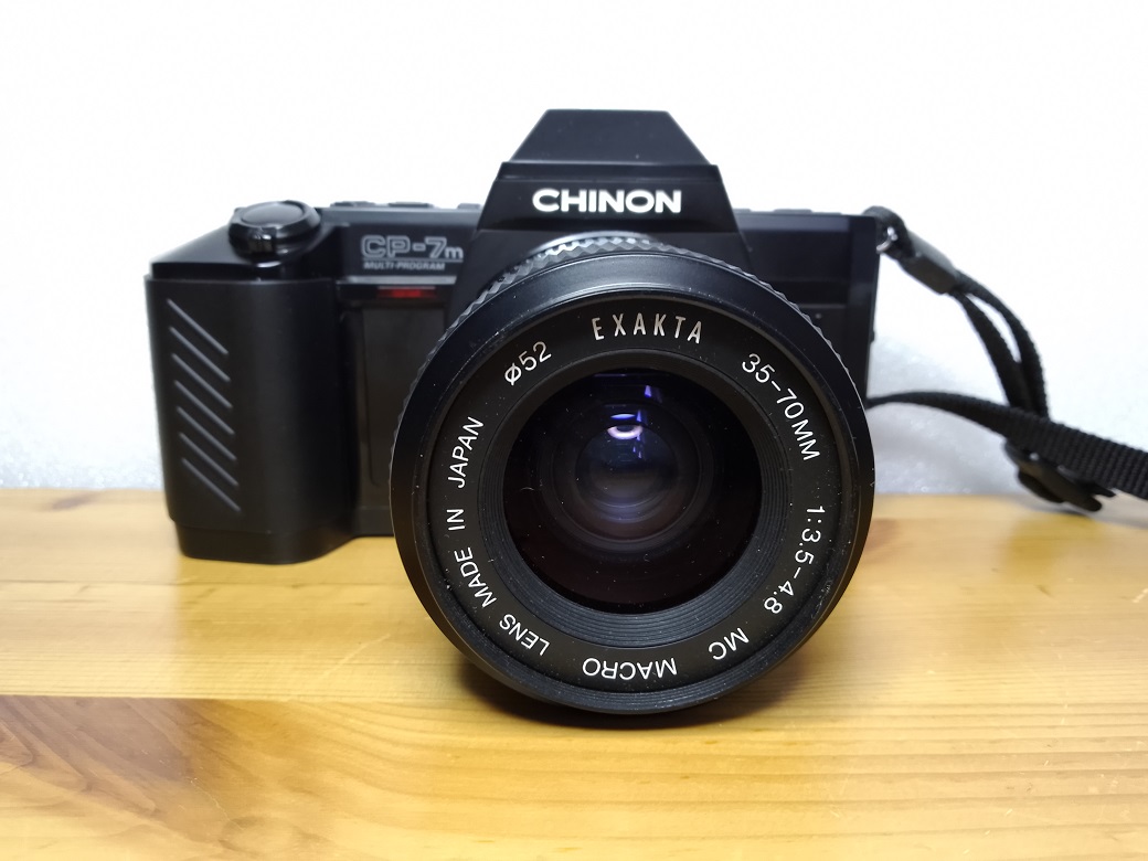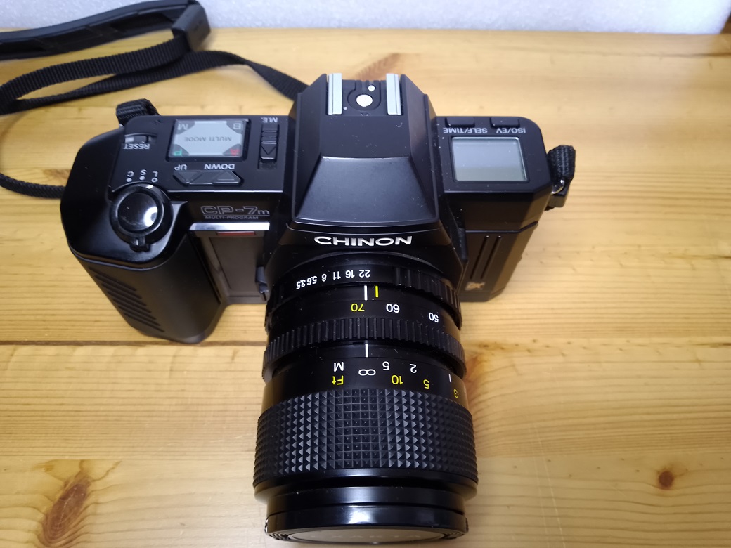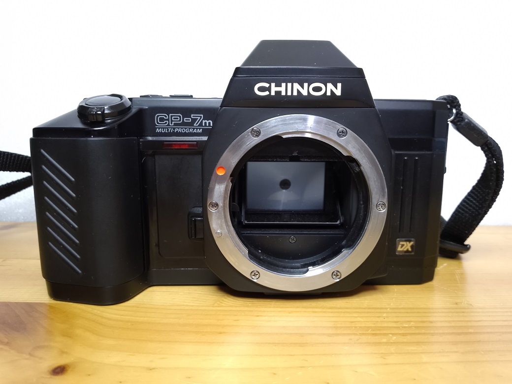 Hersteller: Chinon, Japan Modell: CP-7m Multiprogram Baujahr: 1986 Typ: KB-SLR, 24x36 mm, mit Programmautomatik, automatischer und manueller Belichtungssteuerung, TTL-Belichtungsmessung und automatischem Filmtransport, Einzelbild oder Serienschaltung bis 2,5 Bilder/sec Verschluß: elektronischer Schlitzverschluß, 15 - 1/2000 sec, Langzeitbelichtung bis 90 Minuten möglich Blenden: je nach Objektiv Fokussierung: manuell Seriennummer: 493162 Filmempfindlichkeit: 25 - 5000 ISO, über DX-Kontakt oder manuell einstellbar