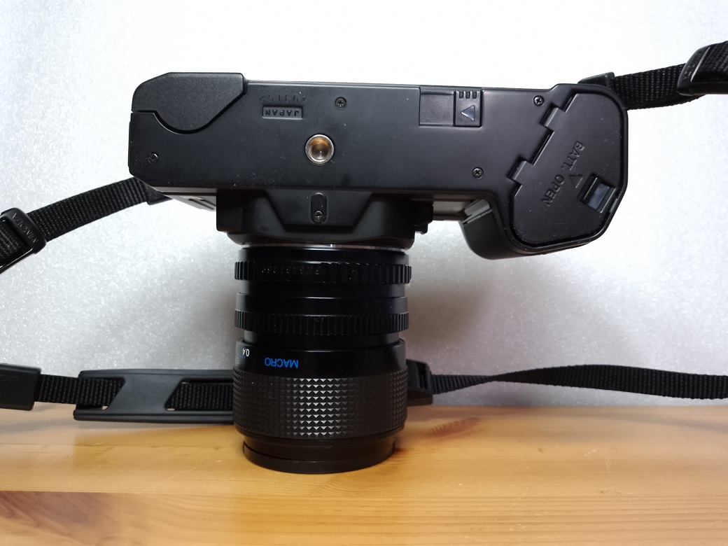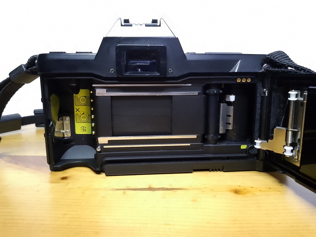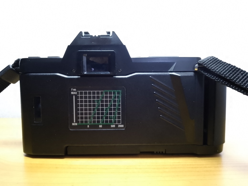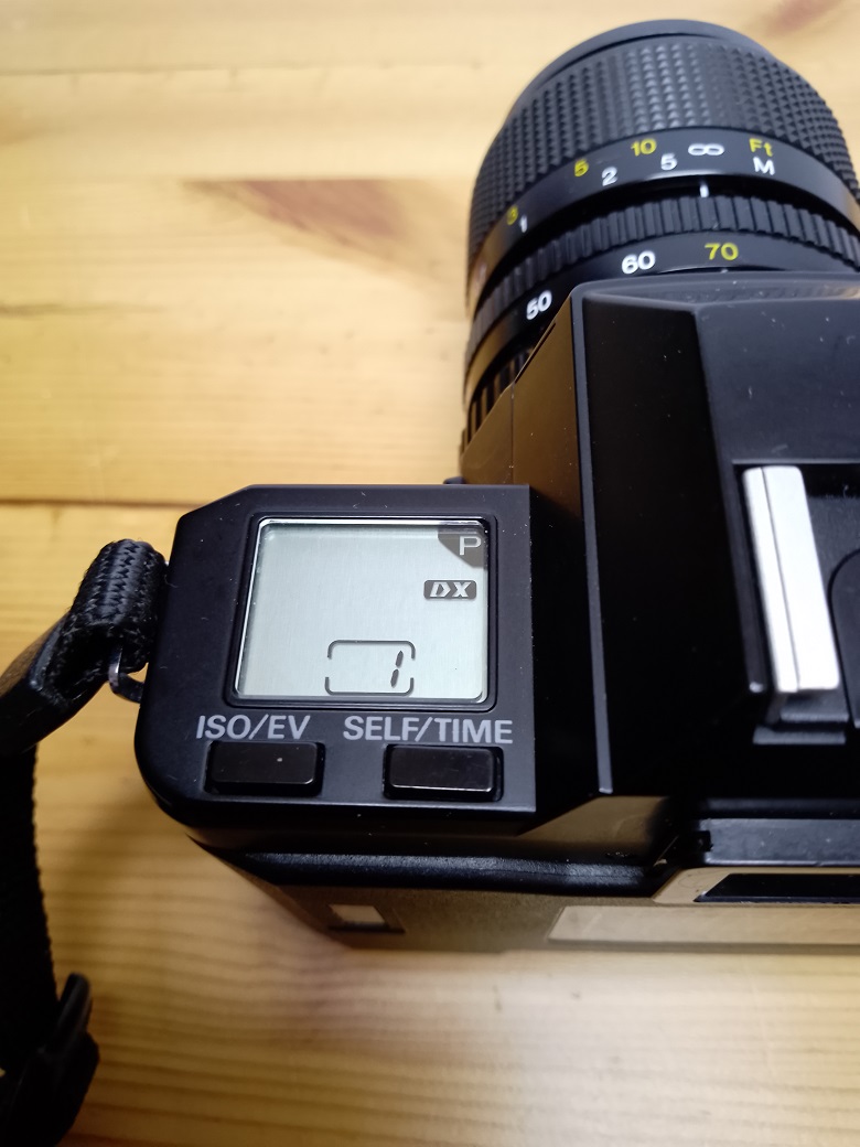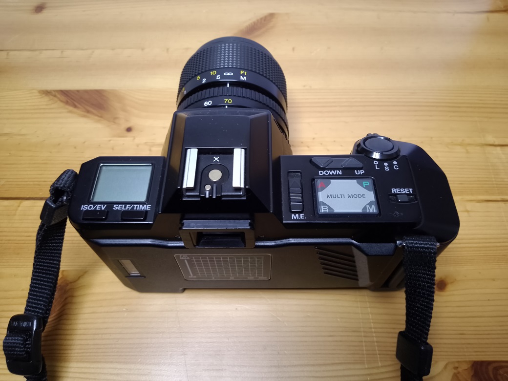 Beim ersten Blick auf die Kamera fällt sofort das Fehlen eines Schnellspannhebels auf. Der Transport des Filmes wird bei dieser Kamera über einen eingebauten Winder besorgt. Daher kann am Wahlschalter neben "S(ingle)" (Einzelbild) auch "C(ontinuous)" (Serienaufnahme) mit bis zu 2,5 Bildern/sec eingestellt werden. Es sind auch Intervallaufnahmen mit bis 90 Minuten Abstand möglich. Die Stromversorgung erfolgt entweder über 4 AA 1,5 Volt Batterien oder eine 6 Volt 2CR5. Das Laden der Kamera erfolgt ebenfalls über den Winder. Dazu ist der Filmanfang bis zur gelben Markierung in der Kamera herauszuziehen und danach die Rückwand zu schließen. Der Film wird automaisch bis zum ersten Bild vorgespult. Die Filmempfindlichkeit ( 25 - 5000 ISO) wird von der Kamera über DX-Kontake ermittelt. Ist keine DX-Kodierung auf den Filmpatronen vorhanden kann die Filmempfindlichkeit (ebenfalls 25 - 5000 ISO) manuell eingestellt werden.