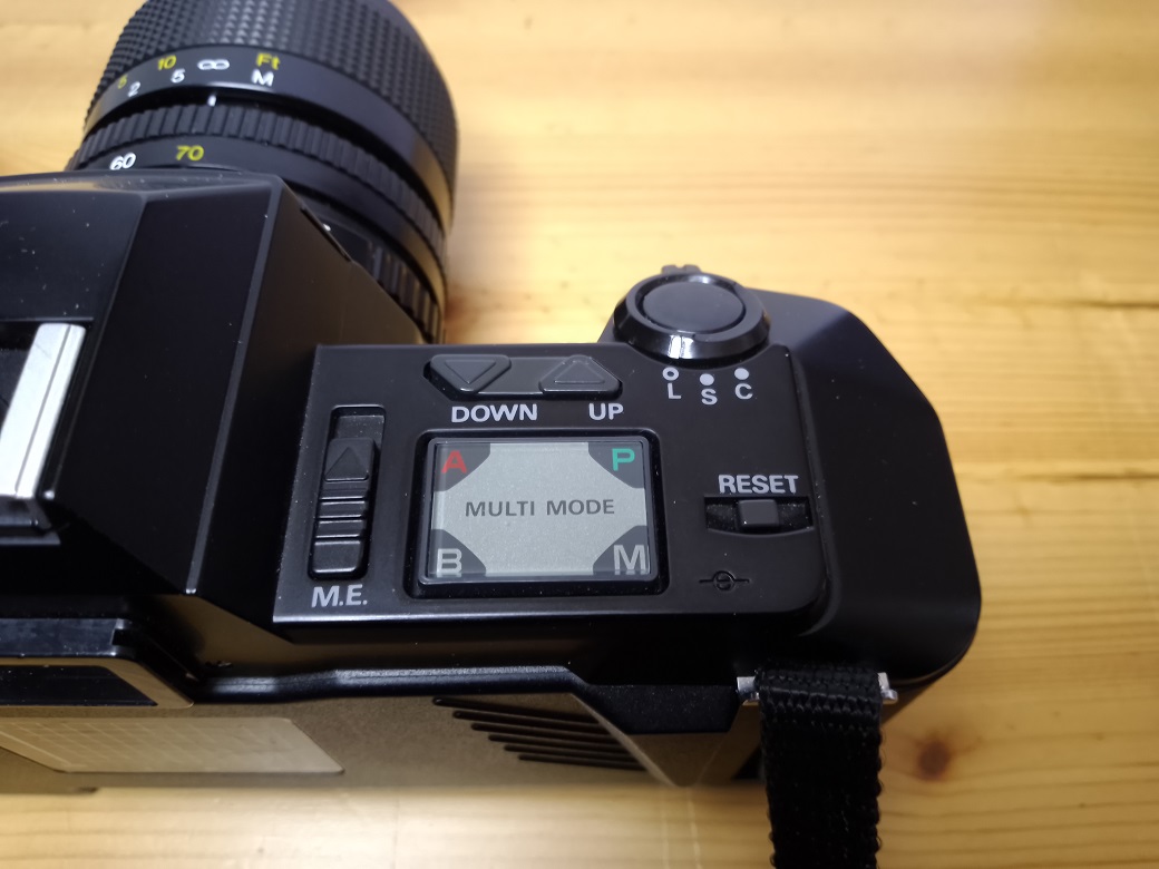 Oberseite: Display, manuelle Einstellung für die Filmempfindlichkeit, Selbstauslöser / Intervall Einstellung, Blitzschuh mit Mittenkontakt, Schiebeschalter für Mehrfachbelichtungen (Multi Exposure "M.E"), Betriebsmoduswahlschalter, manuelle Einstellung der Verschlußzeiten, Reset für gewählte Modus, Hauptschalter 0, S, C mit Auslöser,