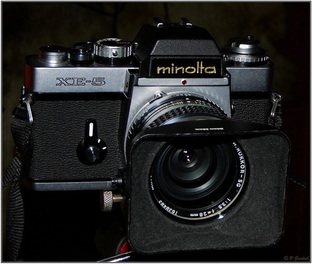 Soweit Minoltas Angaben. Aber ich gehöre ja nicht zu den Leuten, die immer nur an Daten orientiert kaufen. Meistens jedenfalls zählt bei mir das rein subjektive Empfinden. Das Gefühl, wenn man das Gerät tatsächlich in der Hand hält. Wenn man durch den Sucher schaut und damit herumspielt. Und so war es auch bei dieser Kamera. Sie fühlt sich schwer und zuverlässig an - obwohl der Eindruck auch täuschen kann. Ernst Giger z.b. berichtet auf seiner Internetseite von einigen Problemen, die er damit hatte. Bislang ging bei mir aber alles gut, wenn man mal davon absieht, dass bei einigen Bildern beim ersten Testdurchlauf vor rund einem Jahr - als ich sie gerade frisch erworben hatte - die Blende länger geöffnet blieb, als eingestellt. Das hat sich aber bereits beim zweiten Film völlig gegeben. Ich könnte mir denken, dass dies an einer längeren Zeit der Nicht-Betätigung lag. Mitte der siebziger Jahre wurde die XE-5 auf den Markt gebracht und zwei Jahre später wurde die Produktion wieder eingestellt. Ist es eine gute Kamera? Kommt darauf an, was man will und ob man ein gut erhaltenes Modell erwischt. Ich mag sie jedenfalls und hab sie oft in den Händen. Mit und ohne Film. Gruß Peter