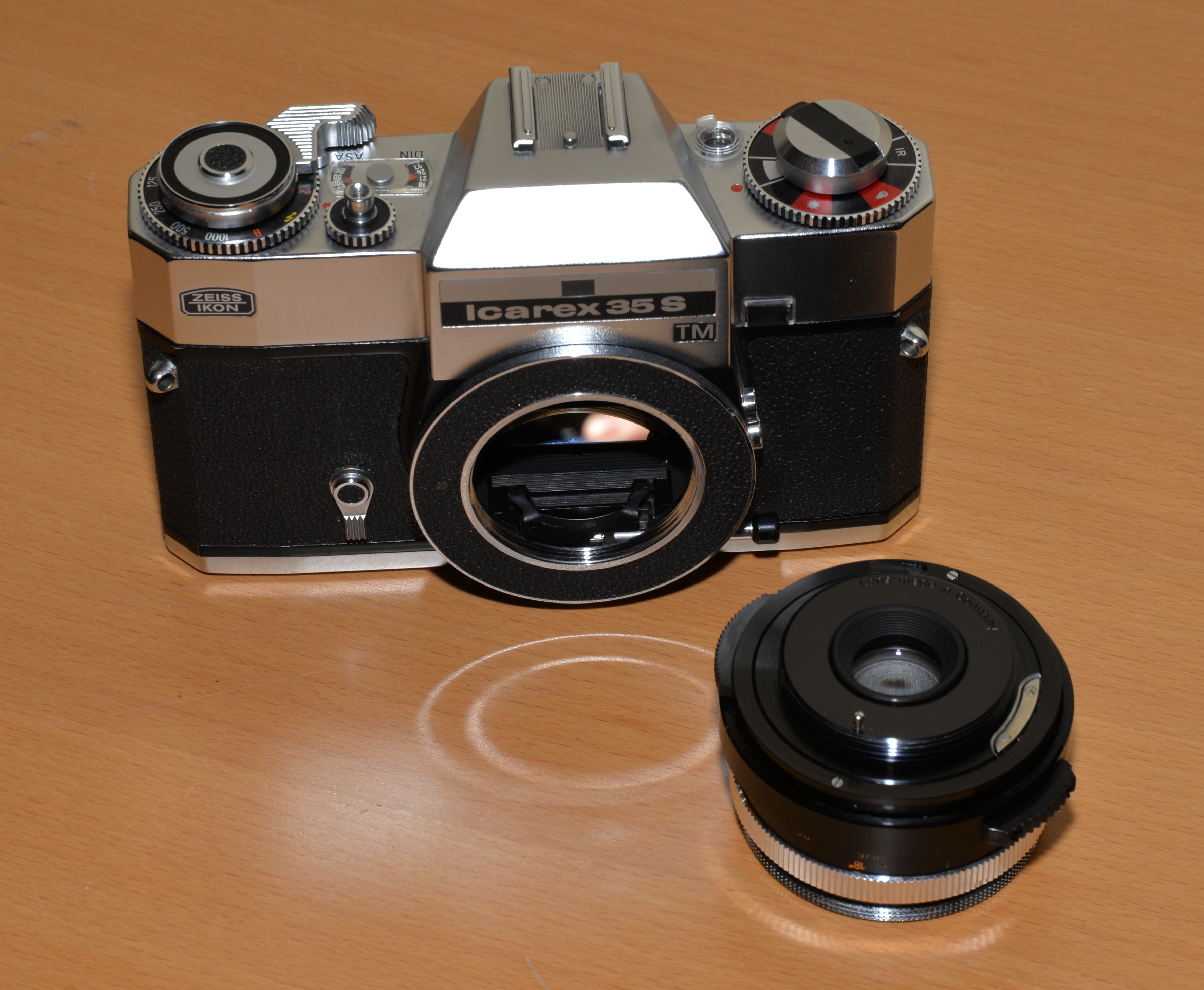 Modell: Zeiss-Ikon Icarex 35 S Baujahr ca. 1968 Typ: Einäugige Spiegelreflexkamera für Kleinbildfilm Horizontal ablaufender Gummituch Schlitzverschluss Zeiten: 1/2s - 1/1000s + B + Blitzzeit Zwei Blitzanschlüsse (Birnen und Elektroblitzer) Synchronzeit ca 1/30s CdS Belichtungsmesser (Arbeitsblendenmessung über separaten Taster) Selbstauslöser Voll wechselbare Objektive über M 42 Schraubgewinde Filmsortenwähler von DIN 12 bis DIN 800 Stativgewinde Batterie PX 625 (mittlerweile verboten, es gibt aber Adapter die die 1,35Volt sicherstellen) Okularverschluss