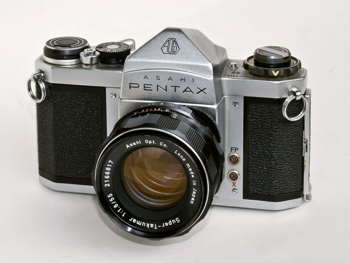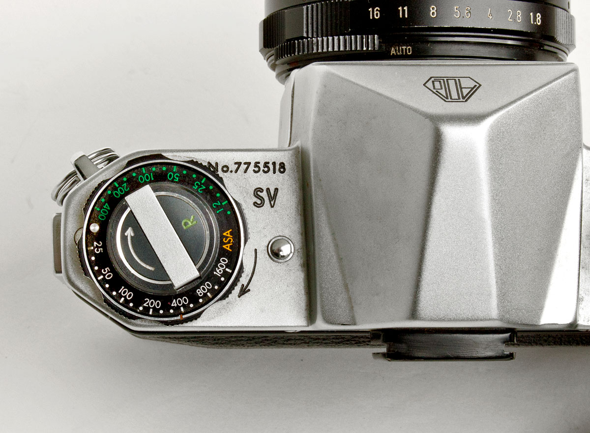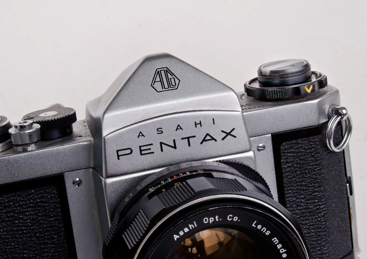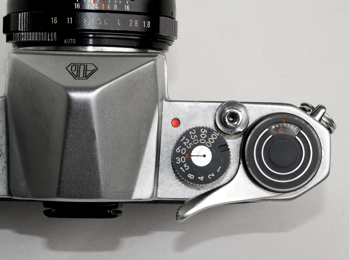 Auf dem Prismengehäuse ist noch das alte Asahi Logo eingraviert: AOCo - Asahi Optical Co. Das gelbe "V" auf dem Ring unter der Rückspulkurbel ist die Markierung des Selbstauslösers.