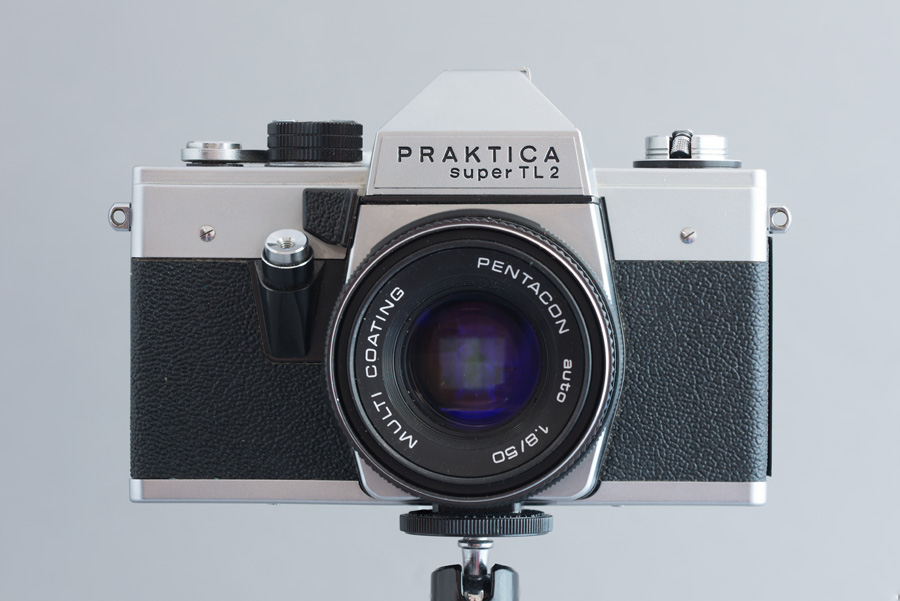 Die Praktica super TL 2 . Eine der zahlreichen Prakticamodelle der 70iger Jahre. Etwas abgespeckte Variante der Praktica LTL. Zunächst als Praktica TL gebaut, dann von super TL2 abgelöst. Es fehlen im Vergleich zur LTL die 1/1000 s Verschlußzeit und der Selbstauslöser. Die Leuchtfelder der LTL in der Belichtungsmesseranzeige wurden durch einen Meßzeiger ersetzt. Auch diese Kamera wurde mit verschiedenen Objektiven ( Meyer-Optik Domiplan, Zeiss Tessar oder Pentacon ) ausgeliefert.