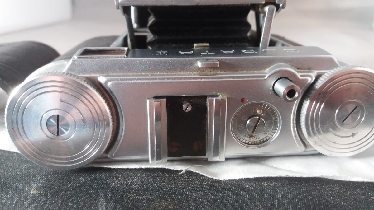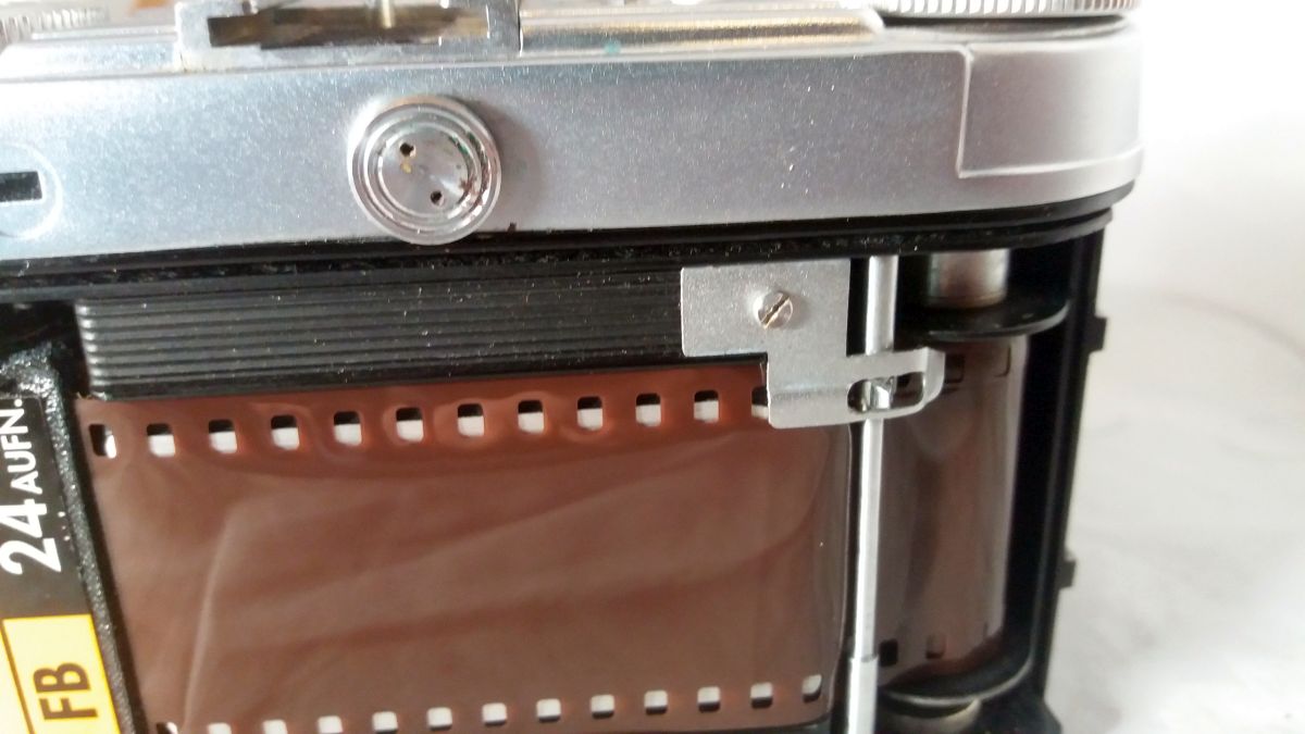 Irgendwo habe ich die Situation noch nicht wirklich verstanden. Was passiert, wenn Du die Rückwand aufmachst, den Film so drin lässt, wie er gerade ist, und ein paar Bilder von dem eingelegten Film für uns machst? Ich hatte mir vorgestellt, daß Du noch keine Aufnahmen gemacht hast und den Film höchstens ein paar Aufnahmen weiter gedreht hattest, sodass auch noch eine Menge von dem Film in der Kassette ist, um Probeaufnahmen zu machen? Im DM Markt kosten 3 Filme "Kodak Gold 36 Aufnahmen" 7.95 Euro zusammen, das kann also nicht Dein Hinderungsgrund sein? Dann würdest Du (und wir) wissen, ob der Film ungefähr richtig eingelegt ist, ob er das Stachelrad antreibt oder gar über statt durch die Führung läuft, ob er richtig in der aufnehmenden Spule sitzt und auch vorgerückt wurde usw. Das ist billiger, als einer sehr seltenen und gesuchten Kamera mit einem Schraubenzieher auf den Pelz zu rücken. Und ich habe keine Ahnung, was das für ein von mir oben hinterfragter Knopf neben dem Suchereinblick ist. Du könntest probieren, ob er in irgend einer Richtung verschiebbar ist und das Bildzählwerk bzw. die Sperrklinken (so vorhanden) des Stachelrades ausrückt, so dass man den Film zurückspulen kann.