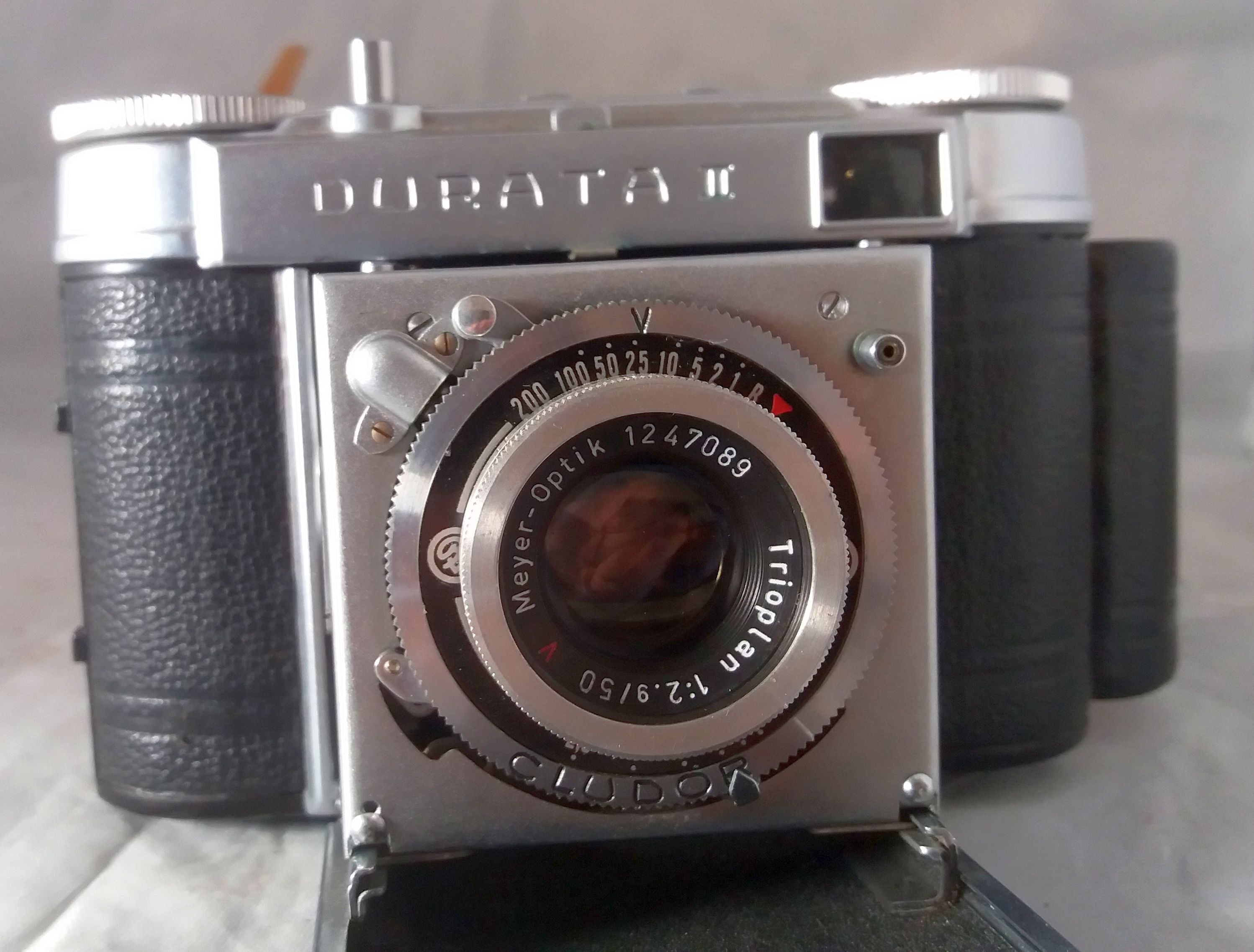 Eine Alternative für die Rückspulung (aber bitte erst den Film richtig einlegen) wäre, auszuprobieren, ob diese Anleitung auch für Deine Durata gilt: "After taking 20, 24 or 36 photographs, the film has to be rolled back to the cartridge. The back of the camera remains close during this operation. Pull the film winder knob out of approximately 1»2 cm and lock it with turning it to the opposite direction of the arrow. Now rotate the film rewind knob in the direction of the arrow until the counter disc stops". Dann wäre dieser ominöse Knopf neben dem Suchereinblick für irgendwas anderes da. Auch zum Einspulen ist die Anleitung auf Butkus für die "Super Dollina 2" ganz instruktiv (https://www.butkus.org/chinon/dollina/super_dollian_iii.pdf). Abbildung 4 (= Seite 5 des Scans) gilt mehr oder weniger auch für Deine Durata 2, da steht's auch, wie ich beschrieben habe: "Now turn the film winding knob (5) to the direction of the arrow until the perforated left edge of the film reaches the small film lead plate. (13)".