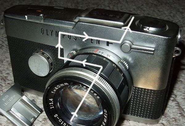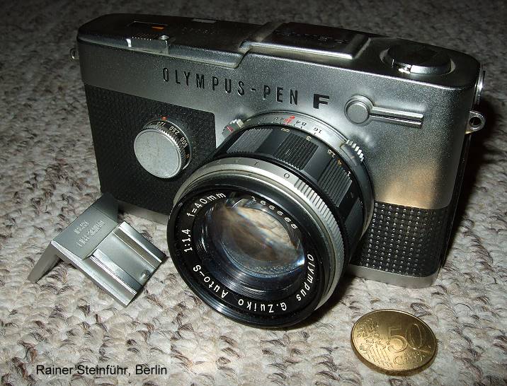 Etwas verwirrend sind die Beschriftungen auf der Kamera: Vorn "Olympus F", auf der Oberseite "PEN-FT". Ich deute das so: PEN-F ist der Hinweis auf das F - Bajonett. PEN-FT auf die Kamera selbst mit ihrem TTL-System. Darauf weist auch die Bedienungsanleitung zur Kamera hin, die ebenfalls nennt: PEN-FT.