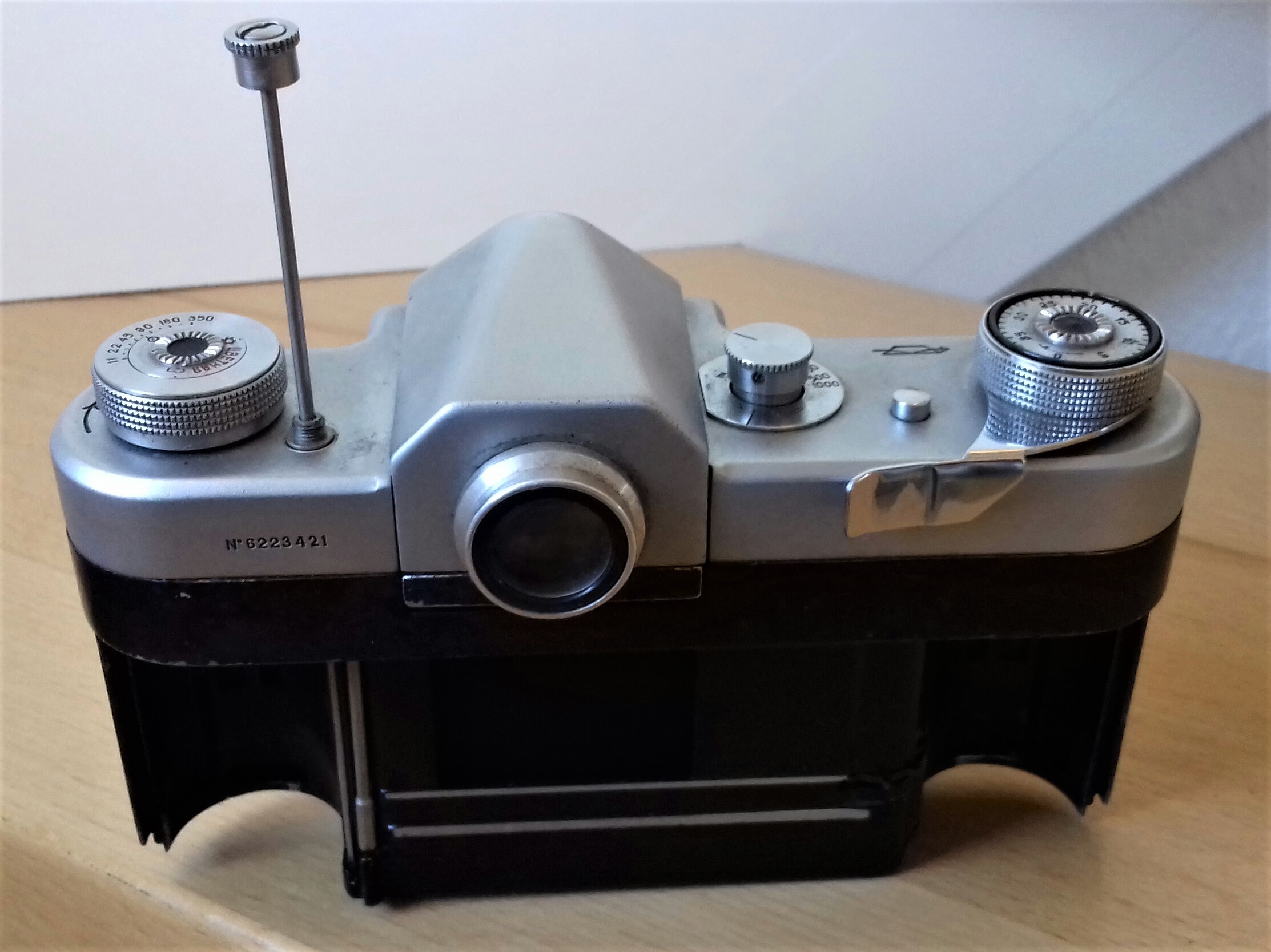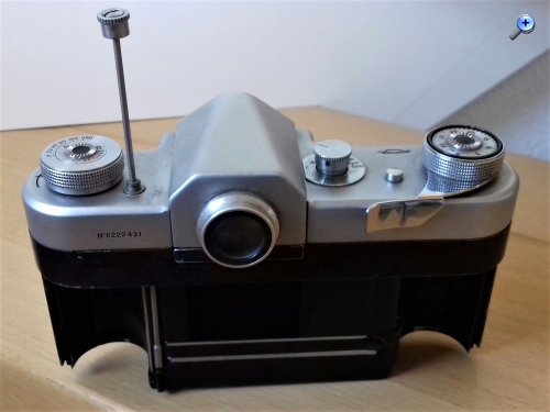 Dem Konzept einer Profikamera verdankt sich offenbar auch der ungewöhnliche Filmschneider: Mit dem Messer konnte man den Film vorzeitig kappen, wenn man keine Zeit hatte, ihn bis zu letzten Aufnahme zu verbrauchen, den belichteten Teil in die Metallpatrone ziehen, entnehmen und unverzüglich entwickeln. Auch diese Funktion werden Profis wie Journalisten, Dokumentarfotografen, Spione usw. sehr geschätzt haben.