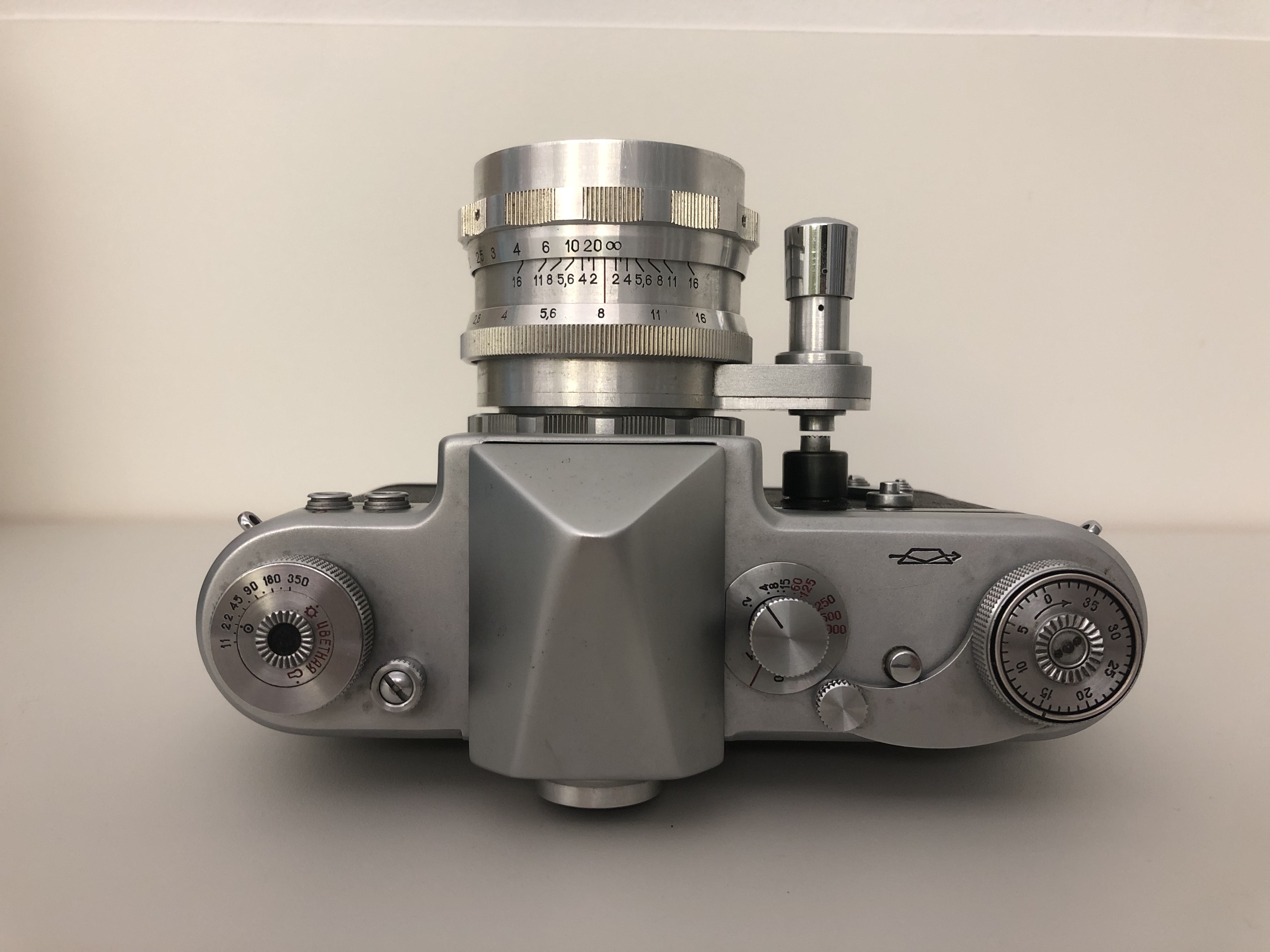 Das schwere sechslinsige „Helios“-Objektiv hat eine Springblende. Der Auslösestift kann nur halb gedrückt werden und schließt dann die Blende zur Tiefenschärfe-Kontrolle, drückt man weiter, löst die Kamera schließlich aus. Auch durch das Drehen des Stiftes kann man die eingestellte Blende fixieren. Das ist besonders bei Benutzung des Selbstauslösers wichtig, der zwar mit unglaublichem Lärm präzise abläuft, aber nicht mit der Automatikblende gekuppelt ist.