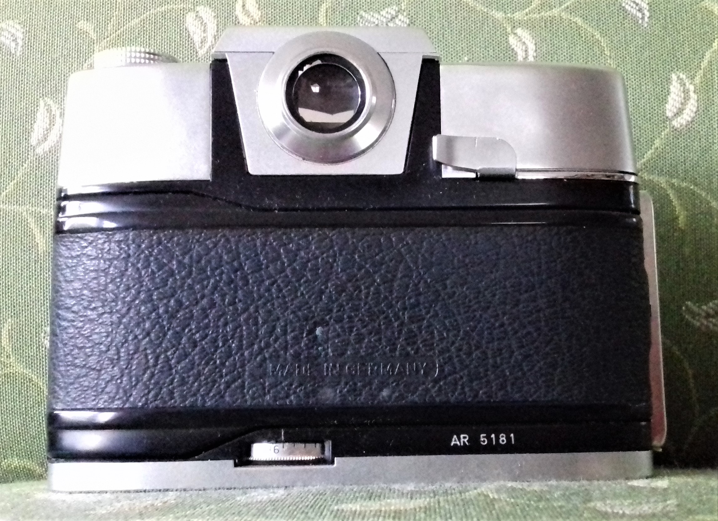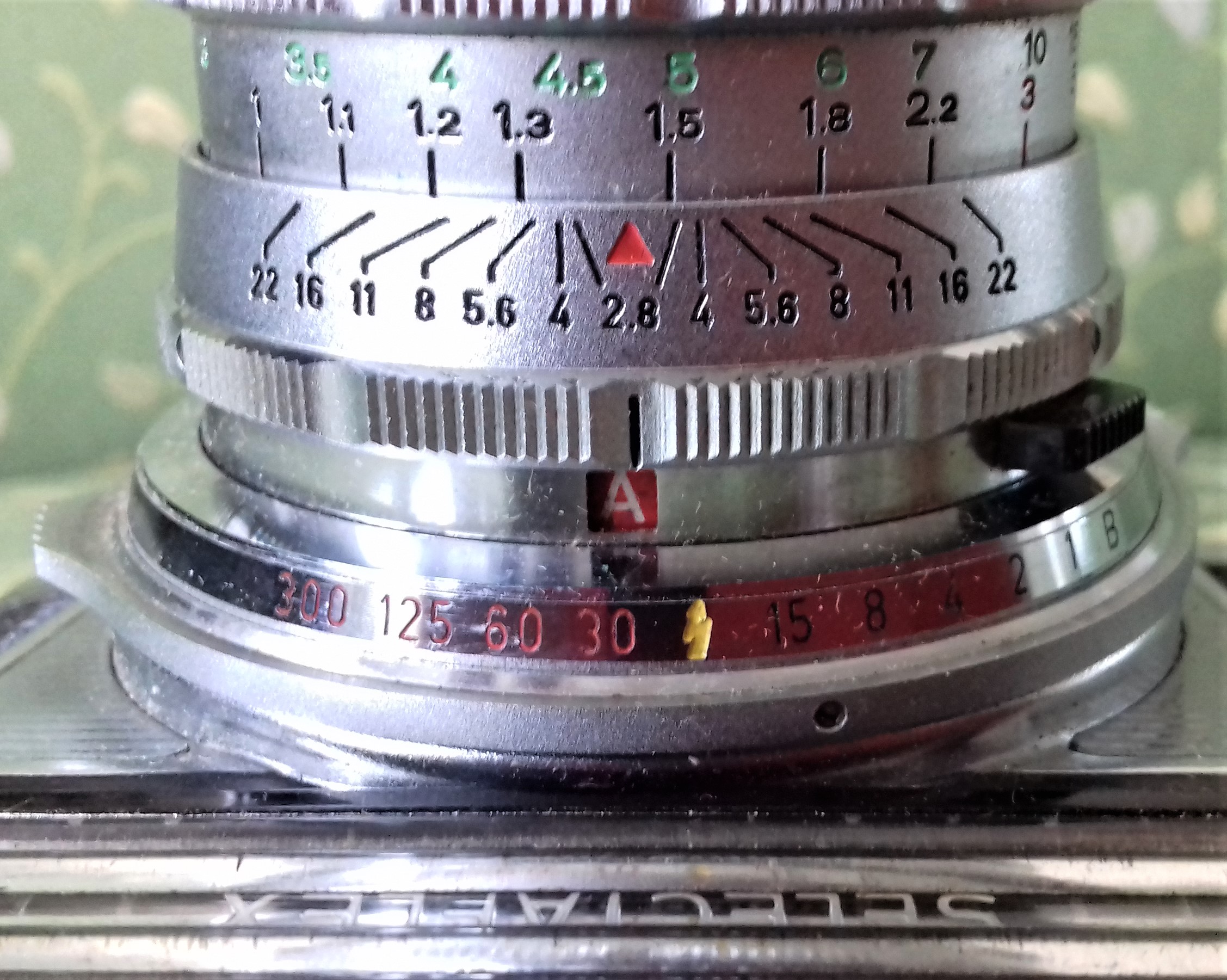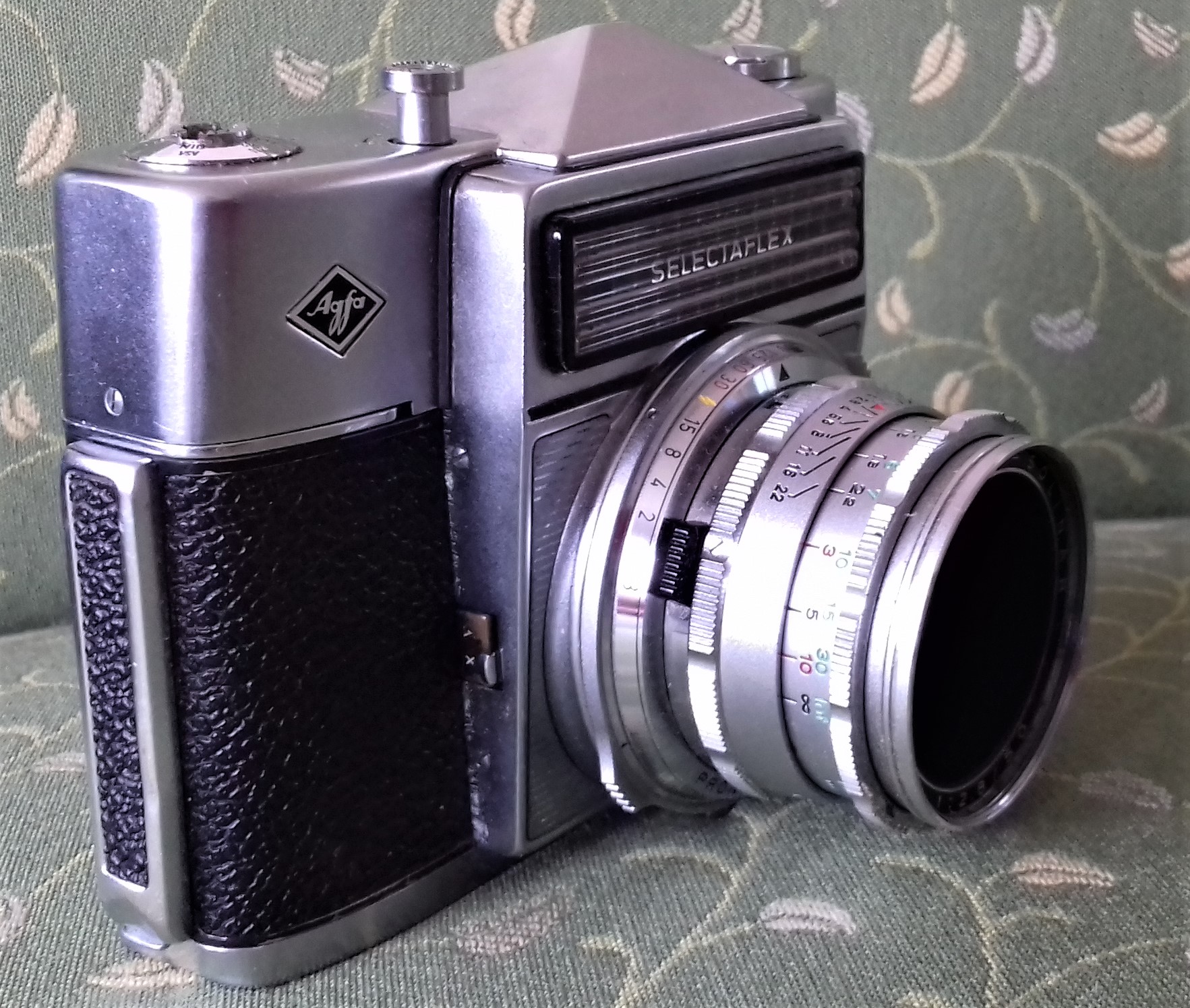 Ich trage hier noch mal Fotos zur erwähnten "Selectaflex" nach. Sie ist in vielem der "Ambiflex" sehr ähnlich, mit der Ausnahme, dass sie (optional) eine Blendenautomatik hat: Stellt man den Blendenring auf "A", wählt die Kamera selbsttätig eine zur eingestellten Belichtungszeit passende Blende aus und zeigt dies im Sucher an. Meine "Selectaflex" meldet allerdings so dubiose, d.h. unglaubwürdige Werte, dass ich ihr nicht vertraue. Vermutlich hat der Selen-Belichtungsmesser längst den Geist aufgegeben. Aber mit der manuellen Blendeneinstellung ist die Kamera glücklicherweise dennoch weiterhin benutzbar.