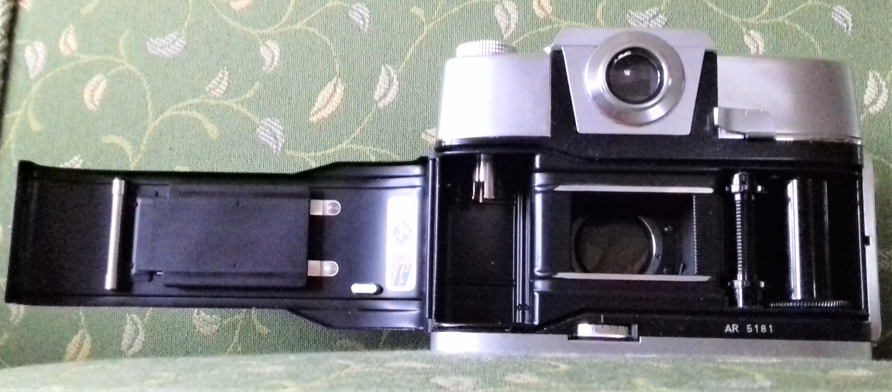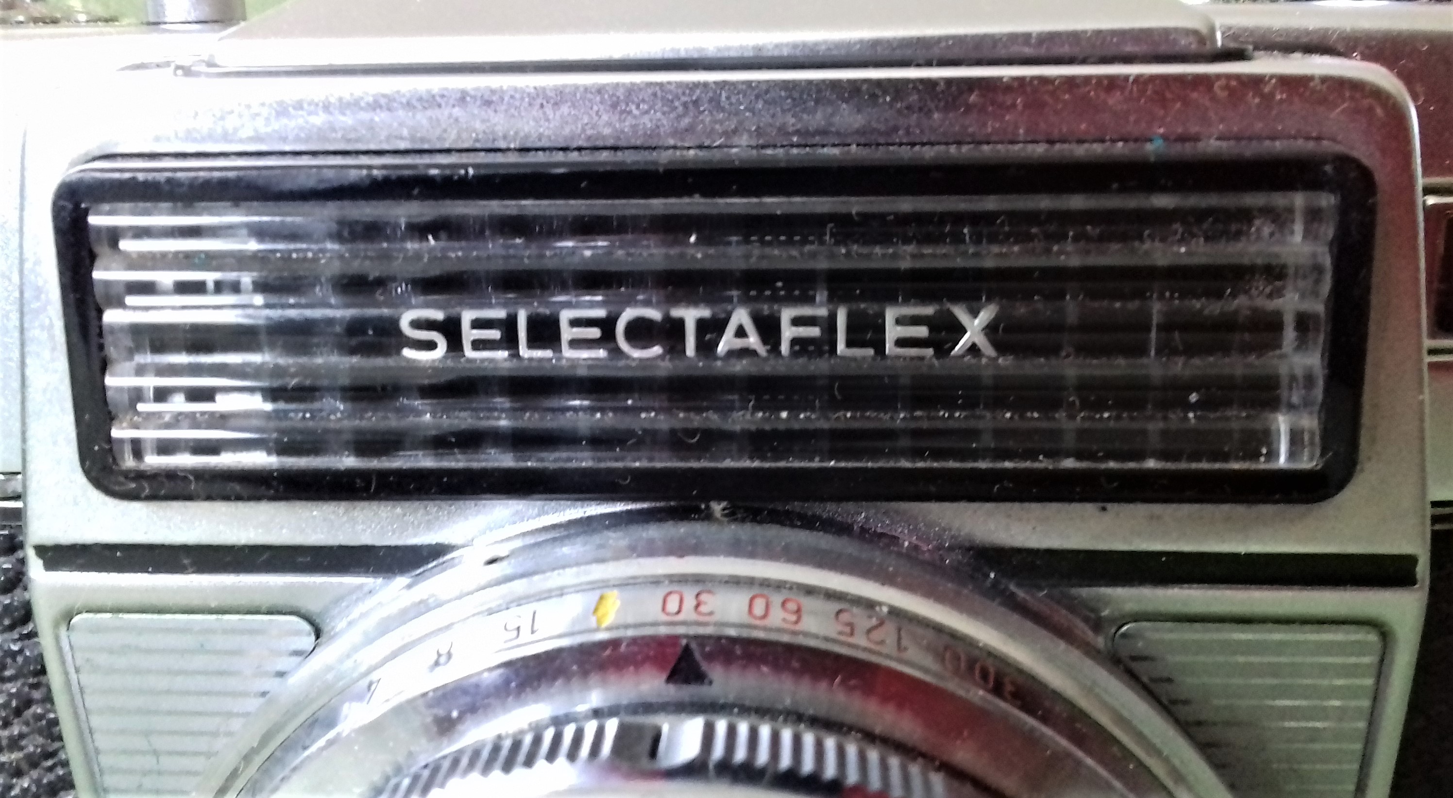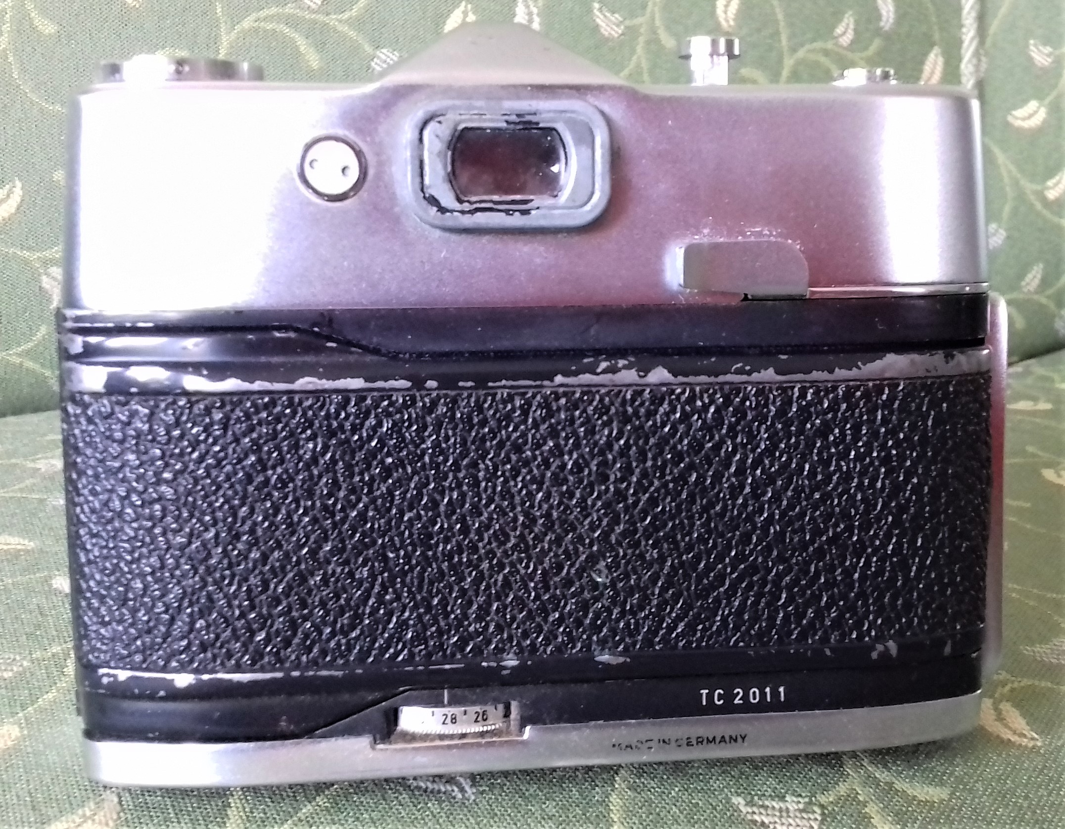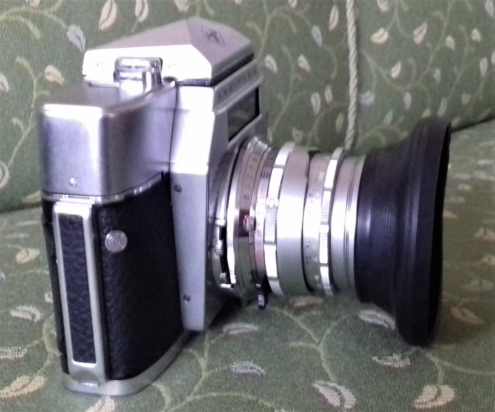 Ich trage hier noch mal Fotos zur erwähnten "Selectaflex" nach. Sie ist in vielem der "Ambiflex" sehr ähnlich, mit der Ausnahme, dass sie (optional) eine Blendenautomatik hat: Stellt man den Blendenring auf "A", wählt die Kamera selbsttätig eine zur eingestellten Belichtungszeit passende Blende aus und zeigt dies im Sucher an. Meine "Selectaflex" meldet allerdings so dubiose, d.h. unglaubwürdige Werte, dass ich ihr nicht vertraue. Vermutlich hat der Selen-Belichtungsmesser längst den Geist aufgegeben. Aber mit der manuellen Blendeneinstellung ist die Kamera glücklicherweise dennoch weiterhin benutzbar.