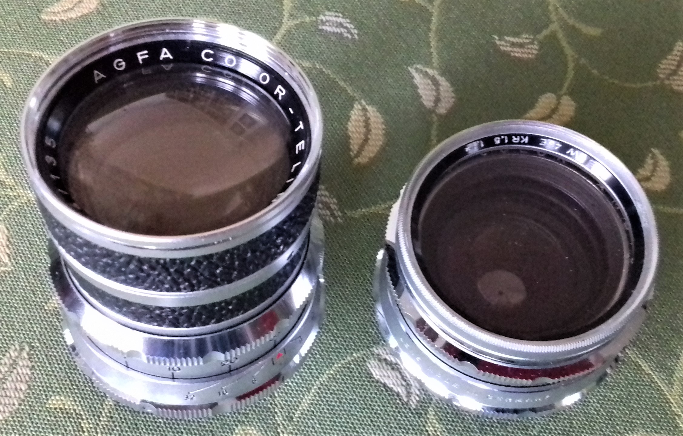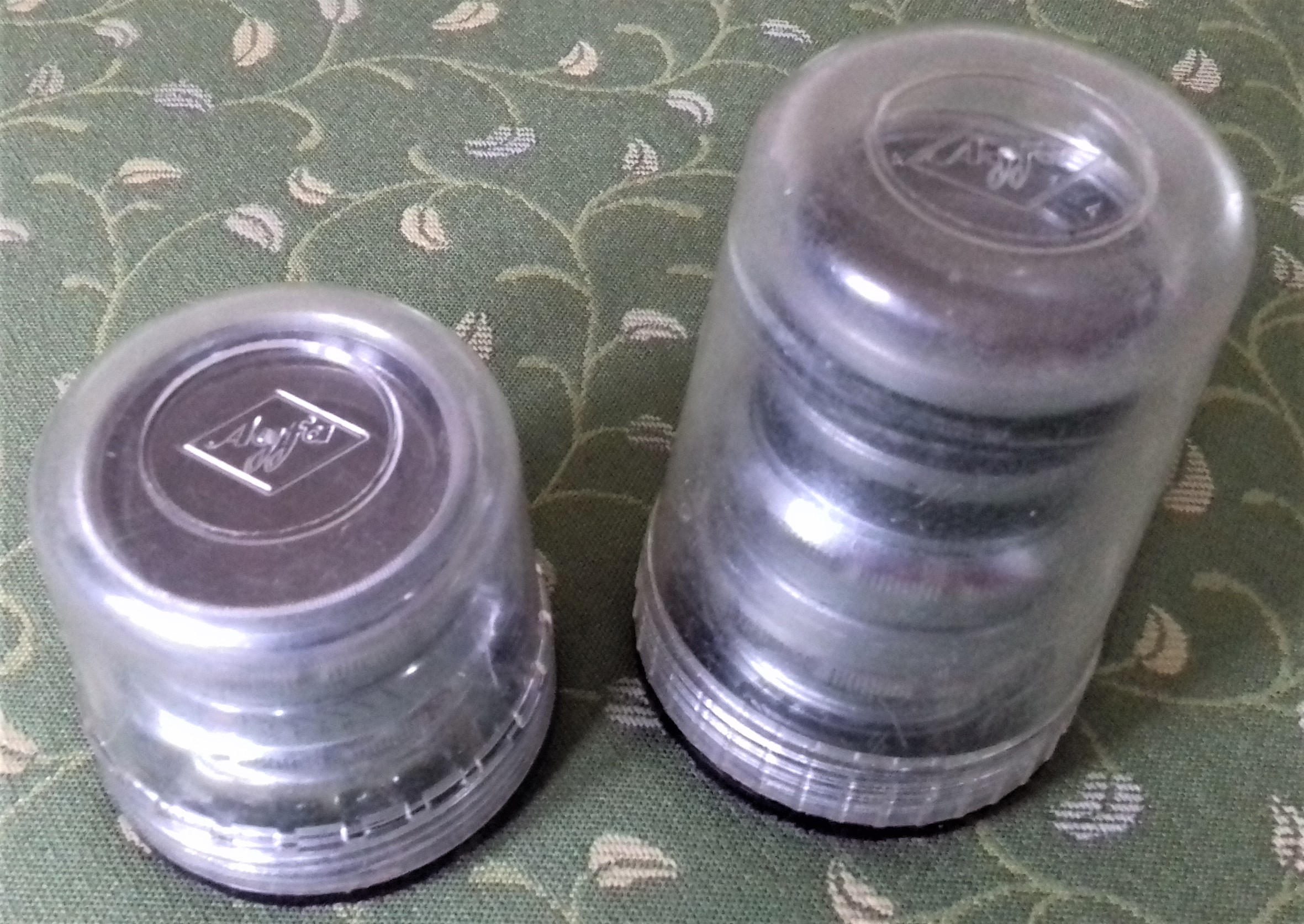Besonders interessant sind auch die verschraubbaren Tropenbehälter für die Objektive, die am Boden rosa Kieselgel-Kügelchen enthalten, die stark wasseranziehend sind und die Feuchtigkeit in den Behältern binden. Oft fehlen die Kügelchen heute leider und die Bodenkammer ist leer. Agfa hat offenbar erwartet, dass alle „Ambiflex“-Besitzer im Dschungel fotografieren werden.