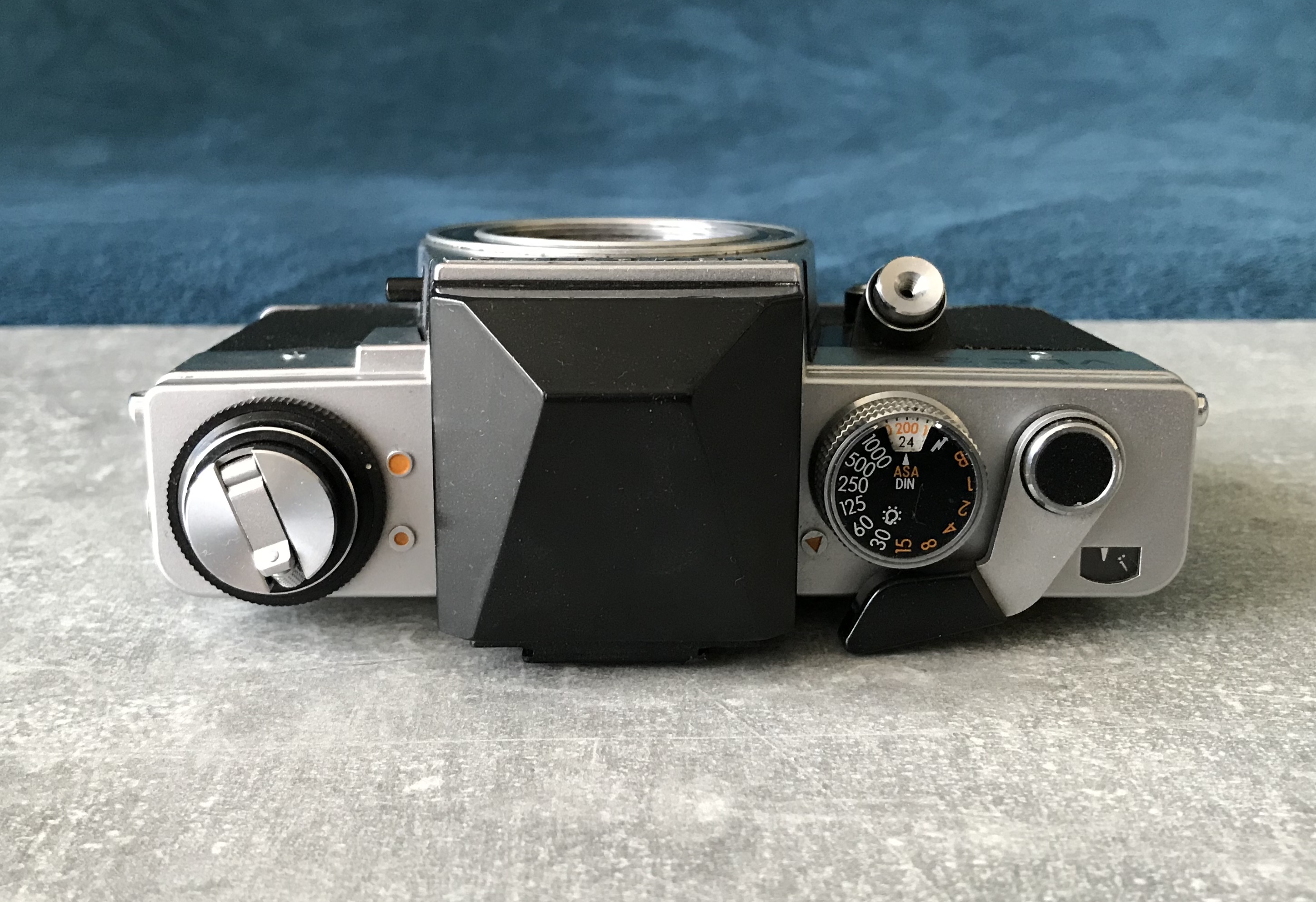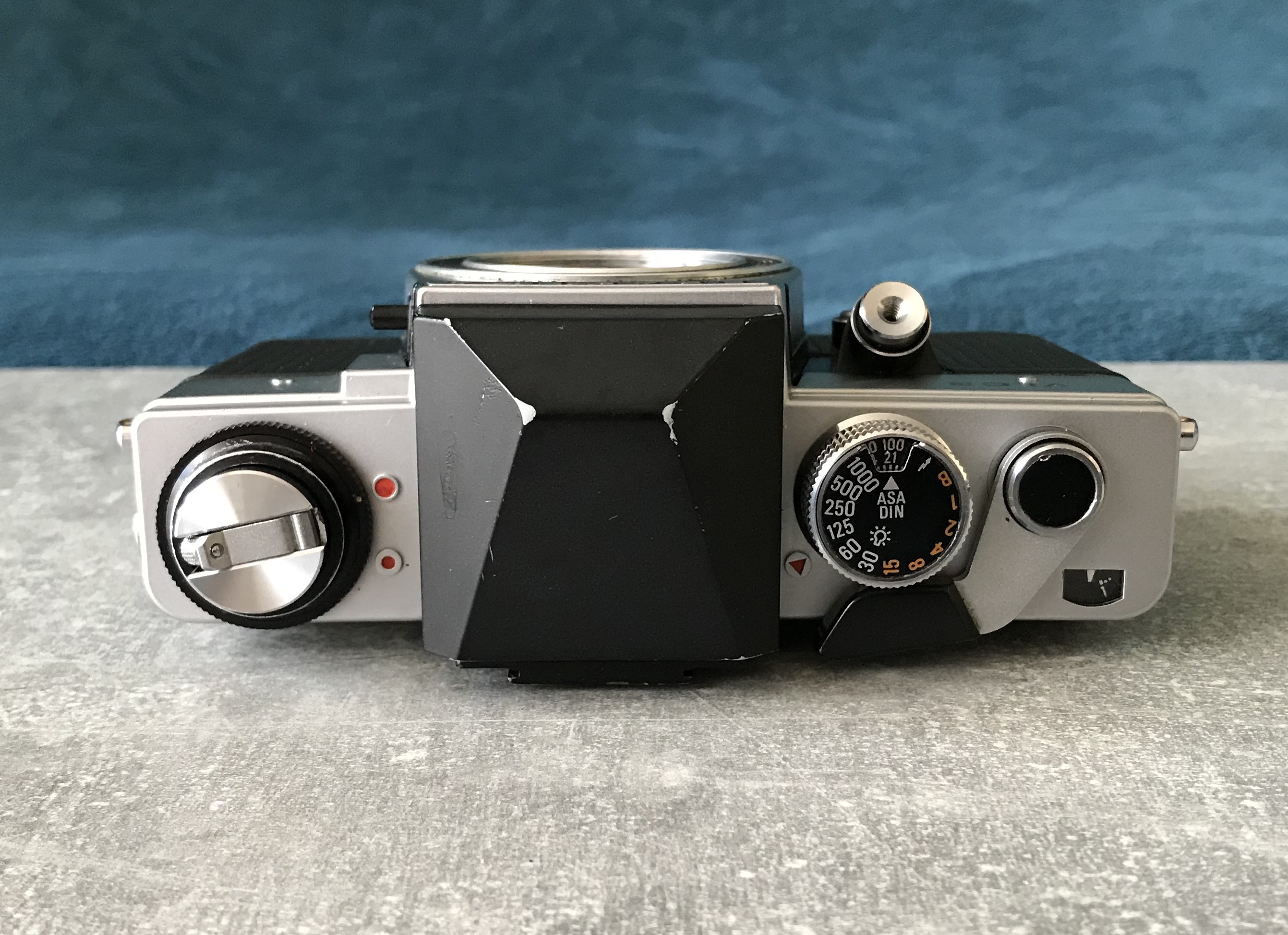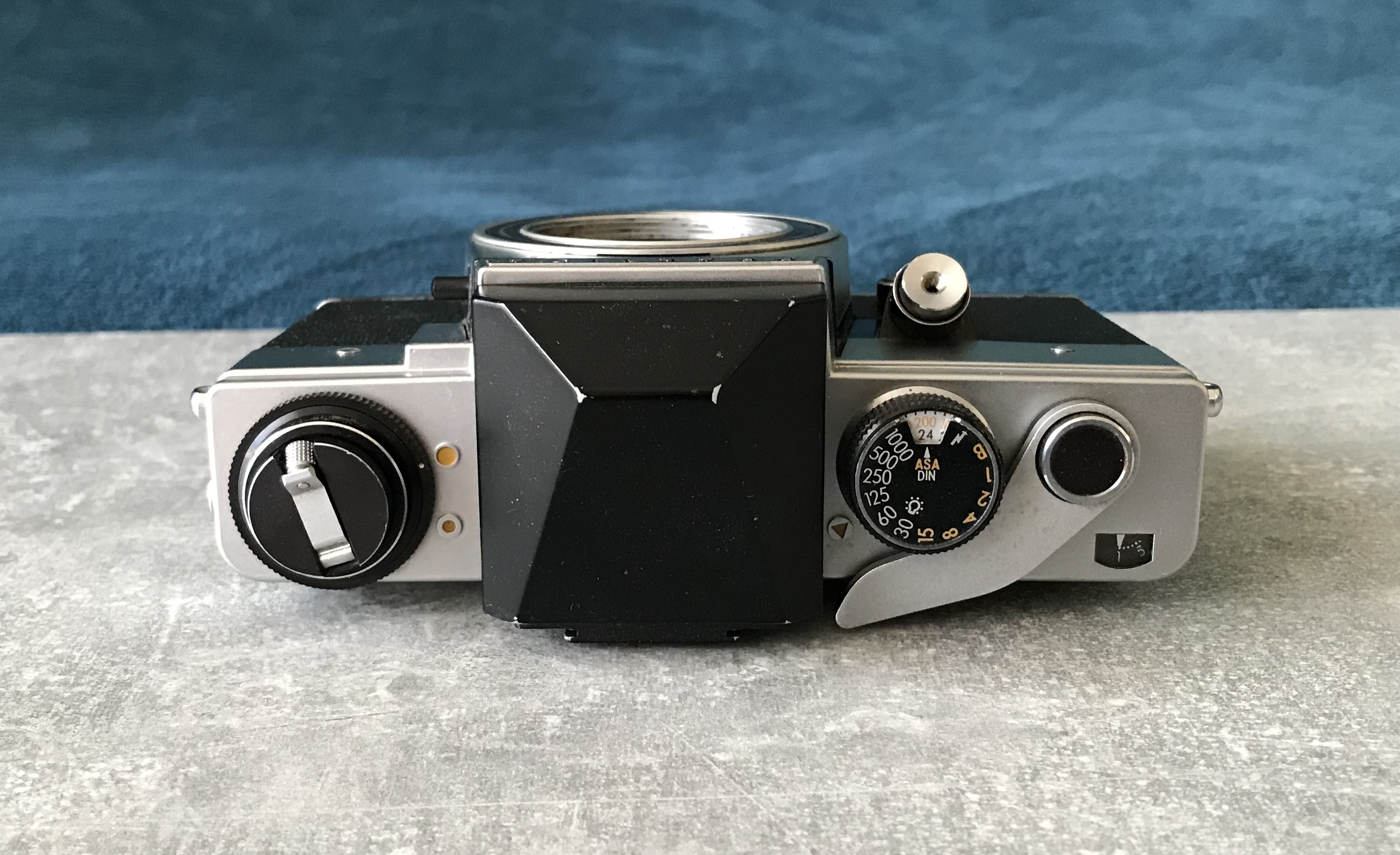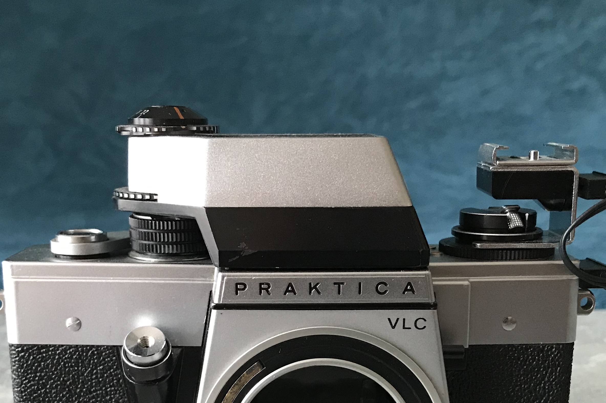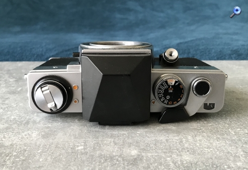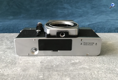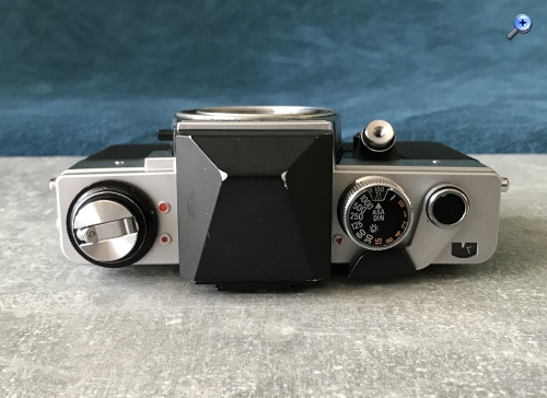 Trivia: falls die Belichtungsmessung der Kamera defekt sein sollte kann man sich mit einem Messprisma der Exakta RTL 1000 behelfen, dieses passt ebenfalls in die VLCs. --- Bei dieser herstellerseitig nicht vorgesehenen Kombination lässt sich der Zeitenknopf nicht betätigen! Bleibt gesund!
