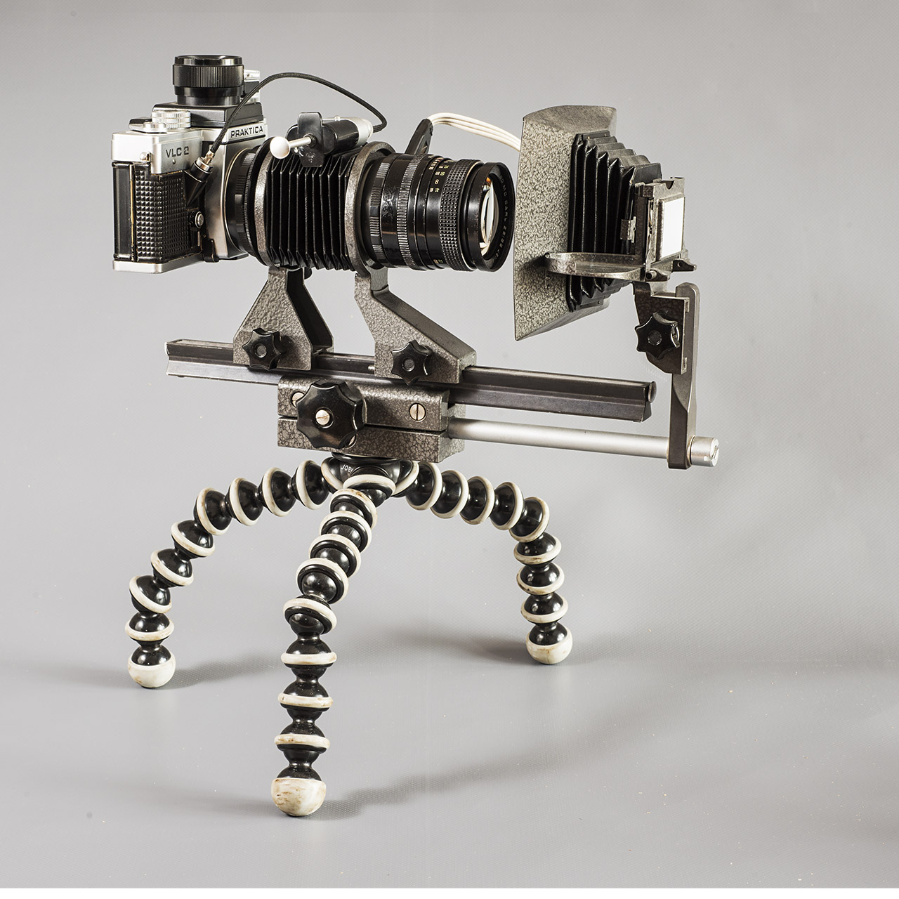 Hallo , hier noch eine Ergänzung zur Practica VLC mit Balgengerät- elktr. Zwischenringen-Diareprogerät , Lupensucher und Zeiss Pancolar 1,8/80mm. Ich habe mehr als 10 Jahre mit diesem sehr universell einsetzbarem Modell gearbeitet. Eine würdige Nachfolgerin der Exa Varex aus den 50igern. Ein Wechselsuchersystem hat mir in den ersten Jahren der Digitalkameras am häufigsten gefehlt.
