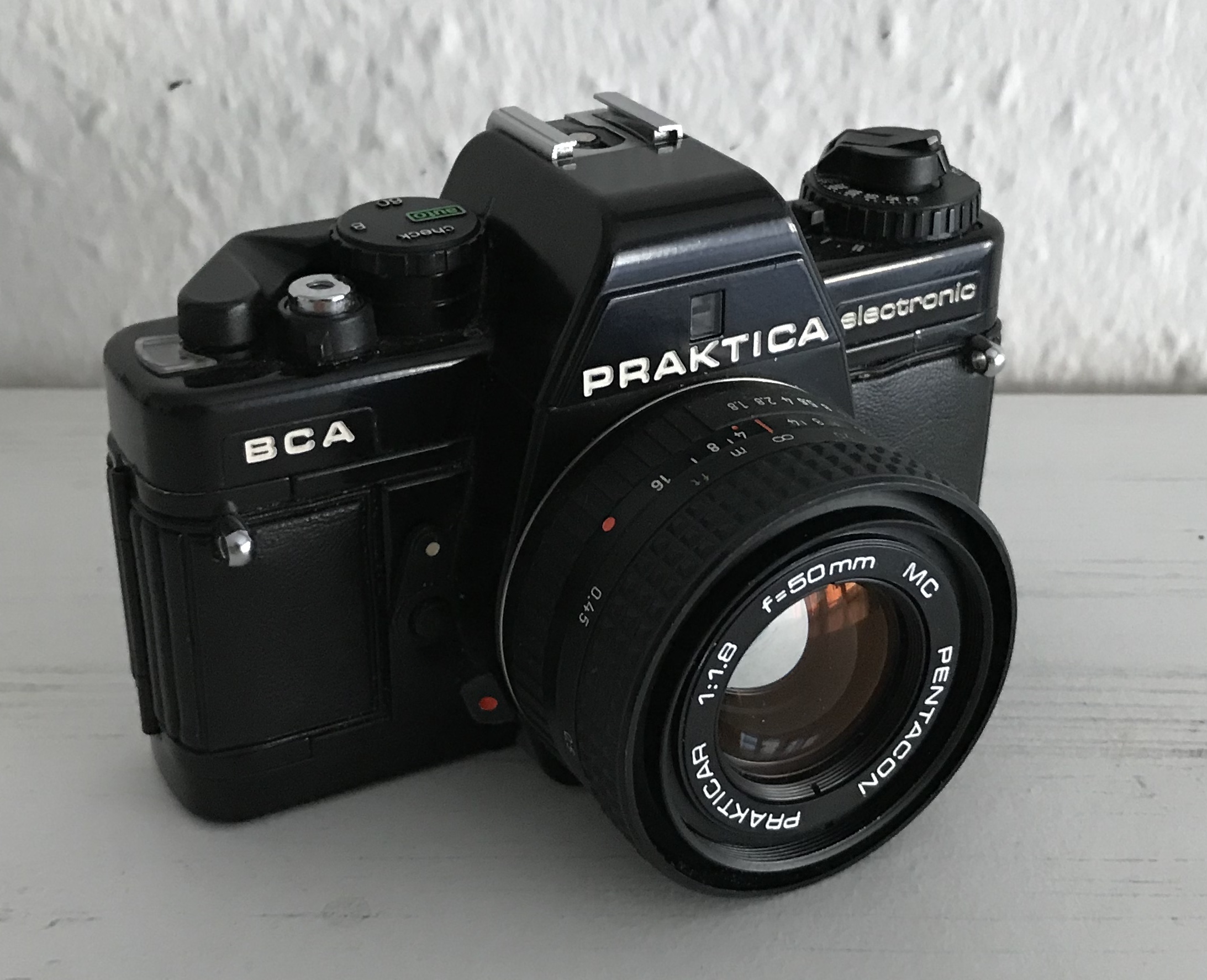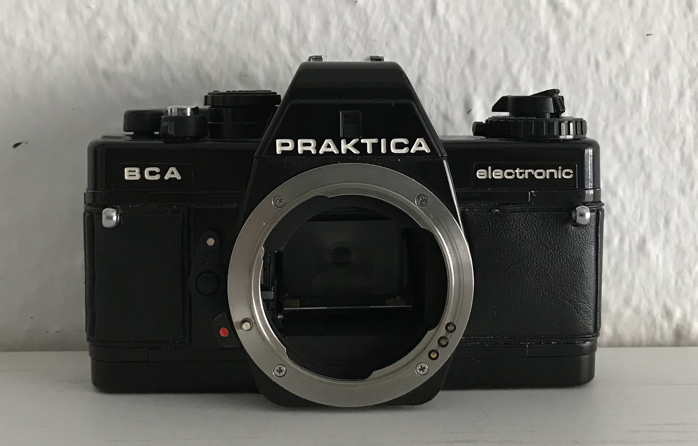 Hersteller: Kombinat VEB Pentacon Dresden Typ: Praktica BCA Baujahr: 1985 - 1990 (meine Kamera zwischen 04.12.1989 und 10.12.1989) Verschluss: elektrisch gesteuerter horizontaler Metalllamellenschlitzverschluss (B, A, 1/60s) Objektivanschluss: Praktica B Belichtungsmessung: TTL-Innenmessung mit Lichtkonzentrator und halbdurchlässigem Spiegel (Belichtungskorrektur +/- 2 EV) Blitzanschluss: Hot-Shoe in Prismenkappe, computerblitzfähig Besonderheiten: Vorlaufwerk, Blendeneinspiegelung, Motoranschluss, Stativgewinde