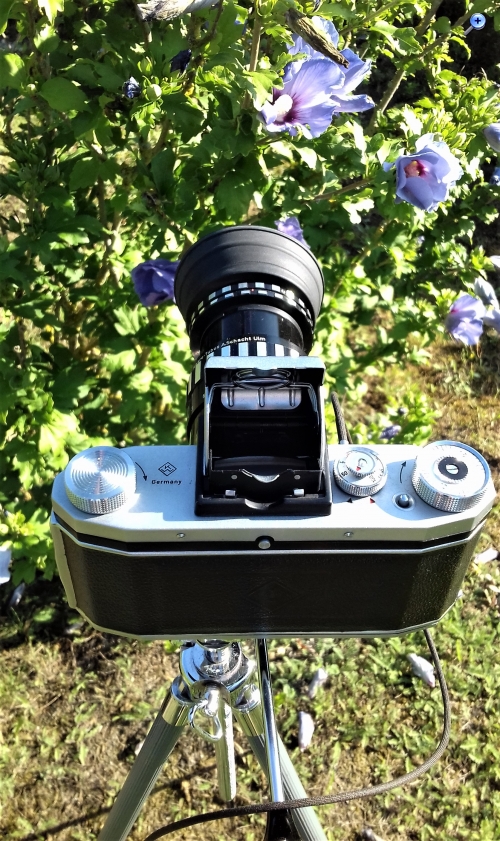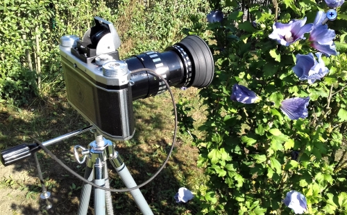 Heute einfach nur mal ein paar August-Bilder: Die Praktica F.X 2 (meine Lieblingskamera) bereit für verwacklungsfreie Makro-Aufnahmen der spätsommerlichen Flora mit dem Schacht M-Travenar.
