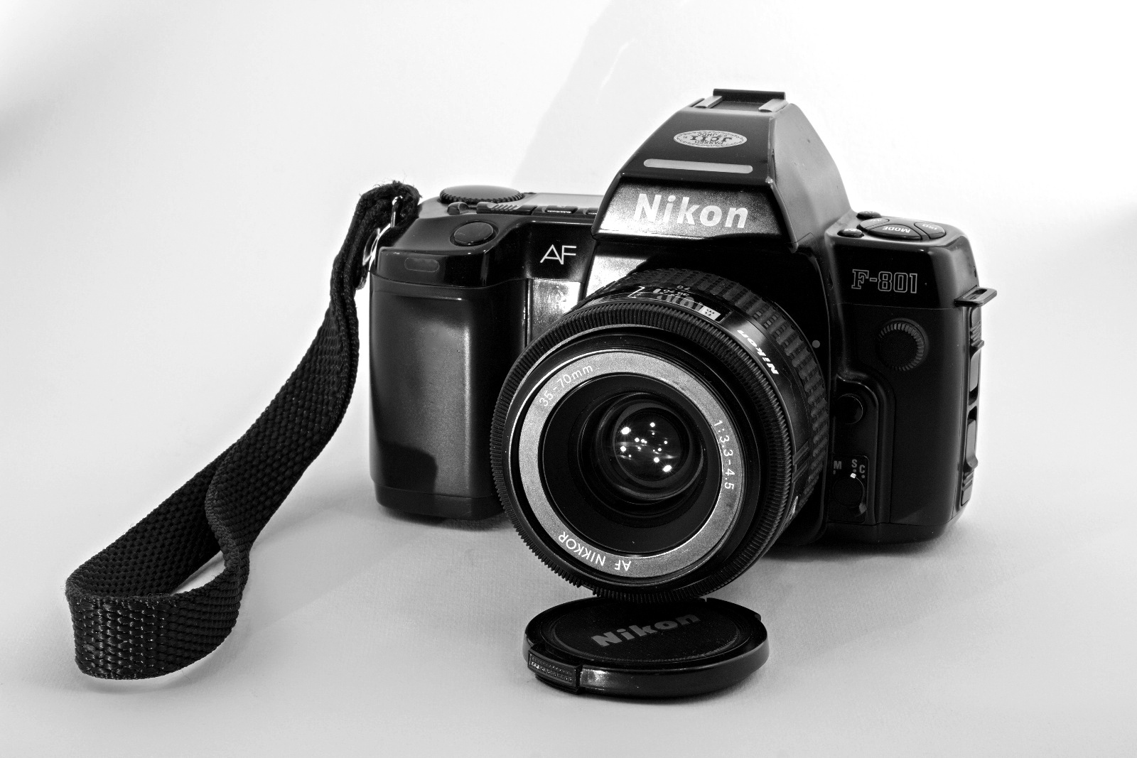 Die Nikon F-801 kam 1988 auf den Markt. Sie ist das Vorgängermodell zur Nikon F-801s (1991). Eine schwere aber gut verarbeitete Kamera mit 4 Mignon AA Batterien. Der geräuschvolle Stangen-Autofokus funktioniert schnell und präzise. Die Programme und Belichtungswerte lassen sich auf dem Schulterdisplay einstellen.