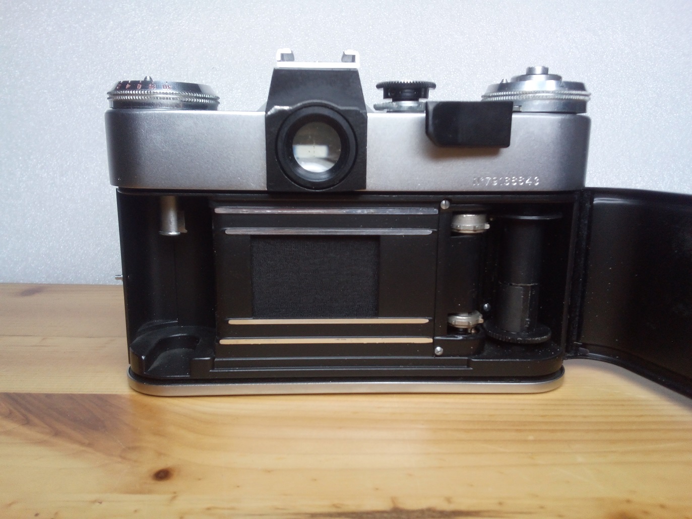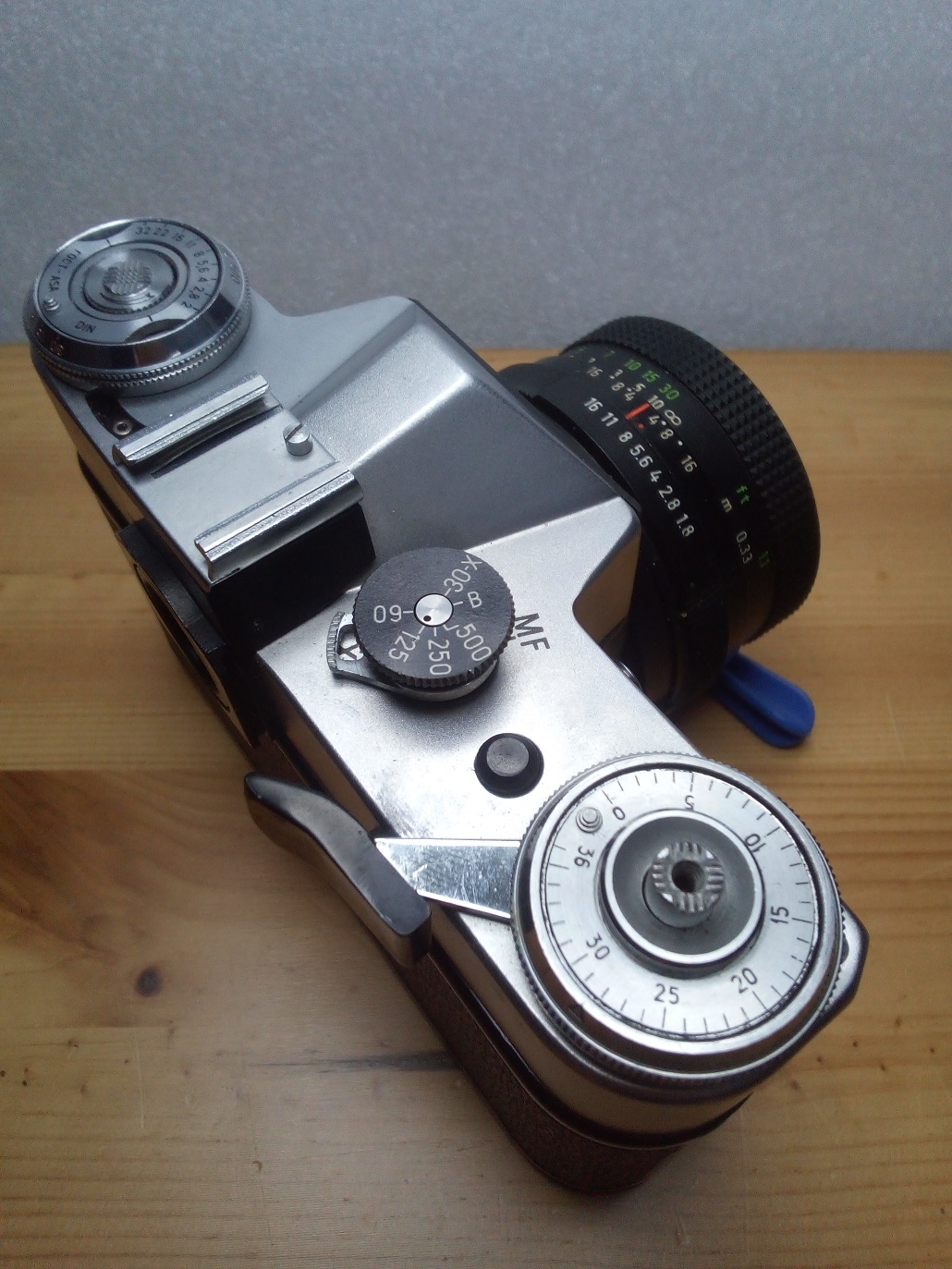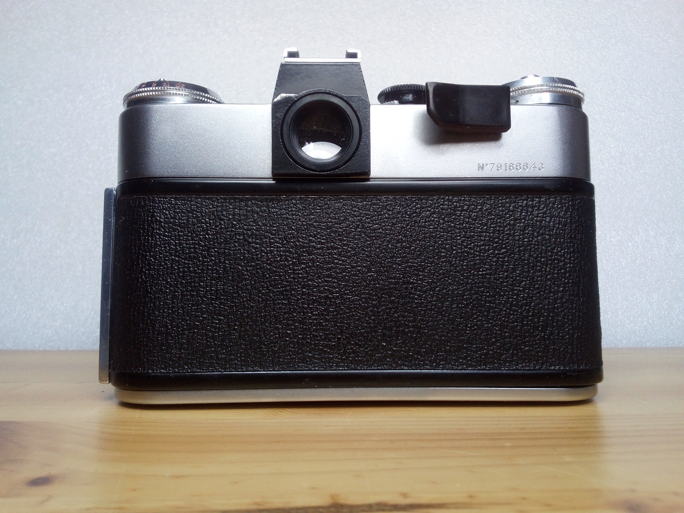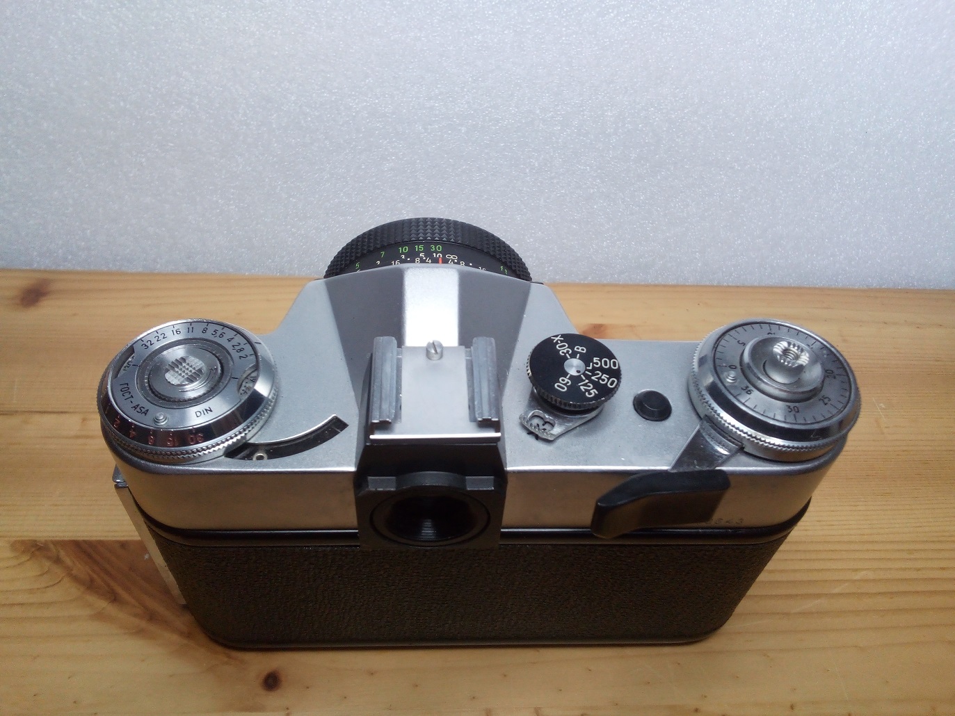 Oberseite: Einstellscheibe für die Filmempfindlichkeit, Einstellung Belichtungsmesser, ausfahrbare Rändelschraube für die Filmrückspulung, Sichtfenster für den Belichtungsmesser, Blitzschuh ohne Mittenkontakt (PC-Buchse vorne rechts), Einstellrad für die Verschlußgeschwindigkeit (darunter Verstellung für den Blitzmodus, Blitzbirnchen oder Elektronikblitz) Entsperrknopf für die Filmrückspulung, Schnellspannhebel, darüber Filmzählwerk (manuelle Rückstellung) und Auslöser mit Drahtauslöseranschluß