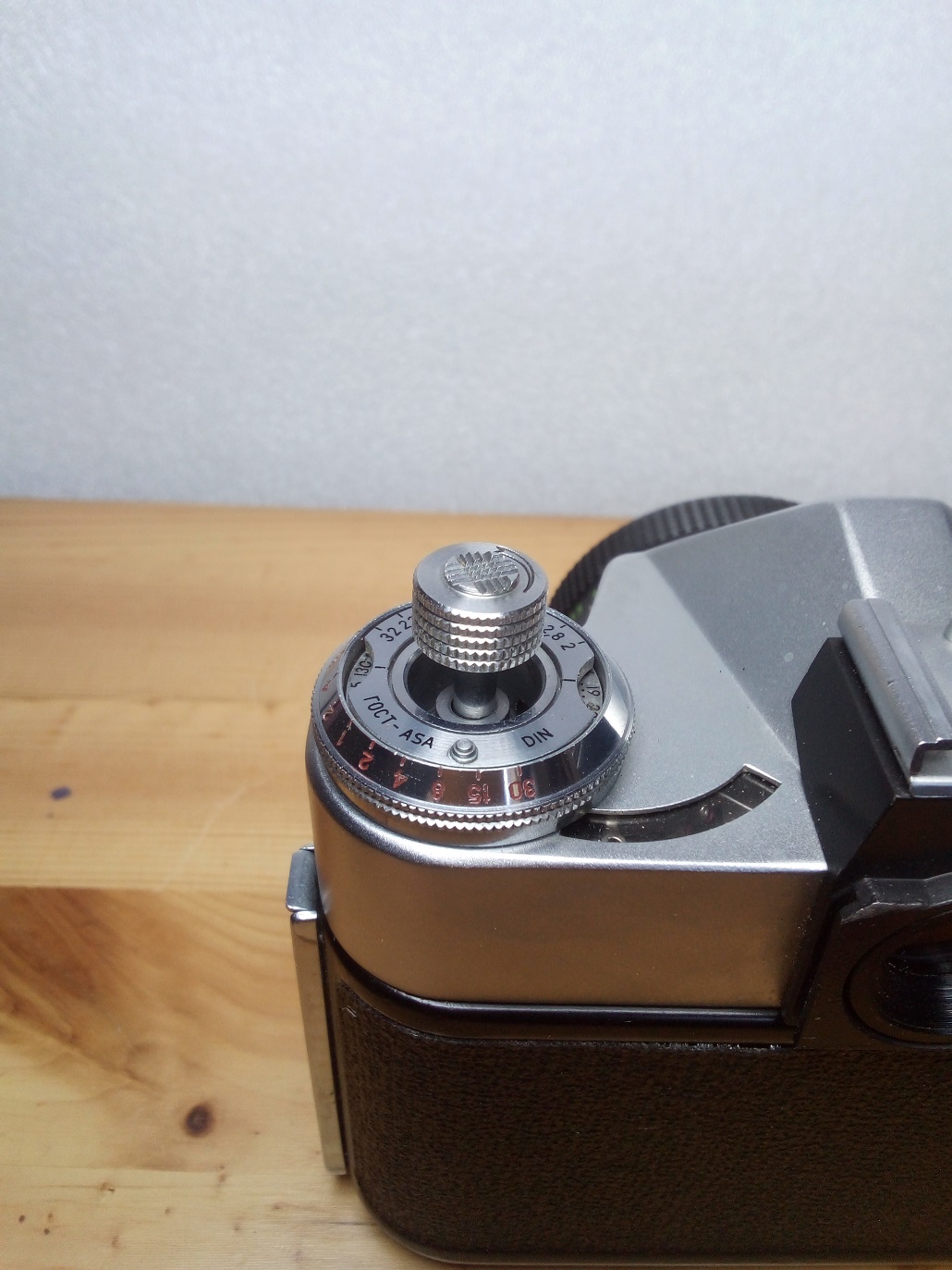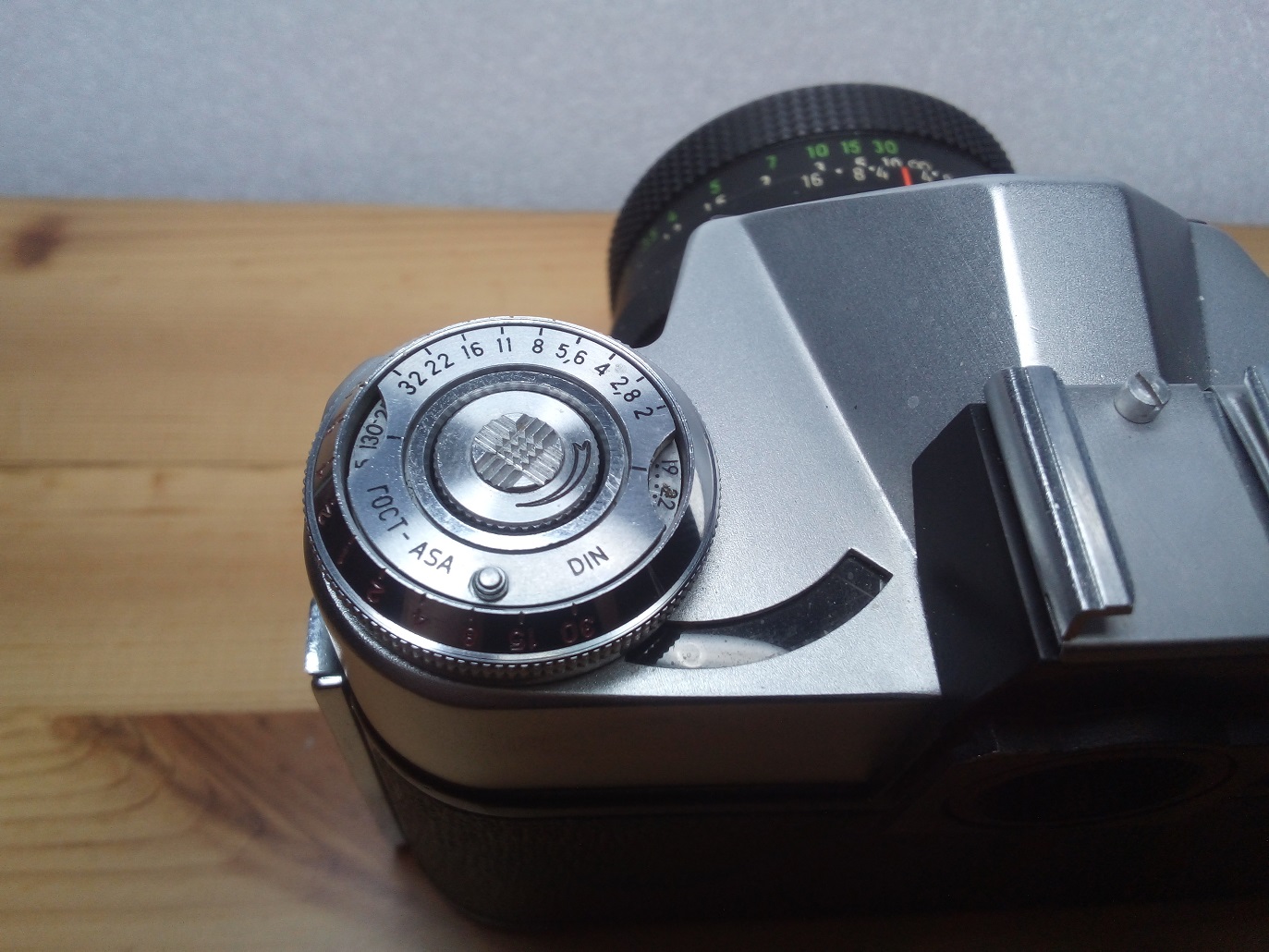 Die Zenit-E verfügt über einen Selenzellen gestützten Belichtungsmesser (bei dieser Kamera leider ohne Funktion). Hat man mit der oberen Scheibe auf der linken Seite die korrekte Filmempfindlichkeit eingestellt (DIN oder GOST / ASA) ist mit dem darunterliegenden Rändelrad eine Kelle mit dem Zeigerausschlag im Sichtfenster in Deckung zu bringen.