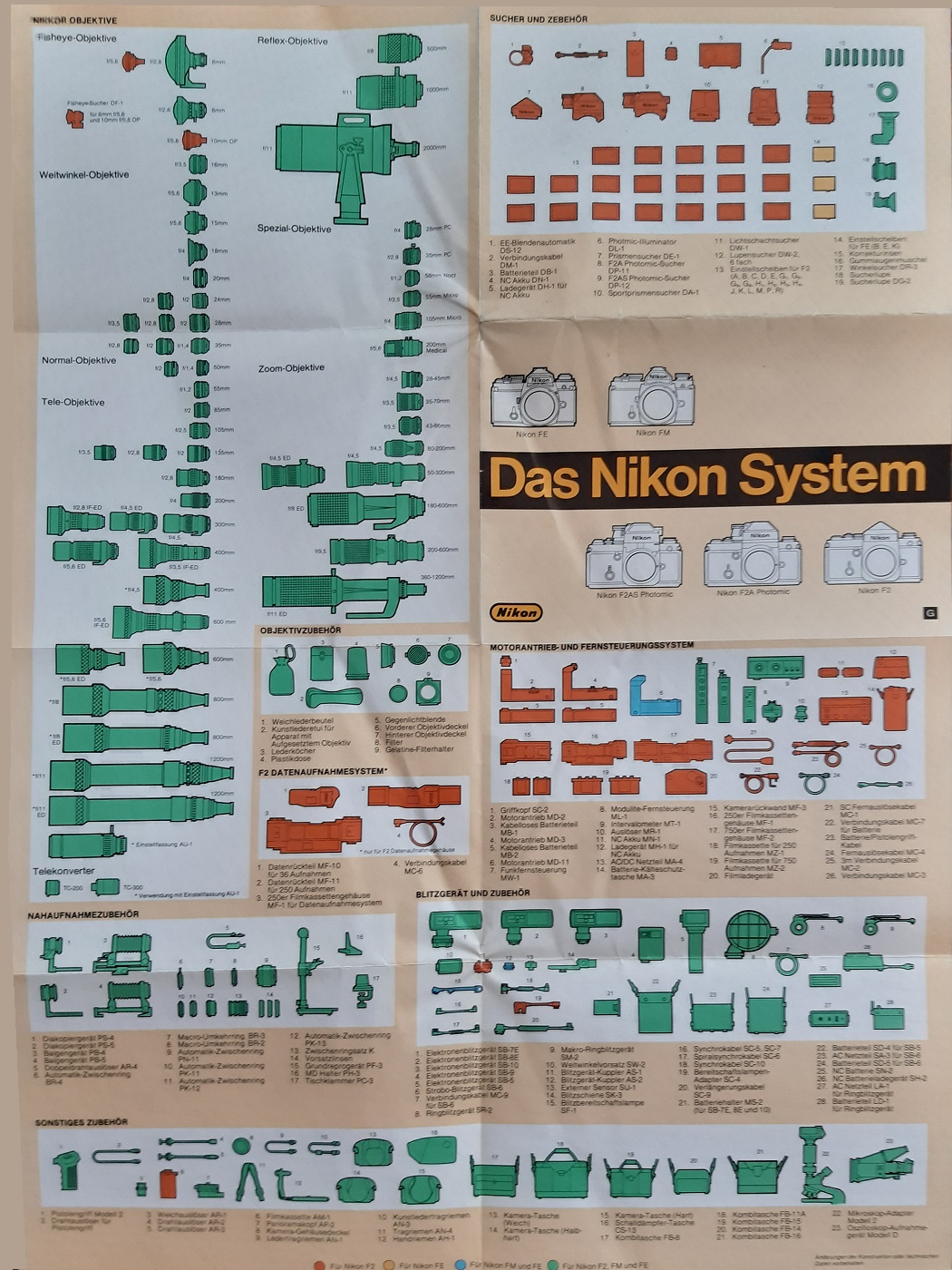 das waren noch Zeiten, als Nikon für ihr Spiegelreflex-Kamerasystem ordentlich in die Breite entwickelt hat. Mir ist ein Werbeprospekt aus diesen Jahren zugeflogen, der beeindruckend aufzeigt, wass es alles an Kameras, Objektiven und Zubehör gab. Respekt. Nikon war damals wohl auch für viele Berufsfotografen ein Mittel der Wahl. Nikon hatte damals DEN Namen.