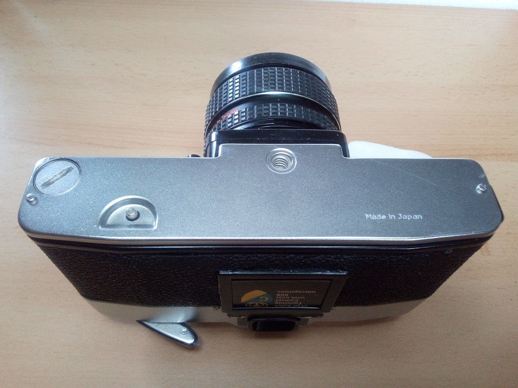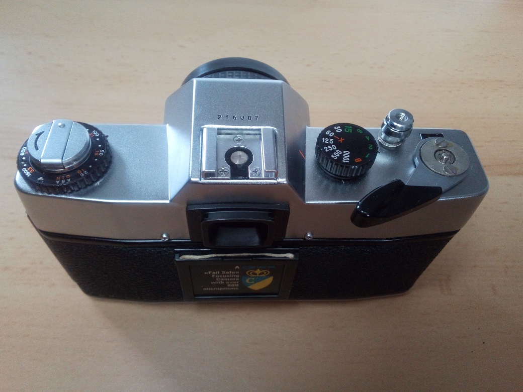 Oberseite: Filmrückspulkurbel, darunter Einstellung für Filmempfindlichkeit, Blitzschuh mit Mittenkontakt, Einstellrad für Verschlusszeiten, Auslöser mit Drahtauslöseranschluß, Bildzählwerk, Schnellspannhebel (Abdeckkappe fehlt bei meinem Exemplar)