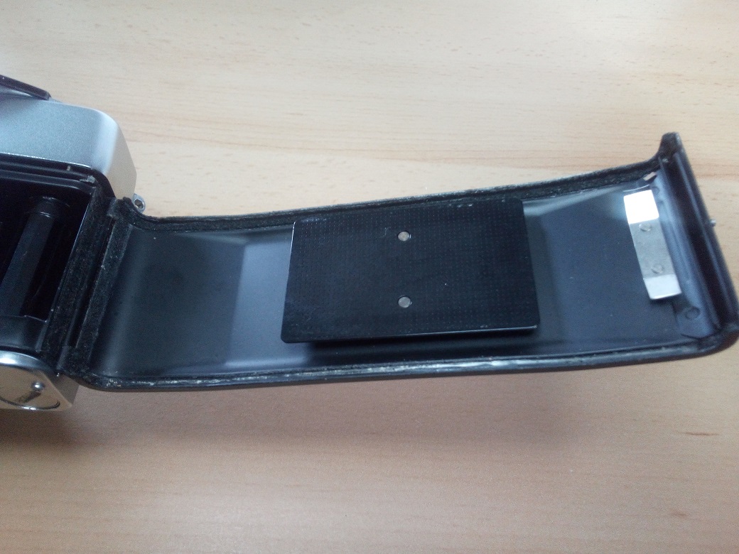 Rückseite: Sucherfenster, Memoryfach, aufklappbare Rückwand mit Filmandruckplatte