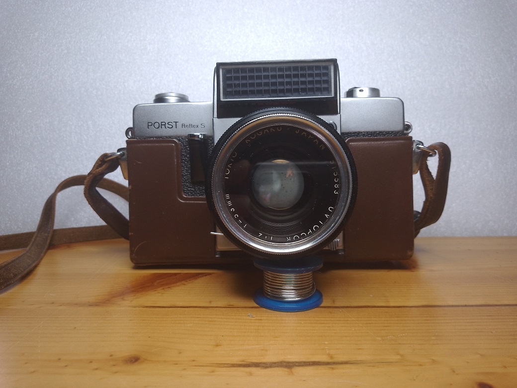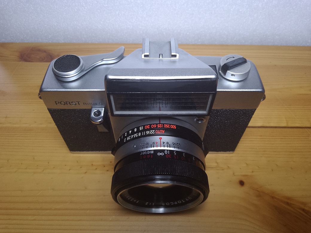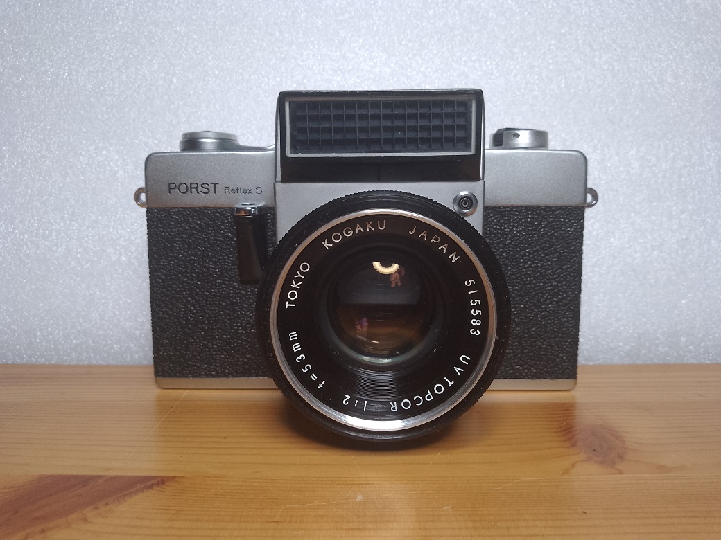Vertrieb / Hersteller: Photo Porst, Nürnberg / Tokyo Kogaku, Japan Modell: Porst Reflex S / Topcon Wink Mirror S Typ: KB-SLR mit selenzellengesteuerter Belichtungsautomatik und Selbstauslöser, 24 x 36 mm, max 36 Aufnahmen Baujahr: 1964 Seriennummer: 5357285 Verschluß: mechanischer Schlitzverschluß, Seikosha-SLV, "B", 1 - 1/500 sec Blenden: 2 - 22 und "Auto" Standardobjektiv: UV TOPCOR 1:2 f=53 mm TOKYO KOGAKU JAPAN, Seriennummer: 515583 Fokussierung: manuell, 0,7 Meter - unendlich Filmempfindlichkeit: 12 - 27 DIN Gewicht (mit Objektiv): ca. 800 Gramm Neupreis (1964): 398,-- DM Bereitschaftstasche: 24,50 DM