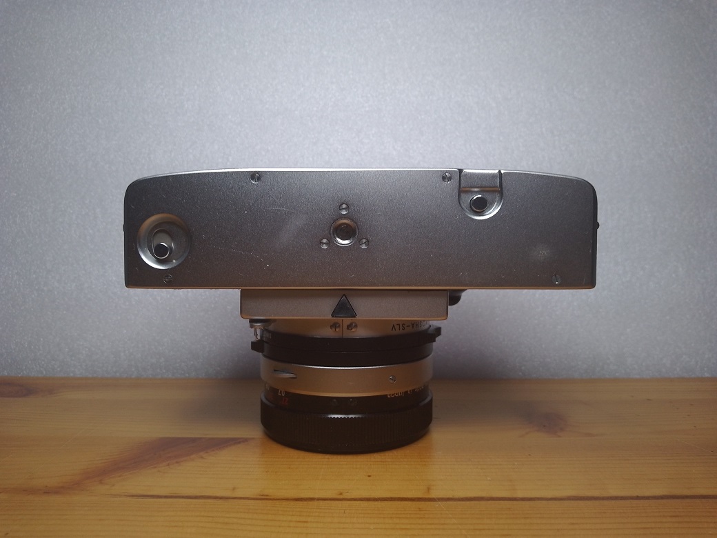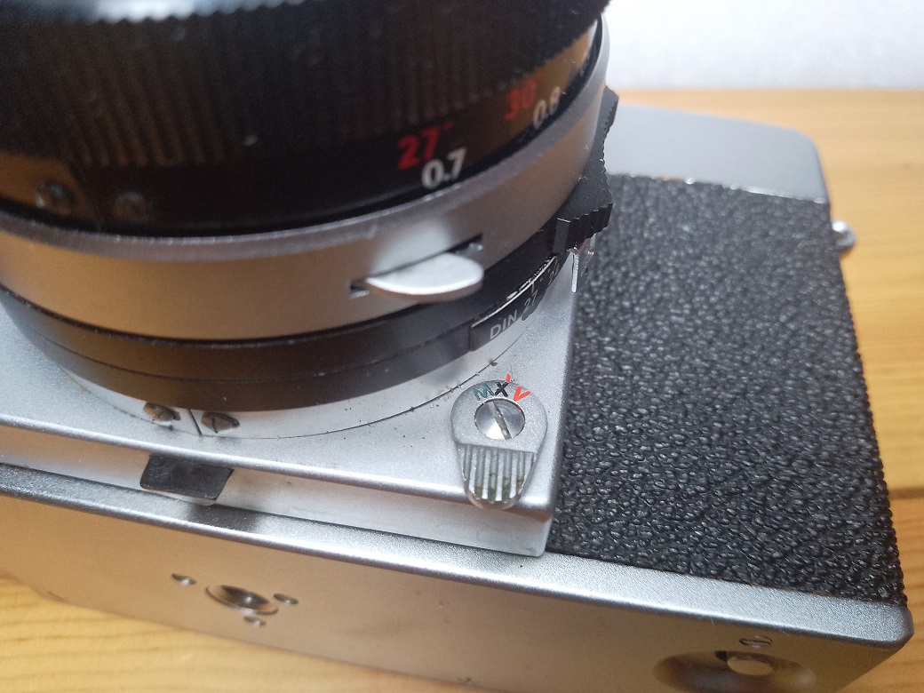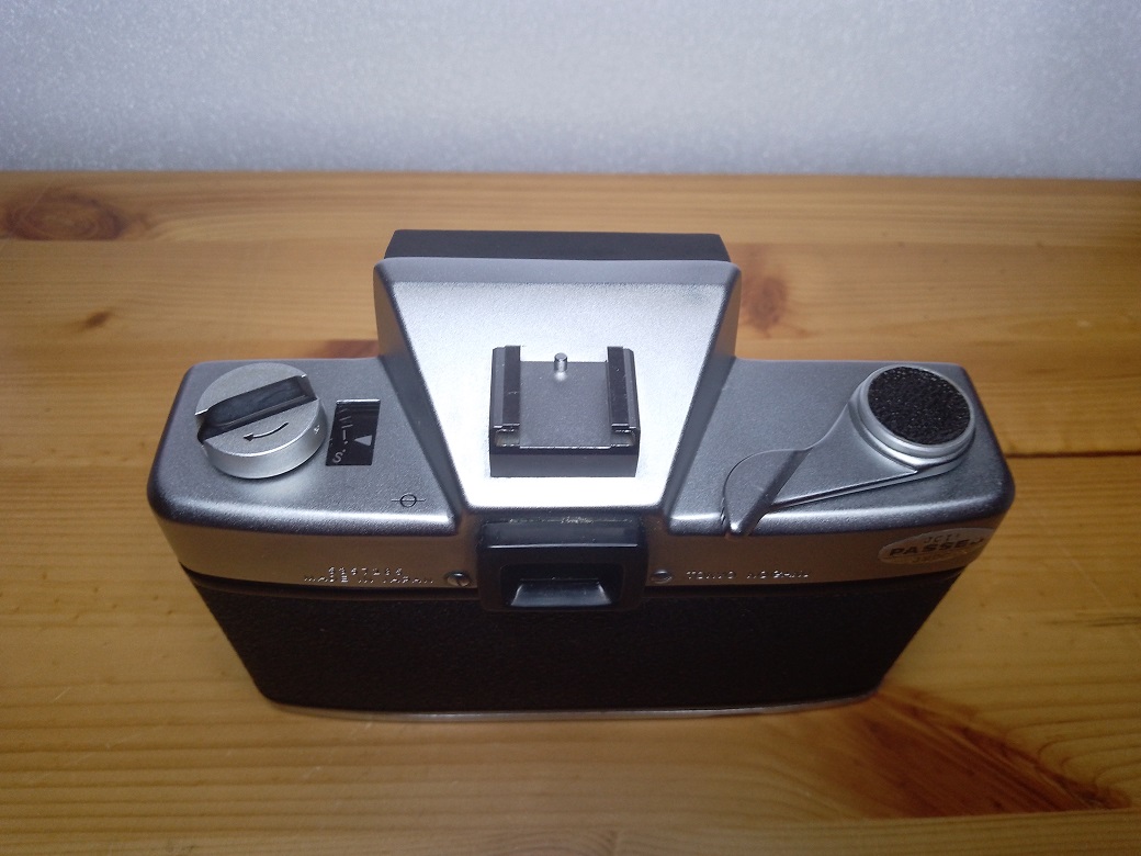Oberseite: Filmrückspulkurbel, Bildzählwerk (selbstrückstellend), Blitzschuh ohne Mittenkontakt (PC-Buchse vorne links am Gehäuse), Schnellspannhebel
