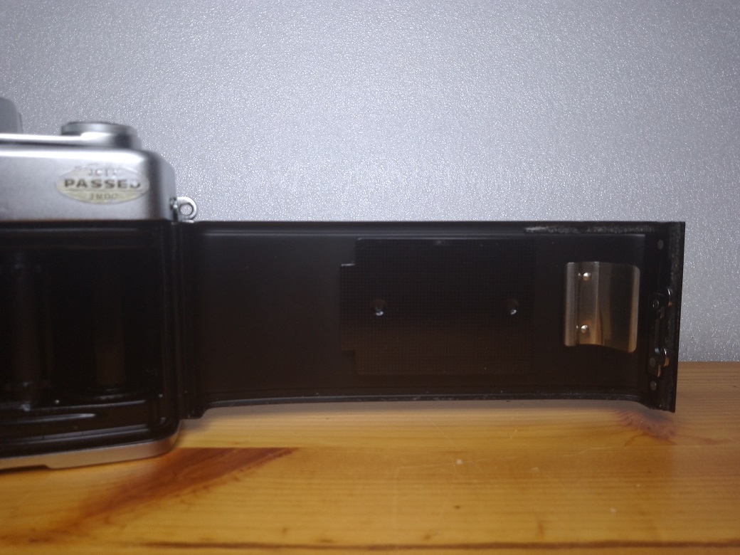 Rückseite: Sucher mit Belichtungsmessereinpiegelung, klappbare Rückwand mit Filmandruckplatte