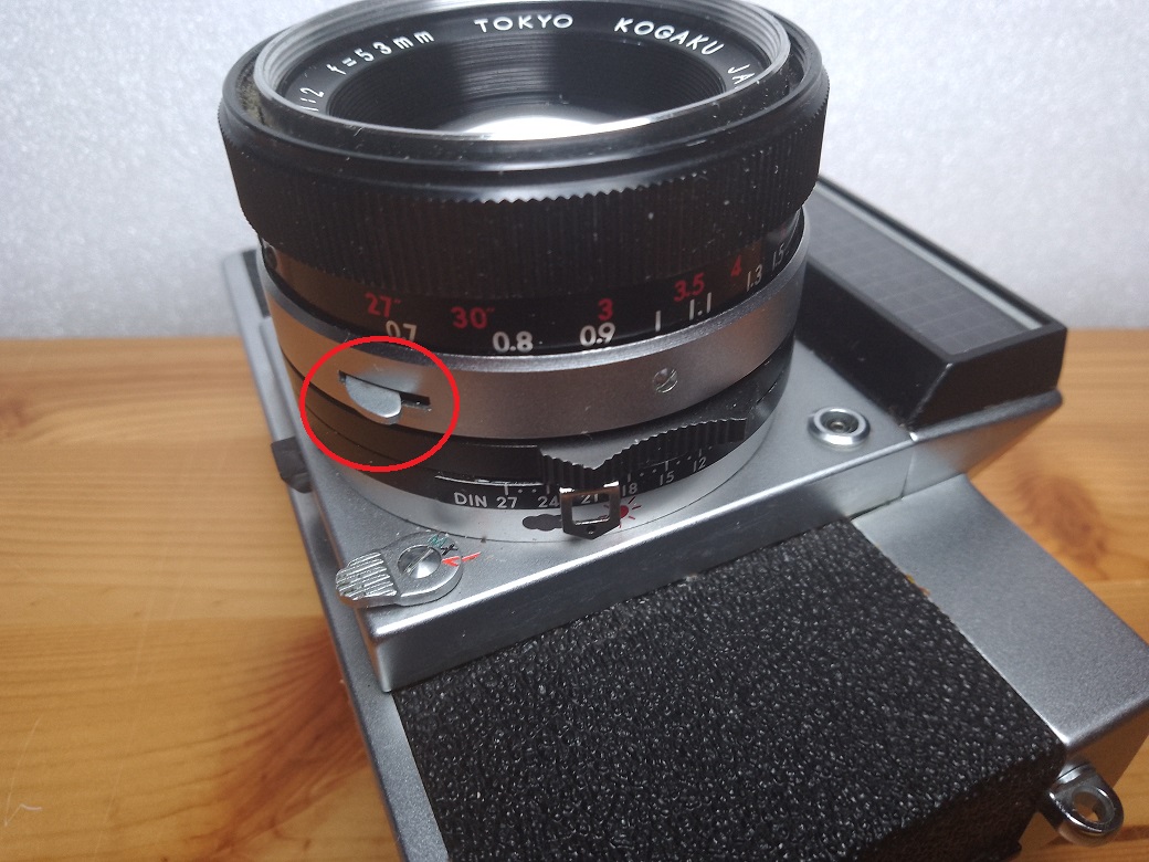 Als eine der ersten Spiegelreflexkameras konnte die Reflex S dem Anwender eine selenzellengesteuerte Belichtungsautomatik anbieten. Dazu muß am Blendenring auf "Auto" gestellt werden und innerhalb der rot markierten Verschlußzeiten (1/30 - 1/500 sec.) ermittelt die Automatik die für die gewählte Verschlußzeit passende Blende. Vorher muß dazu an der Kamera die korrekte Filmempfindlichkeit eingestellt werden. Selbstverständlich ist es möglich außerhalb des Automatikmodus den Belichtungsvorgang manuell zu steuern. Die ermittelten Blendenwerte werden in den Sucher eingespiegelt. Bei der Reflex S befindet sich die Blende in der Kamera und nicht wie bei anderen SLR im Objektiv. Neben dem hier gezeigten 6 Linser 1:2/53 mm Standardobjektiv waren noch ein 6 linsiges 1:3,5/35 mm Weitwinkelobjektiv (198,-- DM) und ein 4 linsiges 1:4/135 mm Teleobjektiv zu 238,-- DM erhältlich. Die Kamera verwendet ein Topcon / Exacta Bajonett. Die Entriegelung des Objektives findet über den im Bild markierten kleinen Hebel statt.