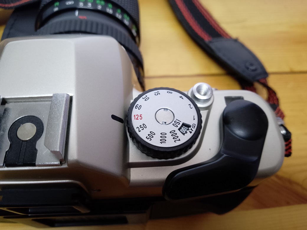 Oberseite: Filmrückspulkurbel (gleichzeitig Entriegelung der Rückwand) Blitzschuh mit Mittenkontakt, Zeitenrad (darunter Einstellung der Filmempfindlichkeit), Auslöser mit Drahtauslöseranschluß, Schnellspannhebel, Anzeigefenster für den Bildzähler (selbstrückstellend beim Öffnen der Rückwand)