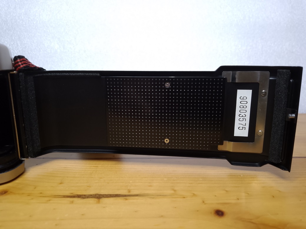 Rückseite: klappbare Rückwand mit Memo-Halter und Filmandruckplatte, Umrechnungstabelle ISO zu DIN, Sucherfenster