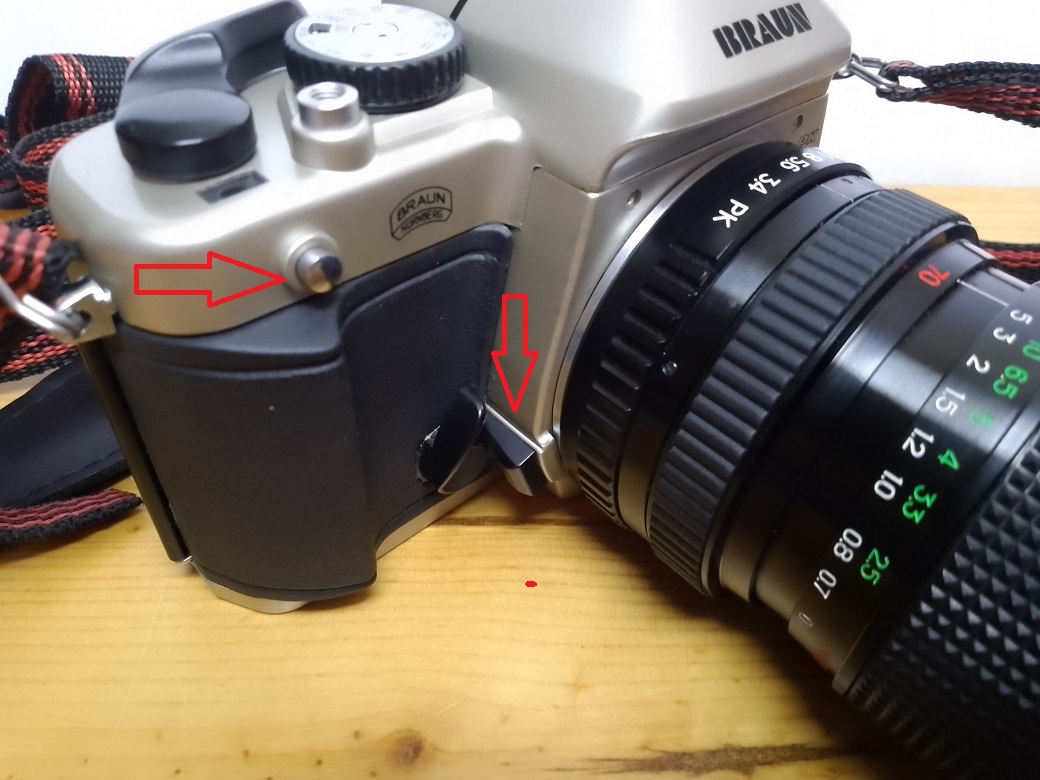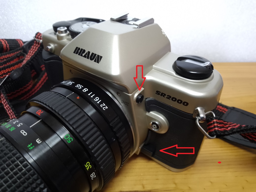 Wenden wir uns nun der Technik zu: Die SR2000 ist eine vollkommen mechanische SLR mit einem vertikal ablaufenden Schlitzverschluß. Als Verschlußzeiten können "B" und 1 - 1/2000 sec gewählt werden. Die mittenbetonte Belichtungssteuerung erfolgt manuell über die Blenden- und / oder Verschlußzeitenwahl. Der Belichtungsmesser wird über 2 LR/SR 44 Batterien zu je 1,5 Volt versorgt und zeigt im Sucher zwei rote Leuchtdioden (- unterbelichtet und + überbelichtet) sowie eine grüne Diode (korrekte Belichtung) an. Die Belichtungsmessung kann über den halb betätigten Auslöser oder eine separate Taste links neben dem Bajonett erfolgen. Weiterhin sind Doppelbelichtungen möglich. Zu diesem Zweck kann mit einem silbernen Knopf vorne rechts an der Kamera der Filmtransport beim Spannen des Verschlusses unterbunden werden (Für besondere Effekte gab es eine spezielle Obkektivabdeckung https://www.lomography.com/magazine/75063-braun-sr-2000-pk ).