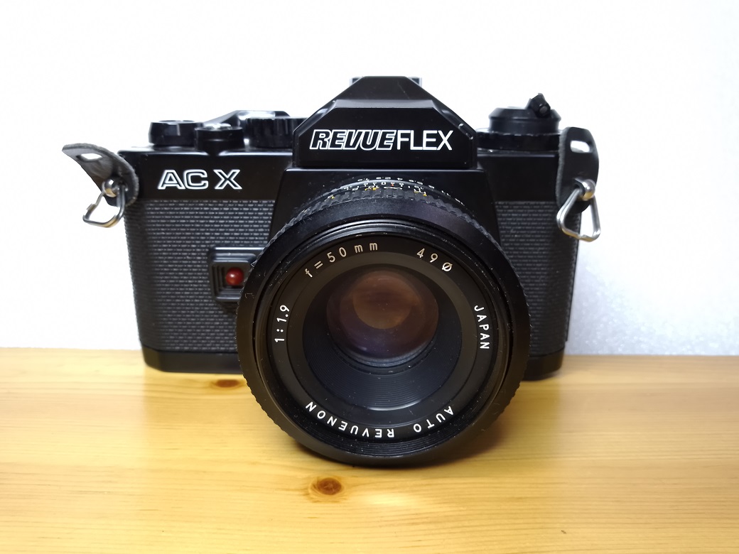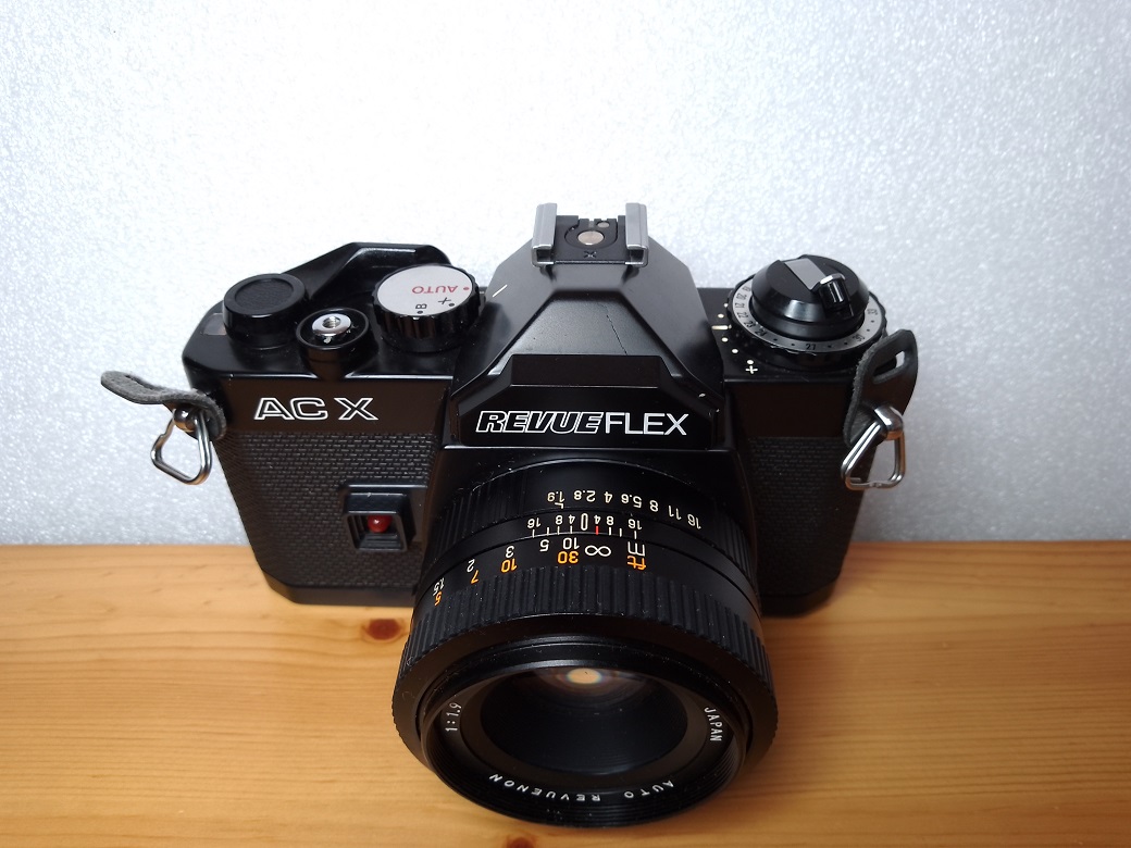 Vertrieb / Hersteller: Foto Quelle (Revue), Nürnberg / Chinon, Japan Modell: REVUEFLEX AC X / Chinon CA-4 Typ: KB-SLR mit vollautomatischer Belichtungs- und elektronischer Verschlußzeitensteuerung, 24x36 mm, max. 36 Bilder Baujahr: 1980 Seriennummer: 160284 Verschluß: elektromagnetischer Seiko Metallamellen-Schlitzverschluß, "AUTO" = 1 sec. bis 1/1000 sec, "X" = 1/80 sec. und "B" Standardobjektiv: AUTO REVUENON 1:1,9/50 mm Blenden: 1,9 - 16 Fokussierung: manuell, 0,45 Meter bis unendlich Objektivanschluß: PK-Bajonett Energieversorgung: 3 LR/SR Batterien a 1,5 Volt Filmempfindlichkeit: 15-36 DIN (25-3200 ASA) Neupreis mit Standardobjektiv (1980): 479,-- DM, Weichbeutel 29,90 DM