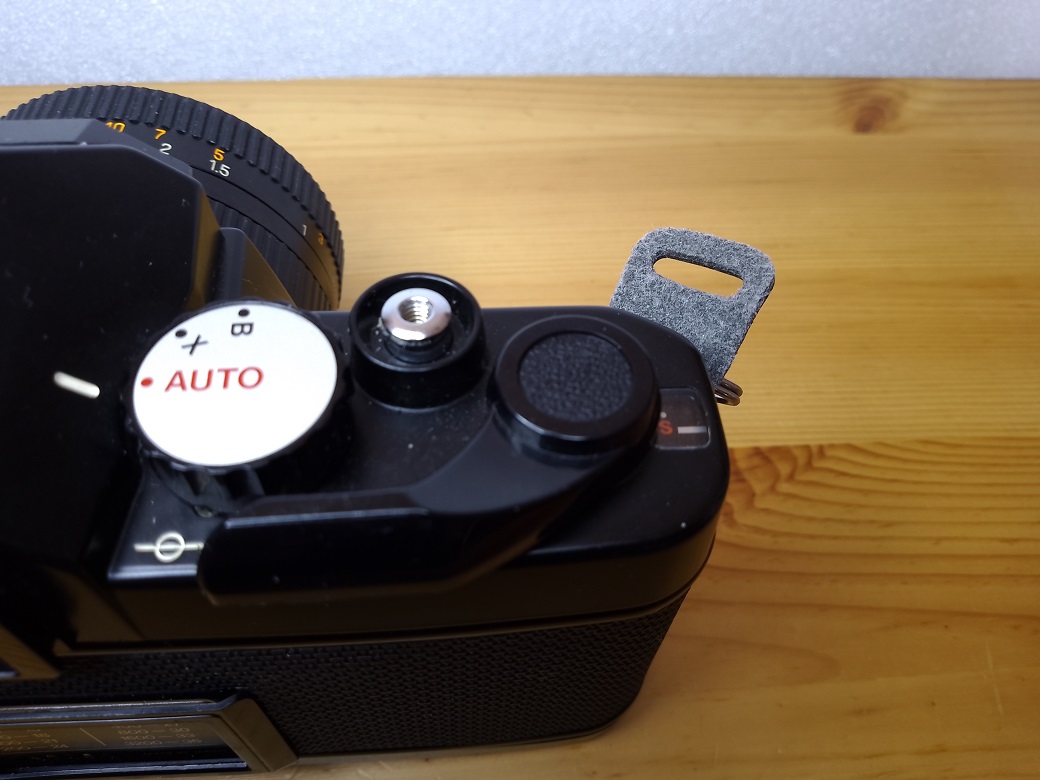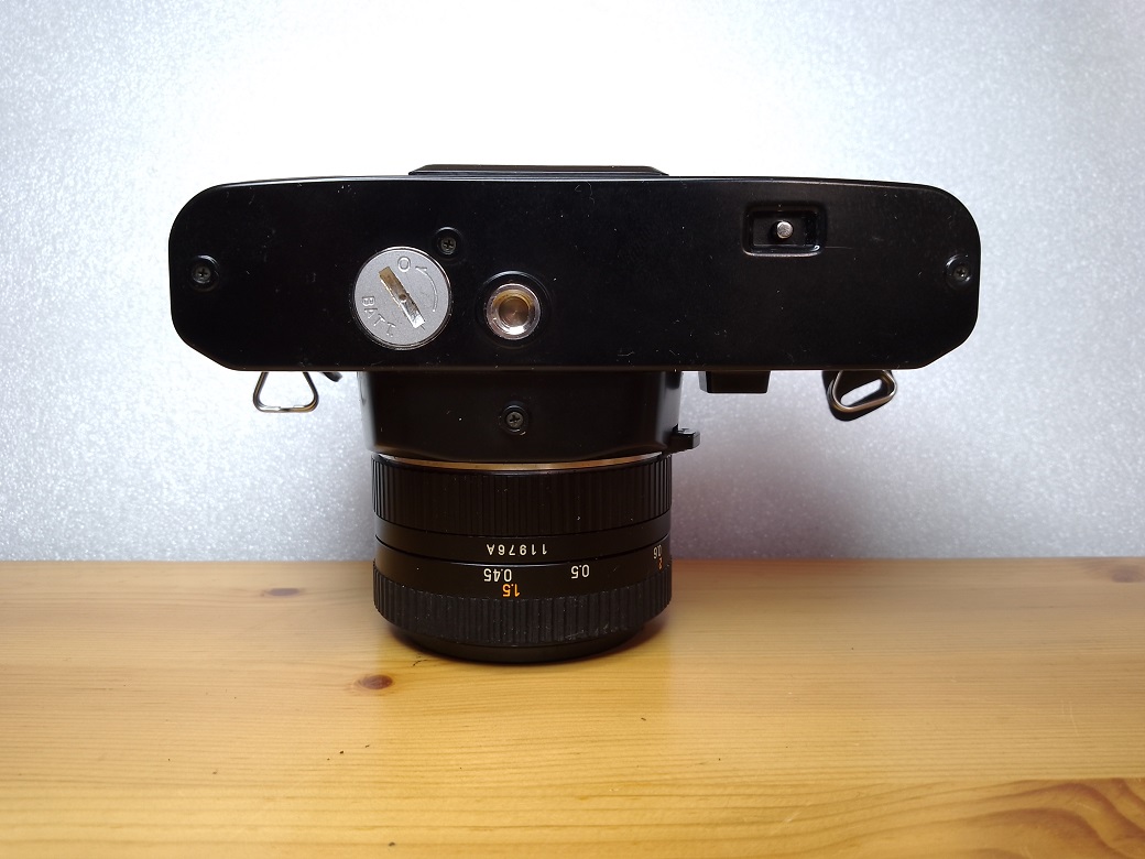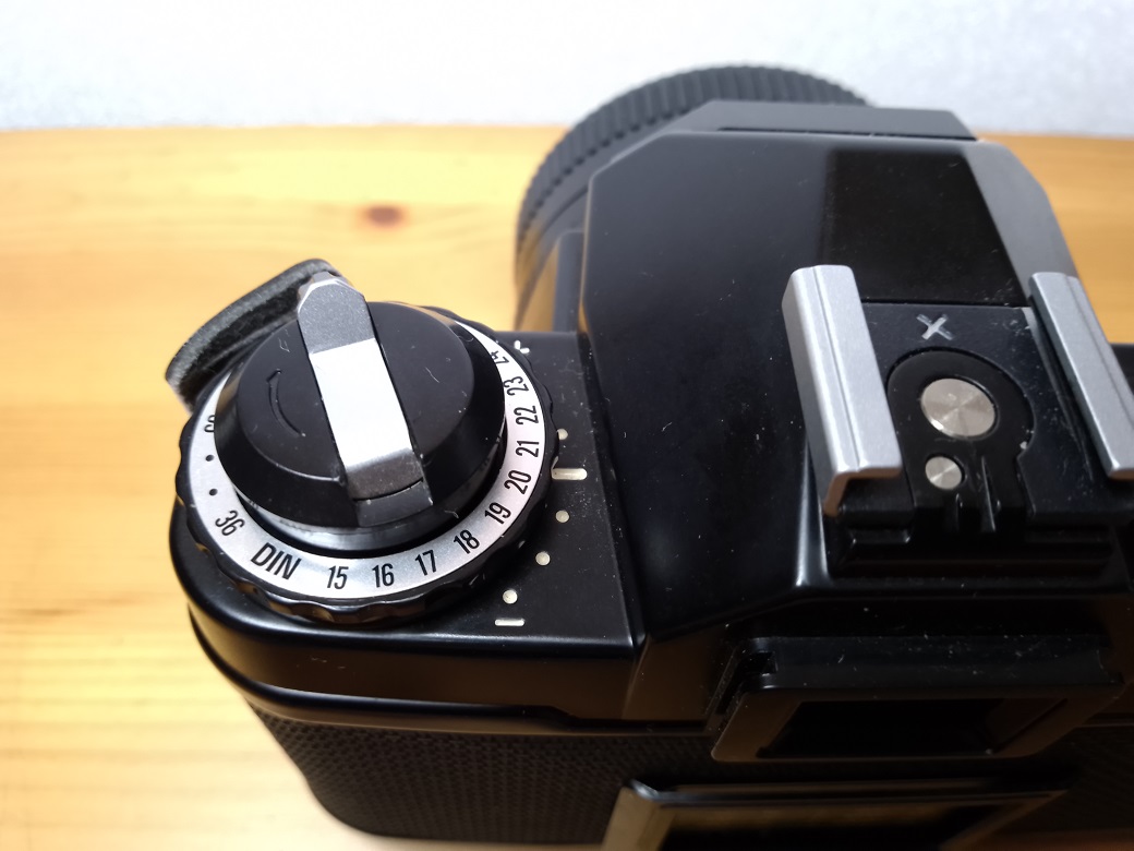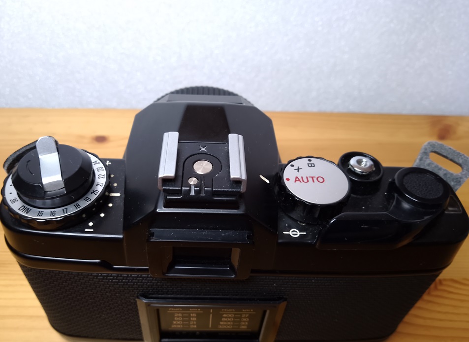 Oberseite: Filmrückspulkurbel (gleichzeitig Entriegelung der Rückwand), darunter Einstellrad für die Filmempfindlichkeit, Blitzschuh mit Mittenkontakt, Einstellrad für "AUTO", "X" und "B", Auslöser mit Drahtauslöseranschluß, Schnellspannhebel, Sichtfenster für das Bildzählwerk