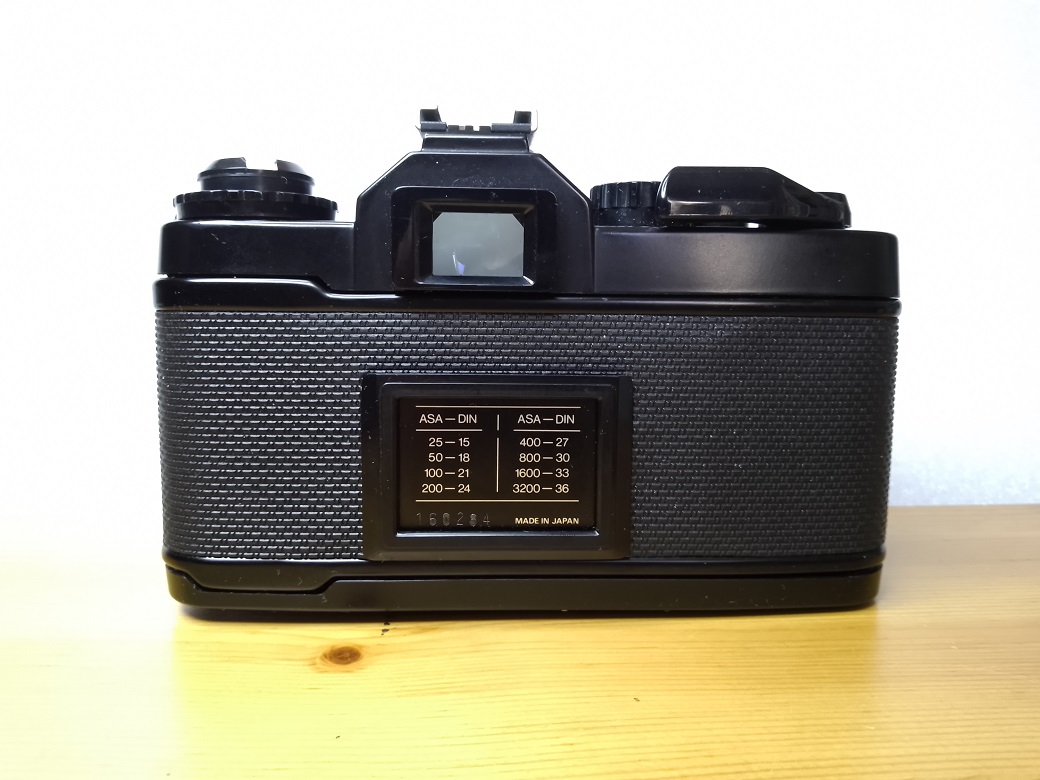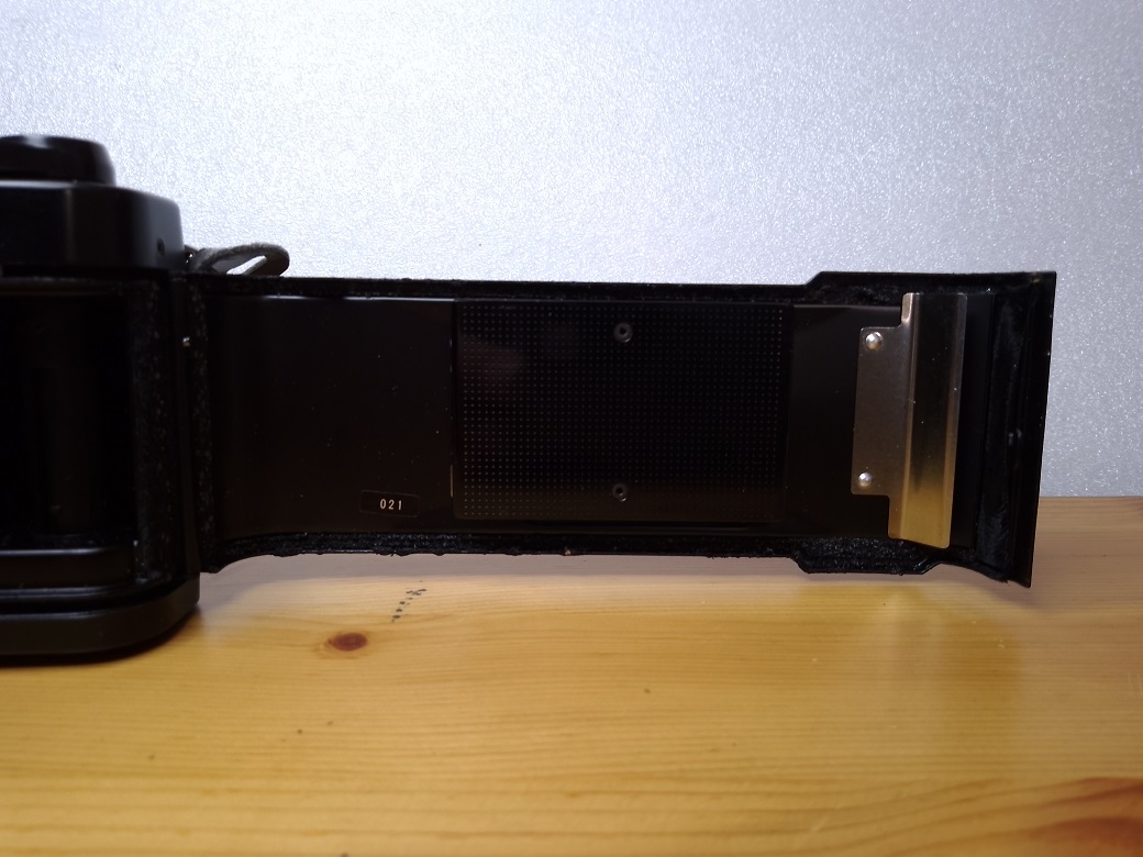 Rückseite: Sucherfenster, klappbare Rückwand mit Filmandruckplatte, Memo-Halter und DIN - ASA Umrechnungstabelle