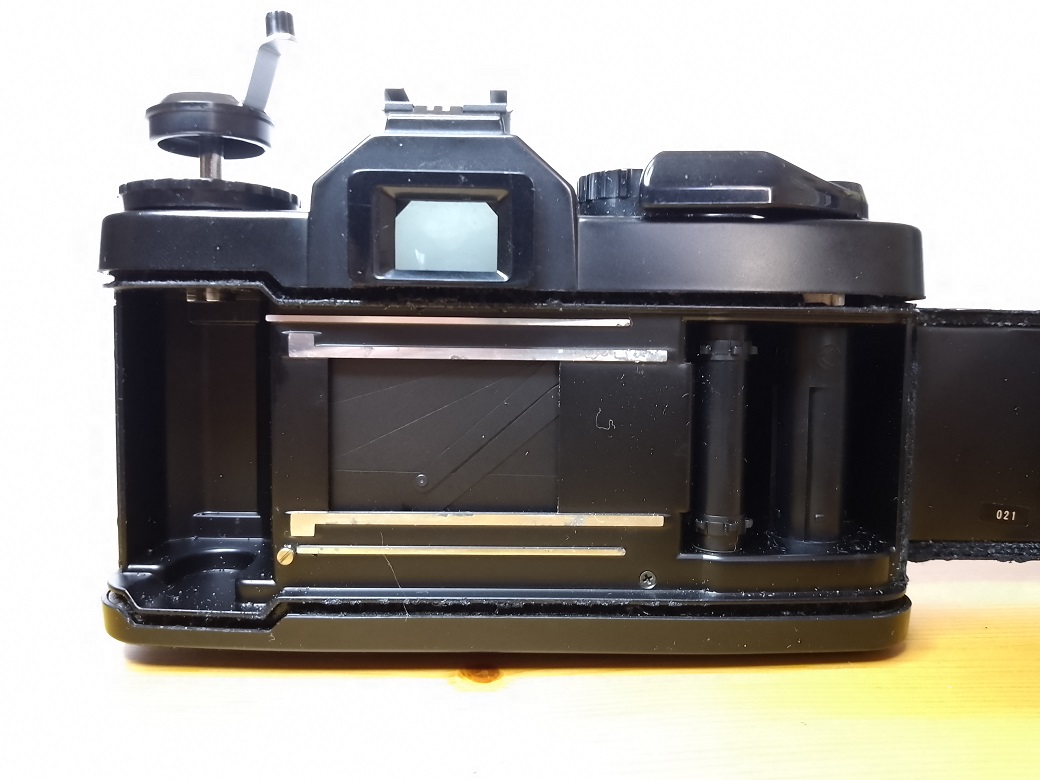 Unterseite: Batteriefach, Stativgewinde, Entsperrknopf für die Filmrückspulung