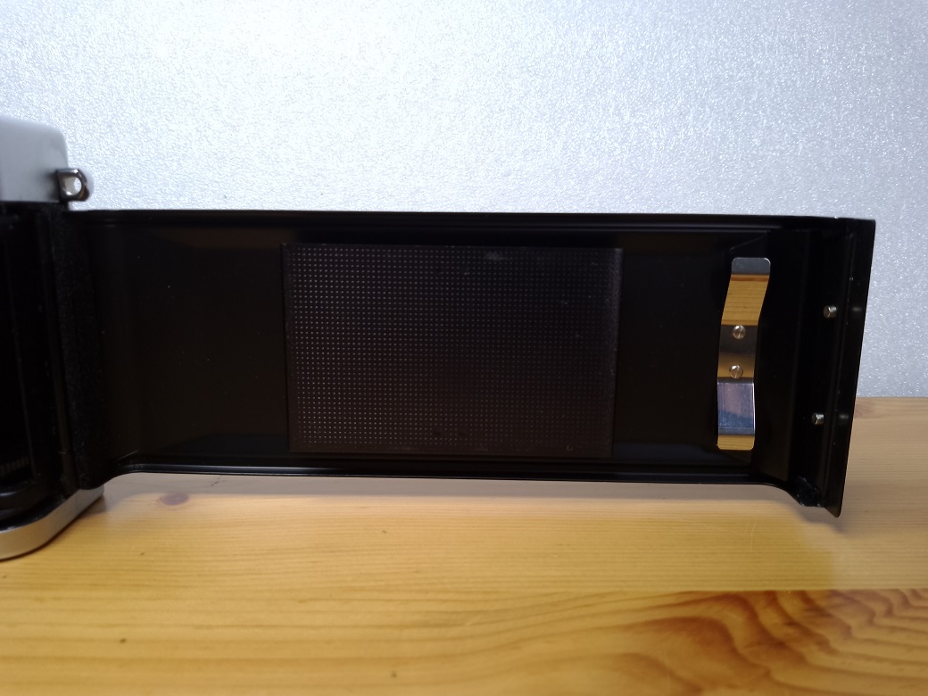 Rückseite: Sucherfenster, klappbare Rückwand mit Filmandruckplatte