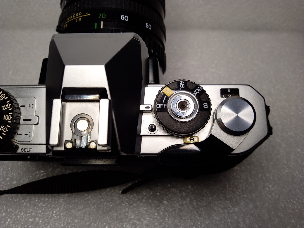 Ungewöhnlich ist die Position des Hebels für den Selbstauslöser unterhalb des Wahlrades für die Filmempfindlichkeit. Der Ablauf der ca. 12 Sekunden Vorlaufzeit wird durch ein (bei der vorgestellten Kamera kaum hörbares) akustisches Signal angezeigt.