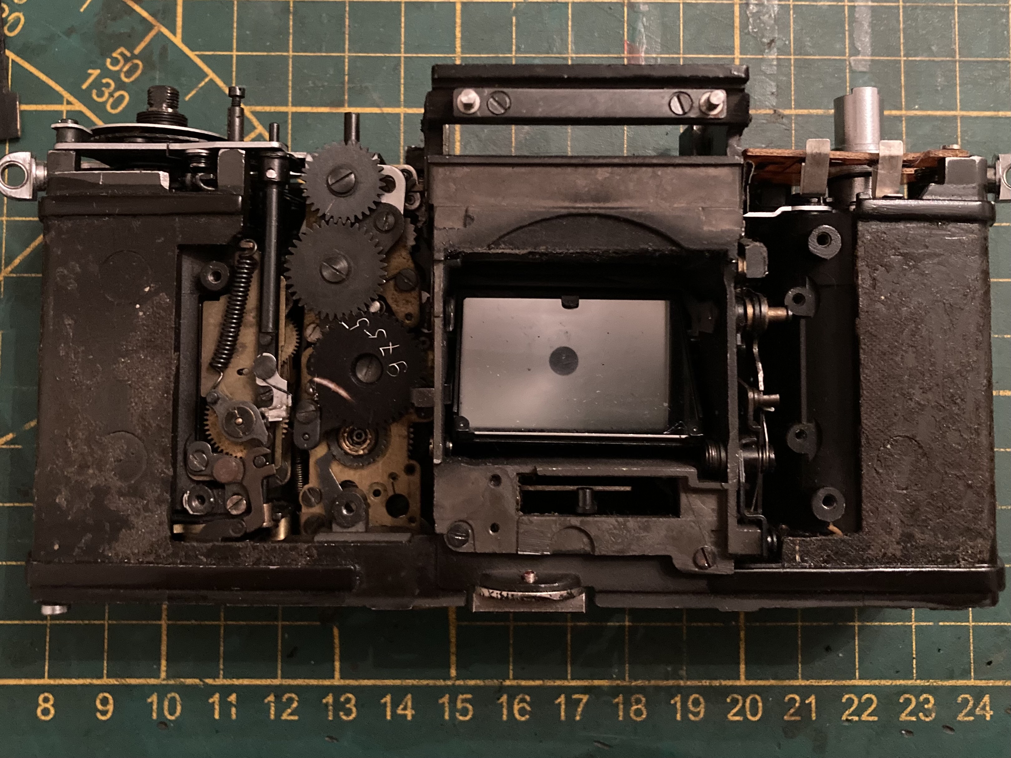 Was genau der ursprüngliche Defekt an der Kamera war konnte ich nach der langen Zeitspanne nicht mehr feststellen also einfach sämtliche Bauteile ordnen, versuchen den ursprünglichen Platz wiederzufinden - Fotodokumentation hatte ich hier natürlich auch vergessen - und dann Stück für Stück die Funktion analysieren, reinigen und montieren. Am Ende entstand da tatsächlich eine funktionierende Kamera und ich war verblüfft dass ich nicht noch länger dafür gebraucht habe, aber sechs Jahre sind ja auch keine schlechte Zeit.