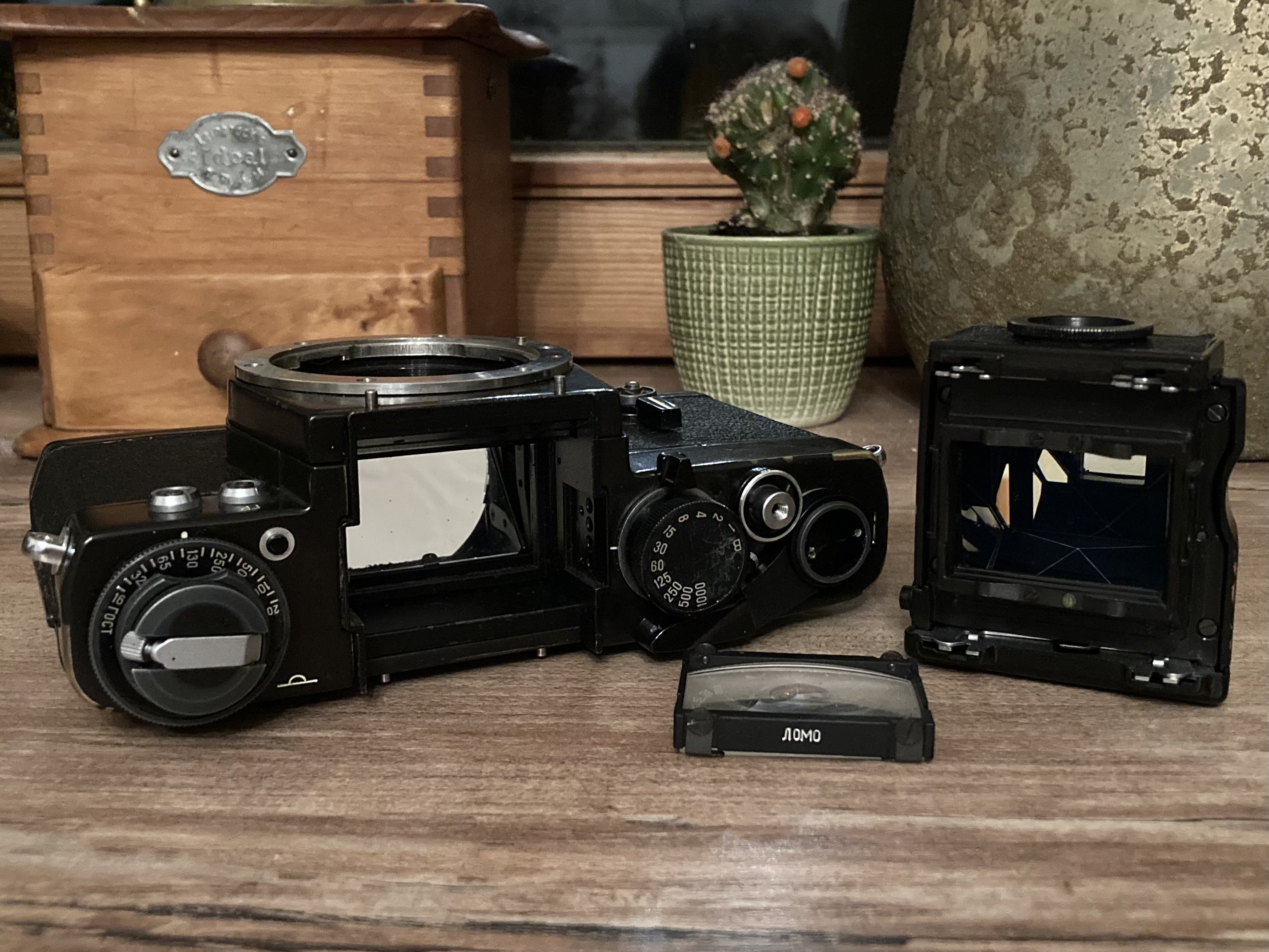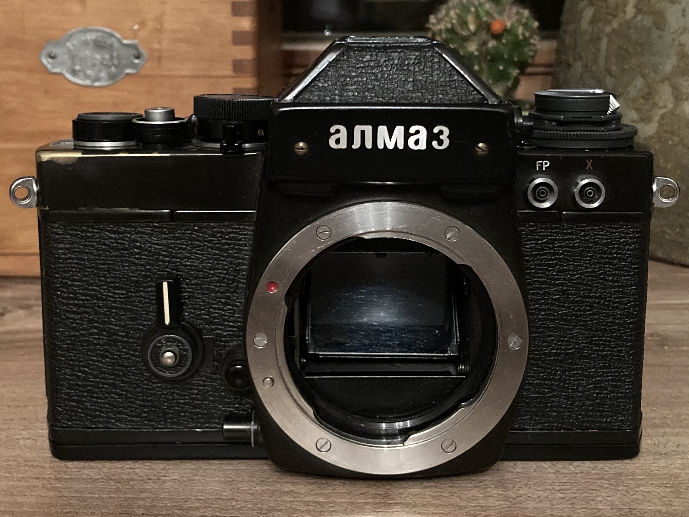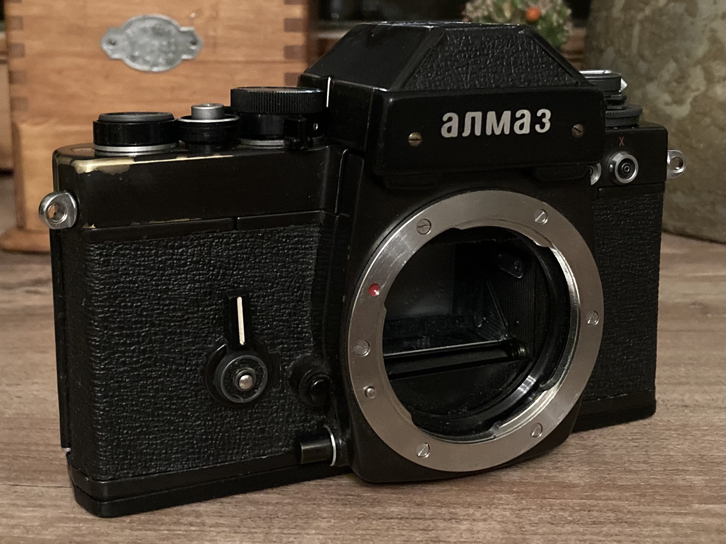 Nun aber zur eigentlichen Kamera: die Almaz 103 entstand in den Jahren 1980-86 bei Lomo in einer (unbestätigten) Stückzahl von 9500, es ist eine vollmechanische Kleinbild-SLR mit Metallschlitzverschluss (B, 1 bis 1/1000), wechselbaren Mattscheiben, wechselbaren Suchereinsätzen und Motoranschluss. So viel zu den gar nicht sooo spektakulären Fakten.