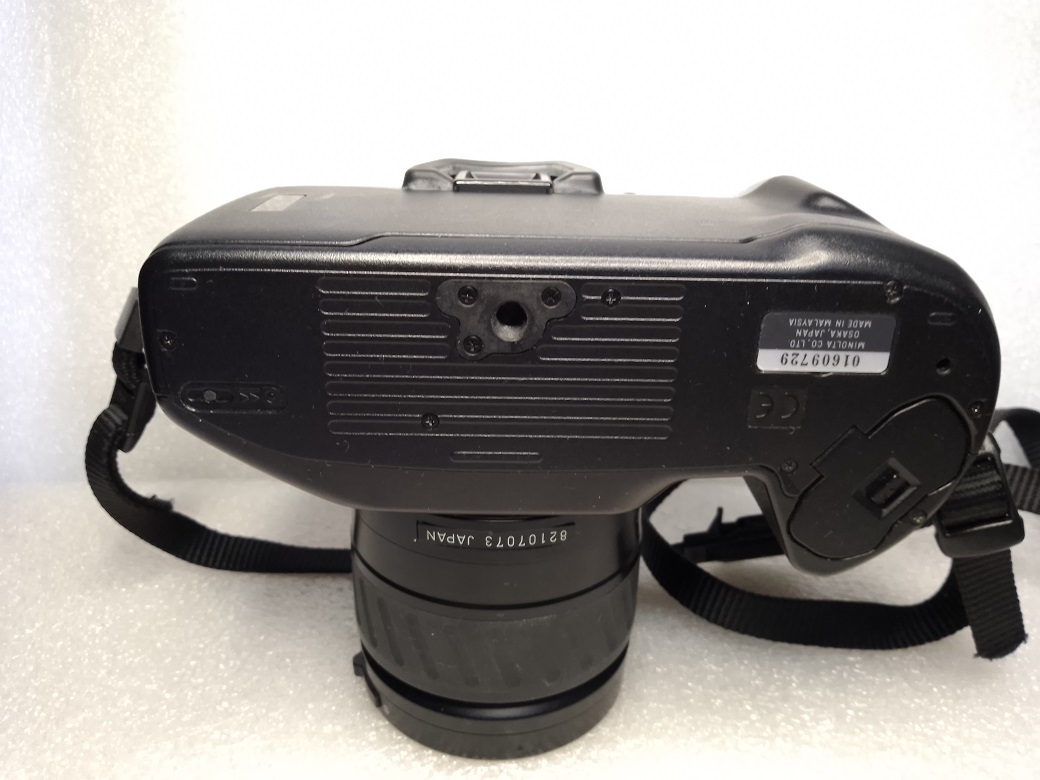 Oberseite: Hauptschalter (LOCK, ON), Wahlschalter Einzelbild- / Serienschaltung sowie Selbstauslöser, Blitzschuh für Minolta Systemblitzgeräte, LCD-Display, "Mode" Taste, Aktivierung / Deaktivierung des eingebauten Blitzes, Taste für "Rote Augen" Reduzierung, Auslöser