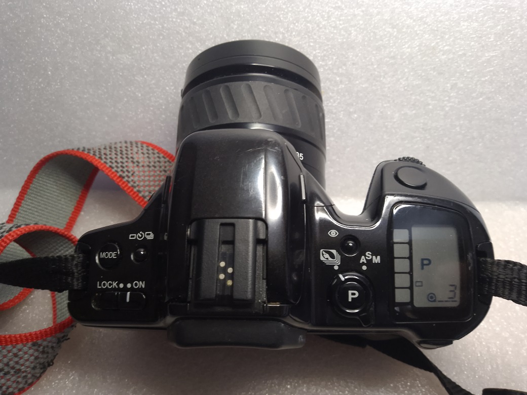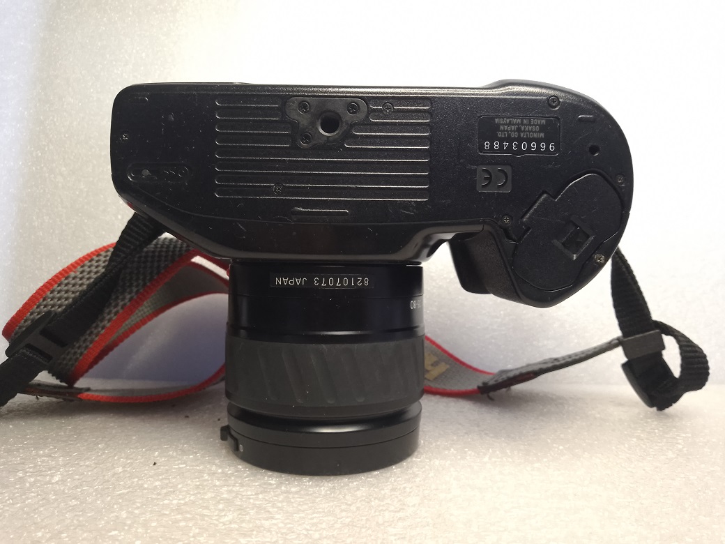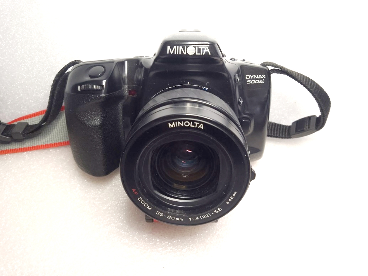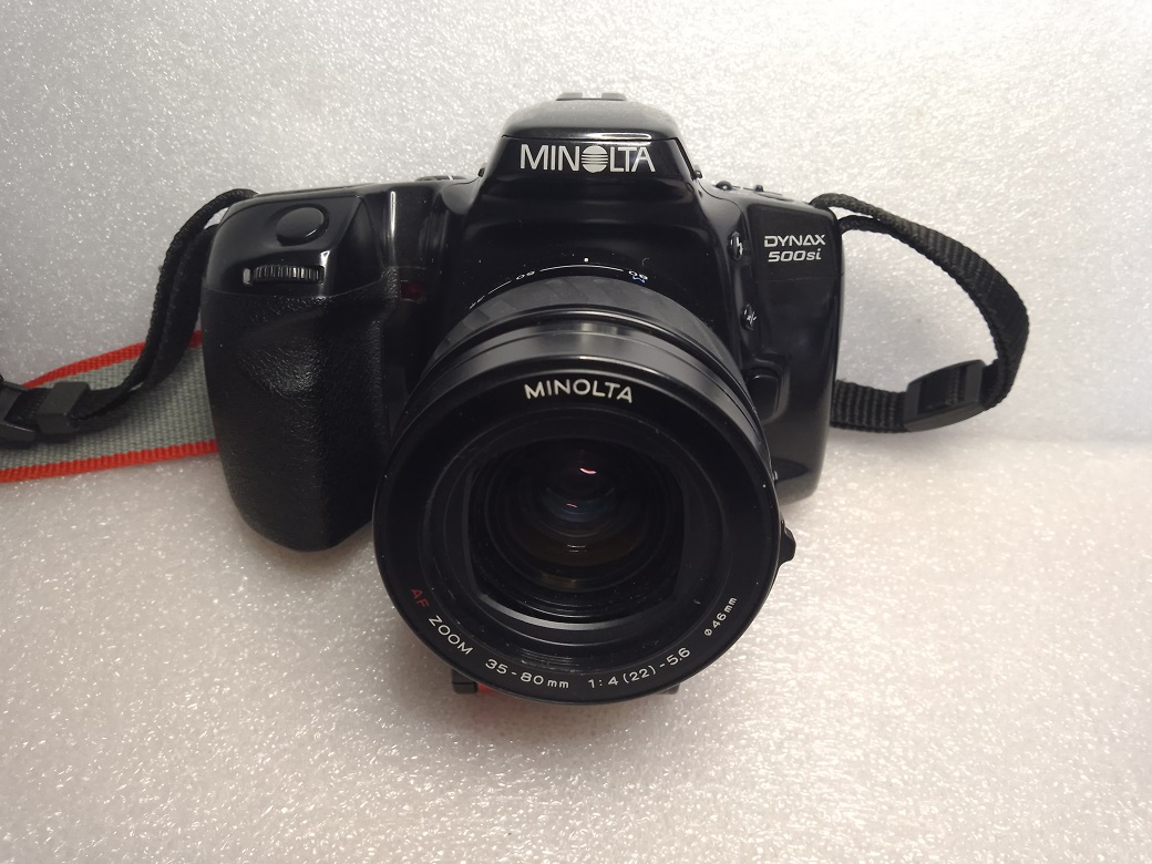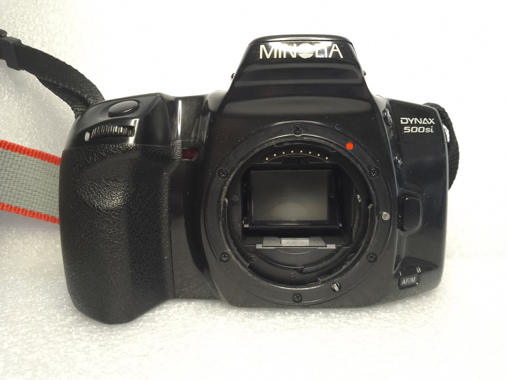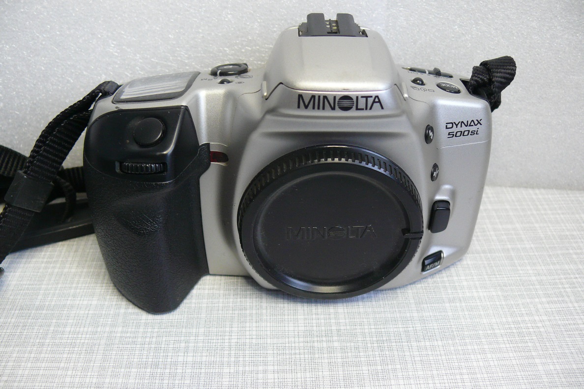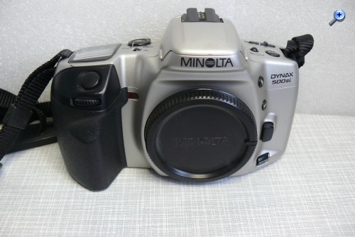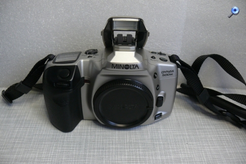 Hersteller: Minolta CO, LTD, Osaka Japan Modell: Minolta Dynax 500si Typ: KB-SLR Kamera mit Programmautomatik und Zusatzmodi, Blenden- / Zeitautomatik und manuellem Modus, 24 x 36 mm, max. 36 Aufnahmen, Filmtransport über eingebautem Motor Baujahr: ab 1994 Seriennummer: 96603488 Bajonett: Minolta AF (Kunststoff) Verschluß: Lamellen Schlitzverschluß, 30 - 1/2000 Sek. X = 1/90 Sek., elektronischer Selbstauslöser mit 10 Sek. Vorlaufzeit, Einzelaufnahmen oder Serienbild mit ca 1 Bild pro Sekunde Blenden: je nach Objektiv Fokussierung: AF (abschaltbar) Filmempfindlichkeit (mit DX-Code): ISO 25 bis ISO 5.000, ohne DX-Code wird ISO 100 eingestellt Stromversorgung: Lithiumbatterie 2CR5 6 Volt Gewicht (ohne Objektiv): 380 Gramm Leitzahl des eingebauten Blitzes: 12