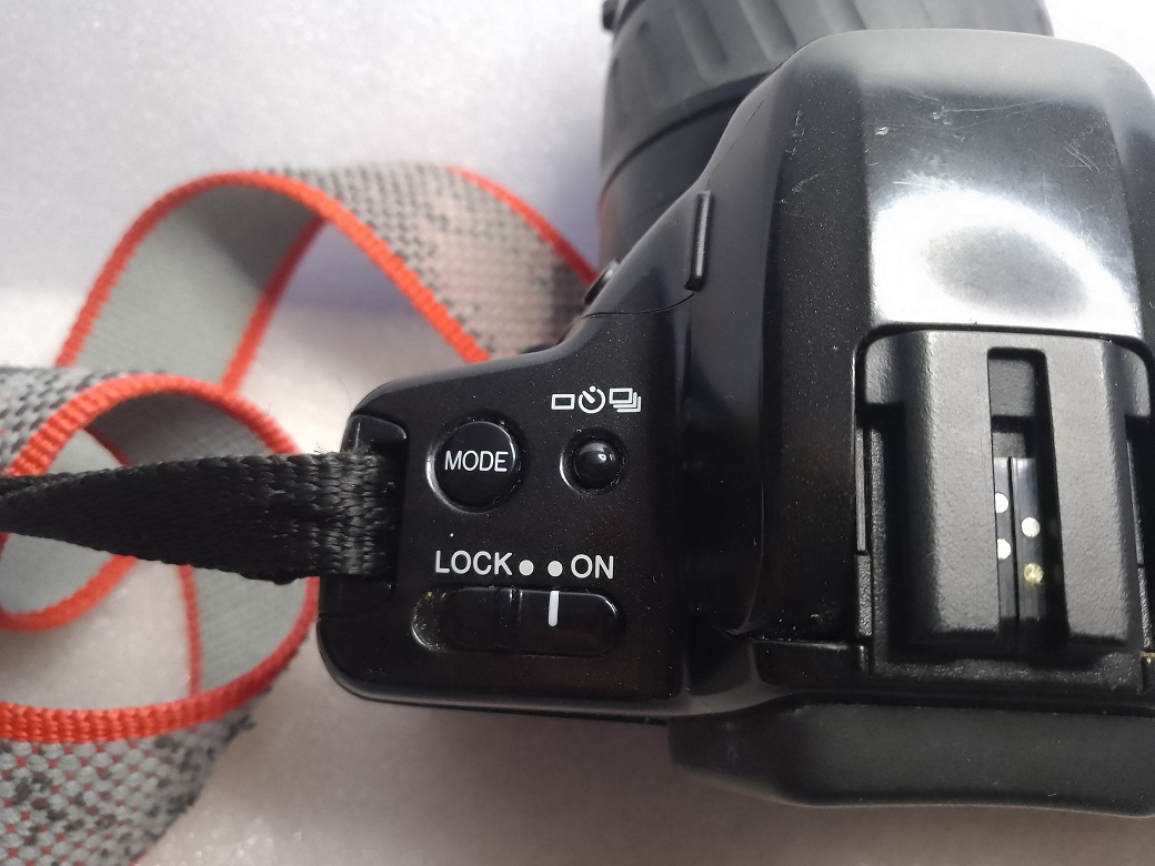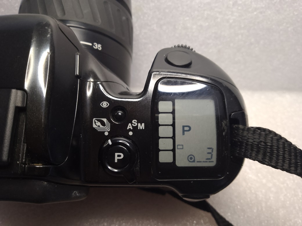 Oberseite: "MODE" Knopf (in Verbindung mit dem Zahnrad auf der rechten Seite zum Anwählen der Zusatzmodi), Wahltaster Einzel- Serienbild, Selbstauslöser, Ein- Ausschalter, Blitzschuh mit Kontakten für einen Systemblitz (darunter klappbarer eingebauter Blitz), Taster für "Rote Augen Reduktion", Wahlschalter für Programmodus, Zusatzmodi oder Blenden- / Zeitmodus und manueller Modus, LCD Display, darüber der Auslöser und das Wahlrad für den Zusatzmodus
