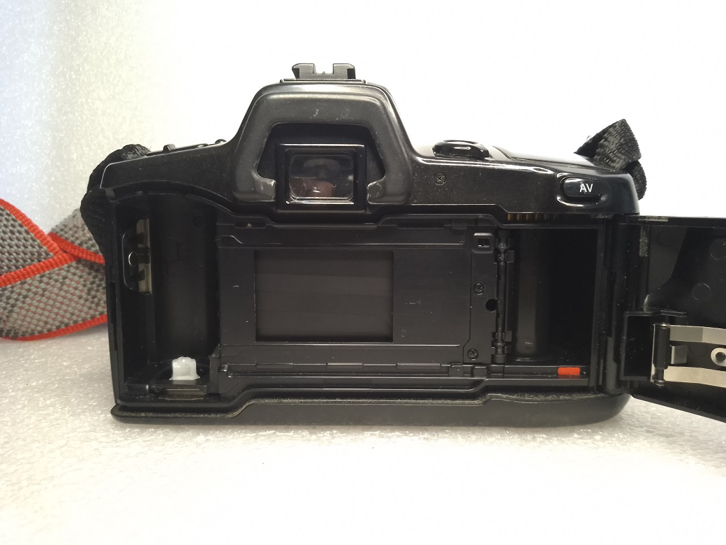 Rückseite: Sucher, Blendenwahltaste (im manuellen Modus) klappbare Rückwand mit Sichtfenster und Filmandruckplatte