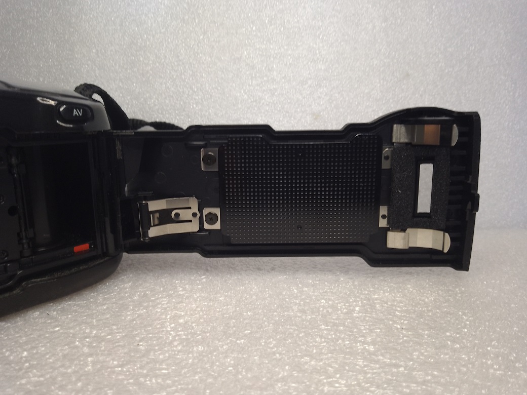 Unterseite: Batteriefach, Seriennummer, Stativgewinde, Taster für die automatische Filmrückspulung