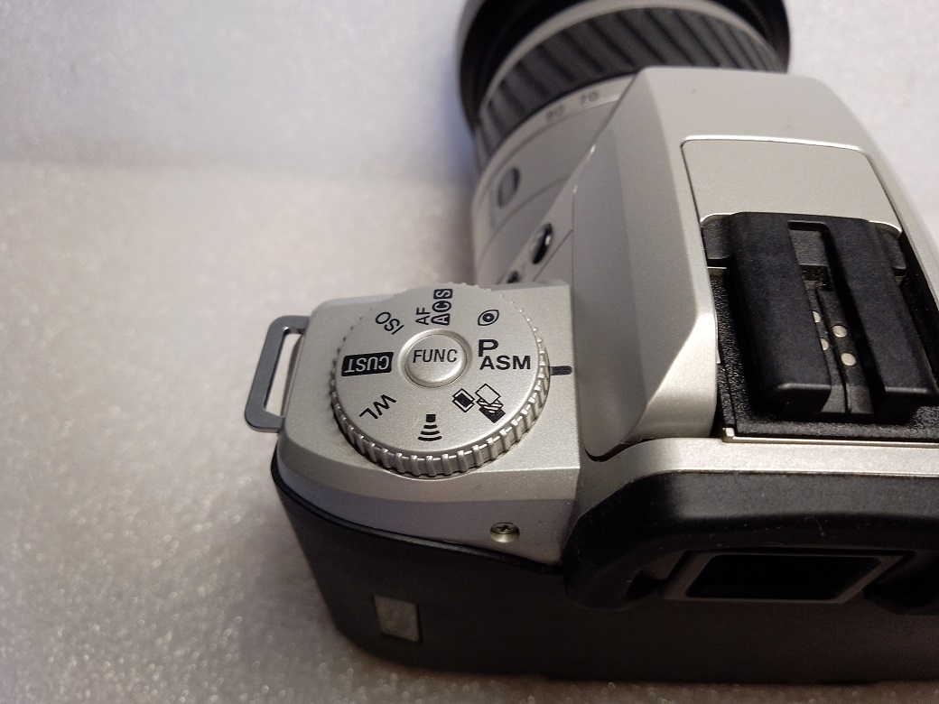 Oberseite: Prorammwahlrad (darin Funktionstaste in Verbindung mit dem Drehrad neben dem Auslöser), Blitzschuh, Display, darüber "P" Resettaste in den Vollprogrammodus, Auslöser, Taste für die Motivprogramme, Taste für den Selbstauslöser